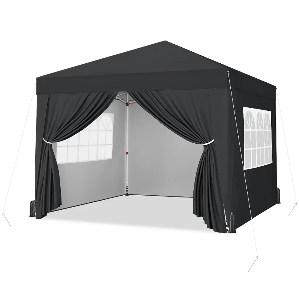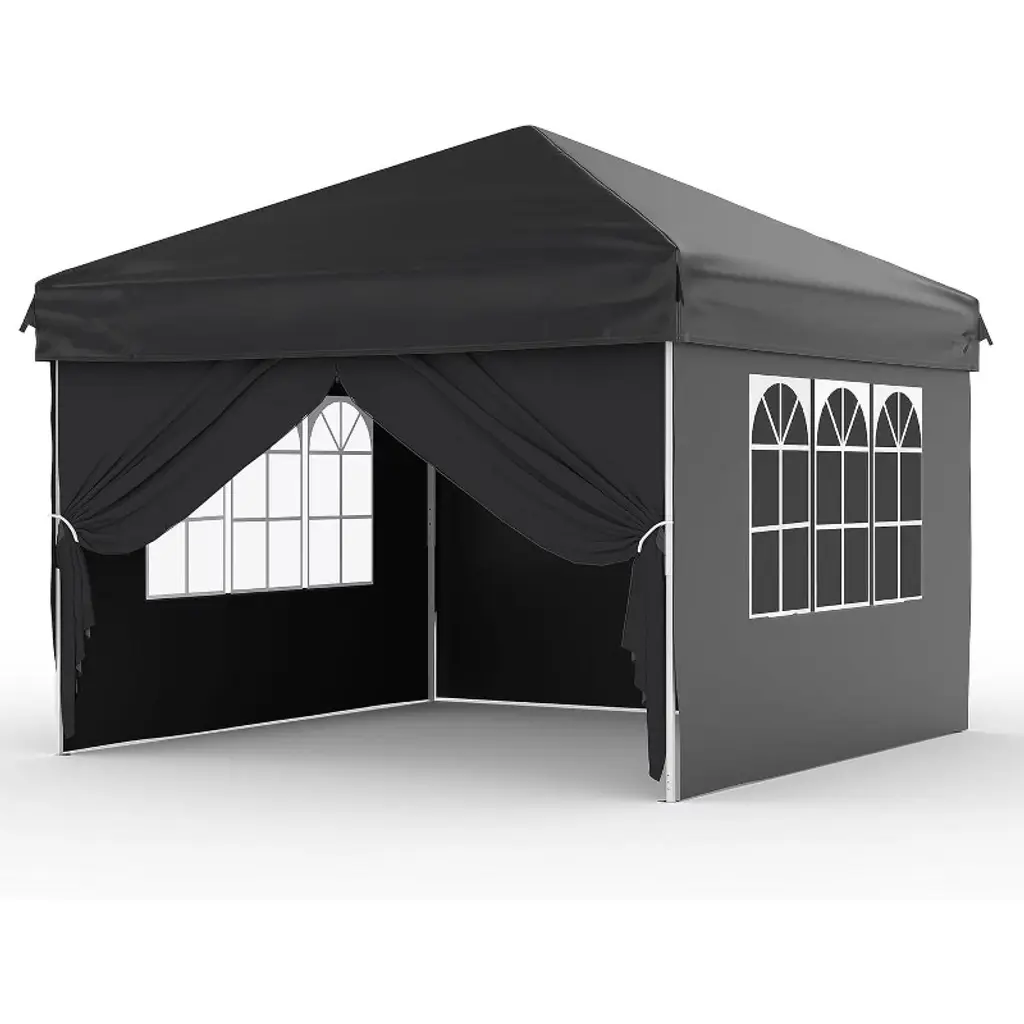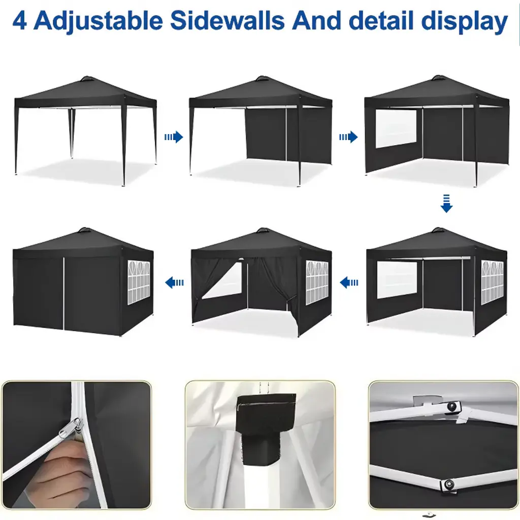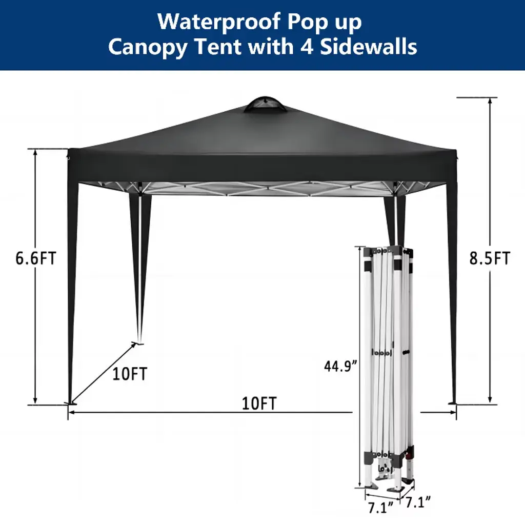 This attractive 10' x 10' SUGIFT Canopy Tent provides the perfect shade solution for outdoor events like camping, parties, and commercial use. Constructed from durable powder-coated steel and high-quality waterproof Oxford fabric, it withstands moderately severe weather conditions. The easy-to-set-up folding design includes a carrying bag for portability, making it perfect for any outdoor activity. The canopy comes with 4 sidewalls, 2 with windows and 2 with zippers, providing versatility, privacy, and protection from the elements. Features Large Space: 10' x 10' x 8.5' tent covers a wide area and is spacious enough for gatherings. Durable Materials: Powder-coated steel framework resists rust, corrosion, and weather damage. Weather Protection: Waterproof top with UPF 50+ blocks 99% of harmful UV rays. Easy Setup: Includes all necessary hardware for quick assembly and stability, even in windy conditions. Portable Design: Folds compactly into a carrying bag for easy storage and transport. Specifications Color: Black Frame Material: Powder-coated alloy steel, plastic Canopy Material: 210D Oxford fabric with PU coating (UPF 50+) Carrying Bag Material: 300D Oxford cloth Adjustable Height: 8.1 - 8.5 FT Packed Dimensions: 8.7 x 8.7 x 46.8 inches Max Dimensions: 10 x 10 x 8.5 FT Package Includes: 1 x 210D Oxford Fabric Canopy Top (Waterproof) 2 x Sidewalls with Windows 2 x Sidewalls with Zippers 1 x Tent Frame 8 x Stakes 4 x Ropes 1 x 300D Oxford Fabric Carry Bag 1 x User Manual