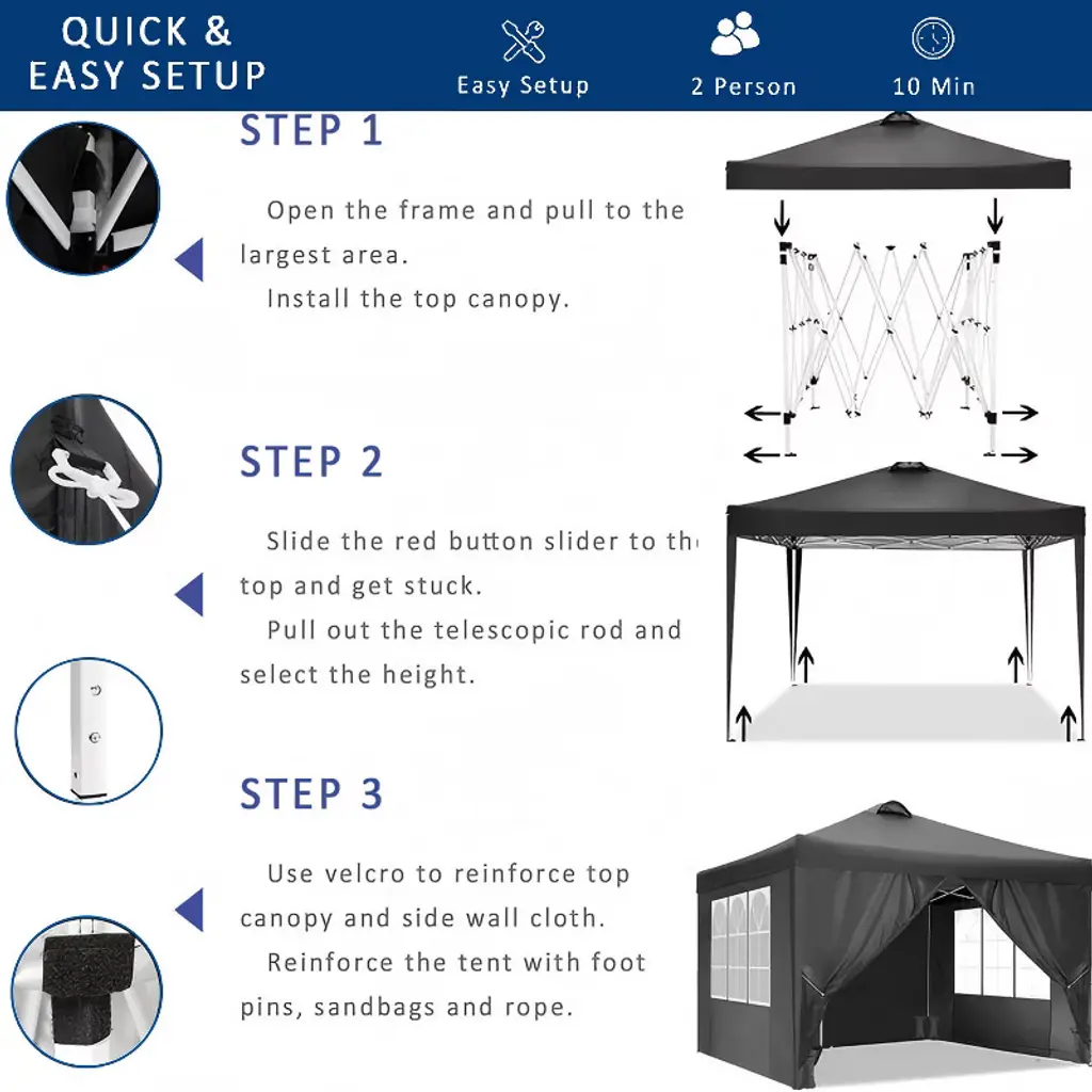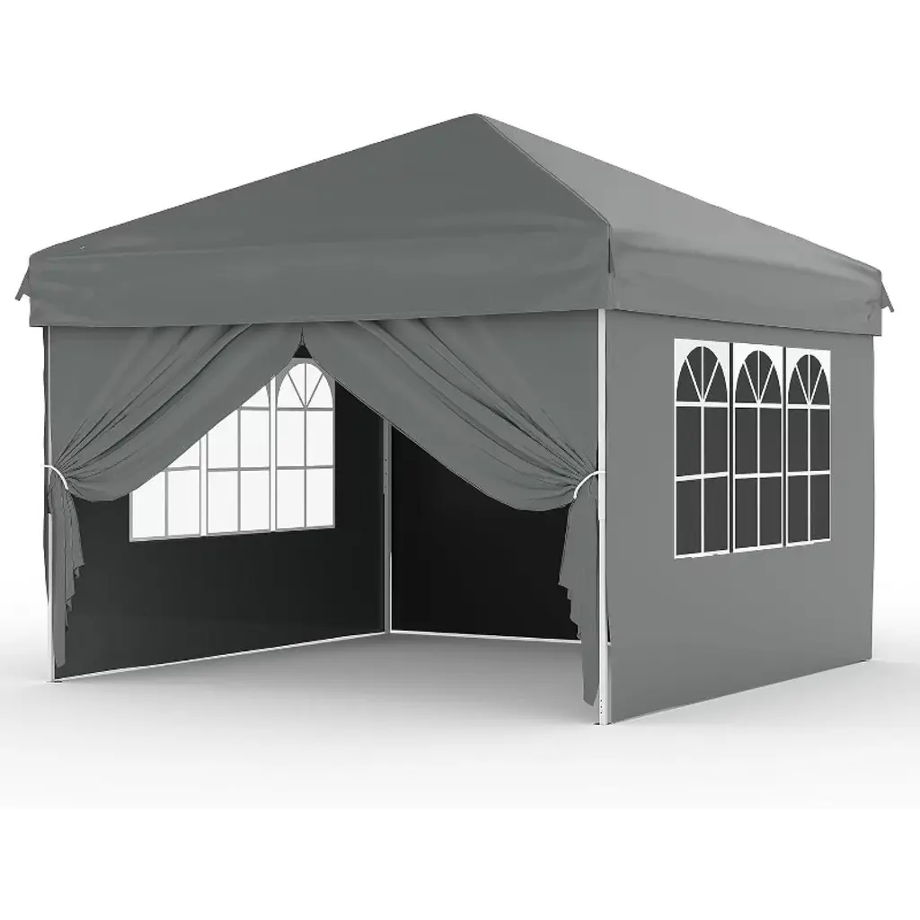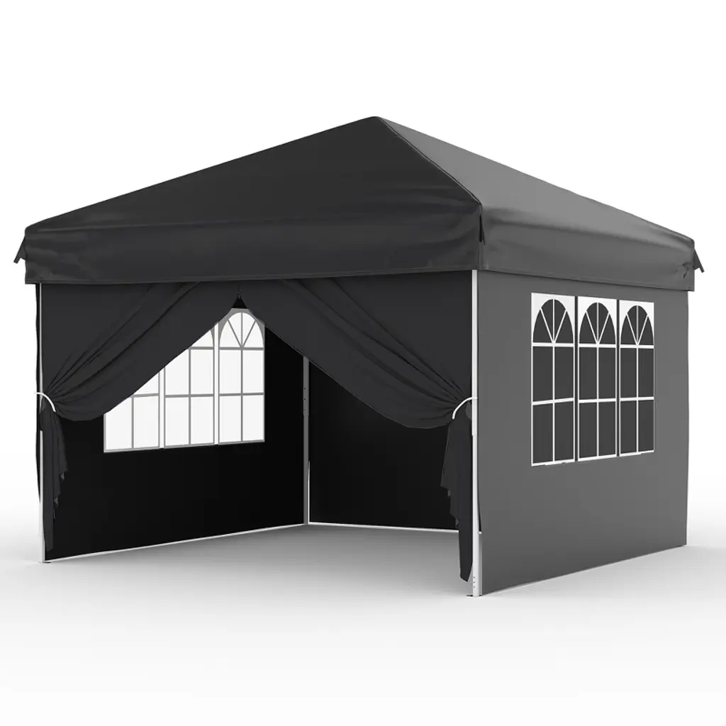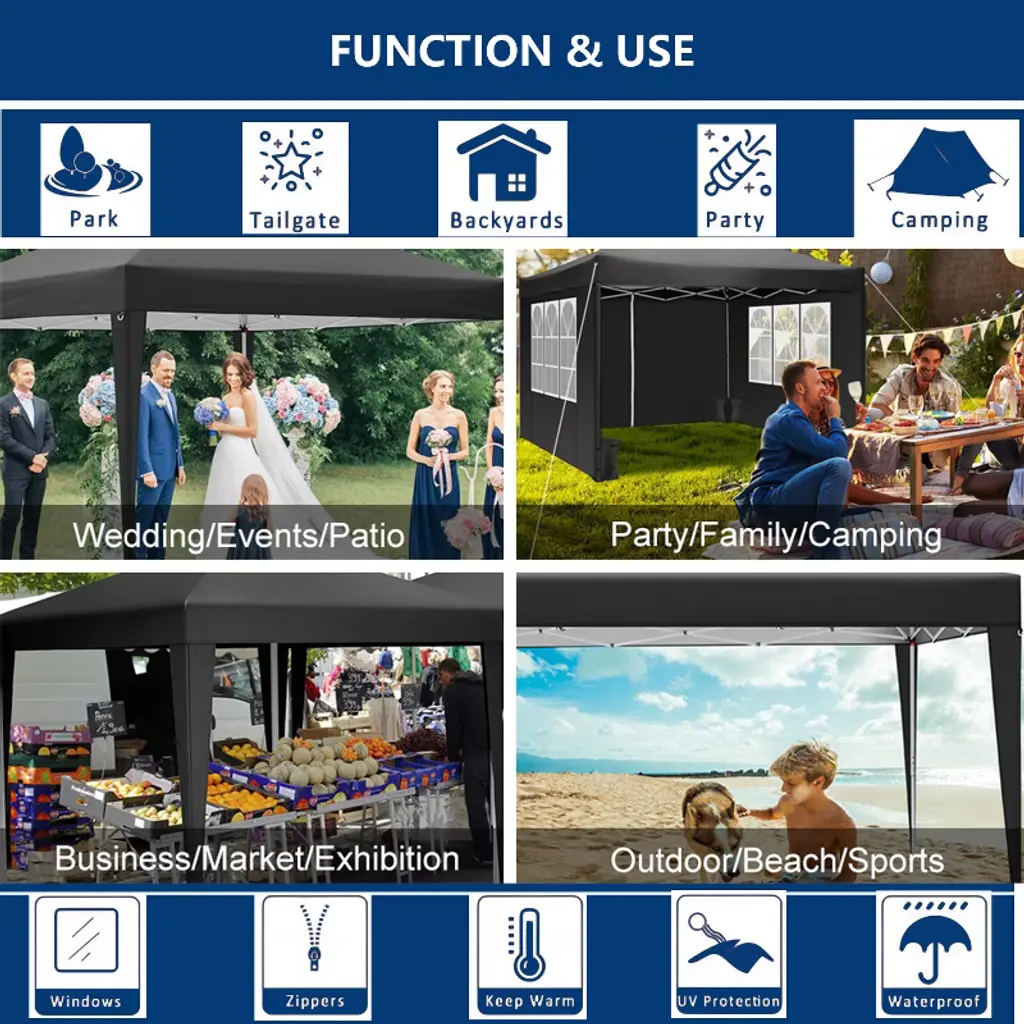 This attractive 10' x 10' SUGIFT Canopy Tent provides the perfect shade solution for outdoor events like camping, parties, and commercial use. Constructed from durable powder-coated steel and high-quality waterproof Oxford fabric, it withstands moderately severe weather conditions. The easy-to-set-up folding design includes a carrying bag for portability, making it perfect for any outdoor activity. The canopy comes with 4 sidewalls, 2 with windows and 2 with zippers, providing versatility, privacy, and protection from the elements. Features Large Space: 10' x 10' x 8.5' tent covers a wide area and is spacious enough for gatherings. Durable Materials: Powder-coated steel framework resists rust, corrosion, and weather damage. Weather Protection: Waterproof top with UPF 50+ blocks 99% of harmful UV rays. Easy Setup: Includes all necessary hardware for quick assembly and stability, even in windy conditions. Portable Design: Folds compactly into a carrying bag for easy storage and transport. Specifications Color: Black Frame Material: Powder-coated alloy steel, plastic Canopy Material: 210D Oxford fabric with PU coating (UPF 50+) Carrying Bag Material: 300D Oxford cloth Adjustable Height: 8.1 - 8.5 FT Packed Dimensions: 8.7 x 8.7 x 46.8 inches Max Dimensions: 10 x 10 x 8.5 FT Package Includes: 1 x 210D Oxford Fabric Canopy Top (Waterproof) 2 x Sidewalls with Windows 2 x Sidewalls with Zippers 1 x Tent Frame 8 x Stakes 4 x Ropes 1 x 300D Oxford Fabric Carry Bag 1 x User Manual
