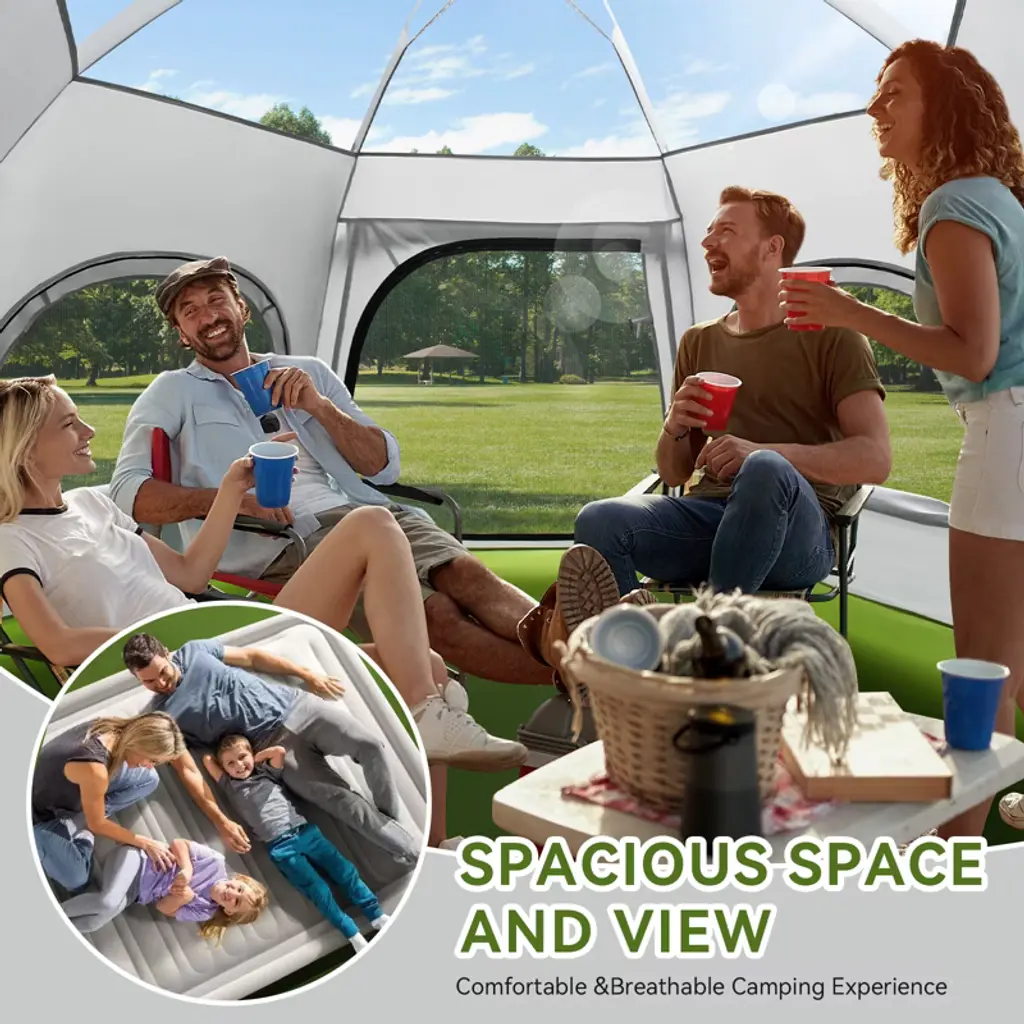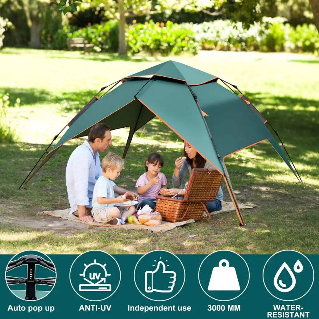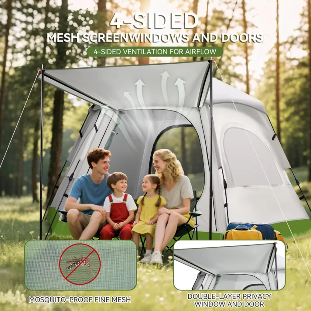 Enjoy roomy comfort and fresh air with this 4-6 person camping tent featuring 4-sided mesh windows for ventilation and bug protection. The durable 210D Oxford fabric with PU2000mm coating resists rain and UV rays. Quick to set up with strong fiberglass poles, it includes a front awning for added shade. Whether you’re camping at the beach, in the mountains, or the backyard, this tent offers space, comfort, and reliable all-weather protection. Specifications Capacity: 4 persons Outer Tent Dimensions: 110.2" × 94.5" × 62.2" (L x W x H) Tent Fabric: 210D Silver-Coated Oxford Cloth Tent Floor: 210D Oxford Cloth Frame: 8.5mm Fiberglass Poles Waterproof Rating: 2000mm with fully taped seams Setup Method: Hydraulic spring-loaded system (instant pop-up)