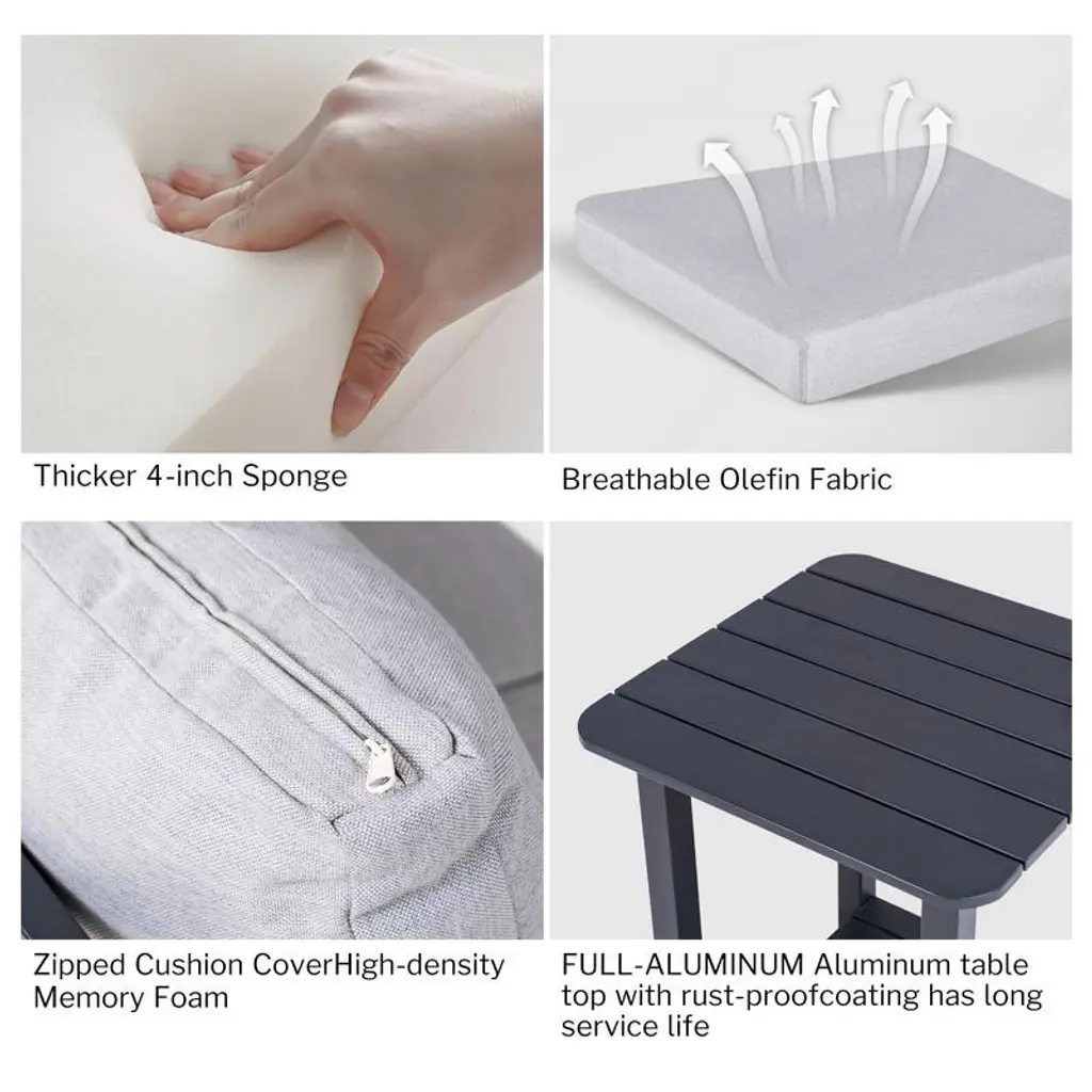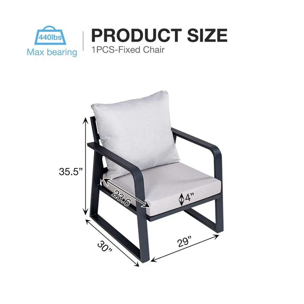 Introducing our Aluminum Patio Single Chair - a perfect blend of style and durability, designed to elevate your outdoor experience throughout the year. Crafted with fashion-forward and premium materials, this set adds a touch of elegance to your patio decor. Making it an ideal choice for sunrooms, gardens, balconies, and poolside areas. Made from high-quality matte black aluminum alloy, it boasts advantages such as sun resistance, waterproofness, rust resistance, insect resistance, and corrosion resistance, surpassing traditional wicker outdoor furniture in durability and aesthetic appeal. The 4-inch thick water-resistant seat cushions and soft back cushions provide a relaxed and comfortable seating experience. Easy to assemble and low maintenance, this set ensures you won't have to worry about cracks, splits, or aging. Create a comfortable and luxurious ambiance, enhancing your outdoor space with our premium aluminum patio conversation set.