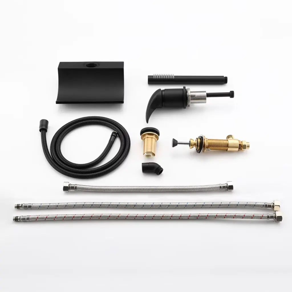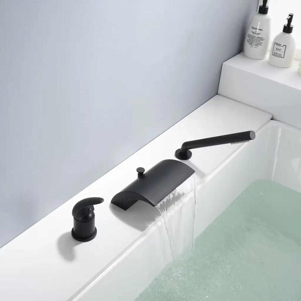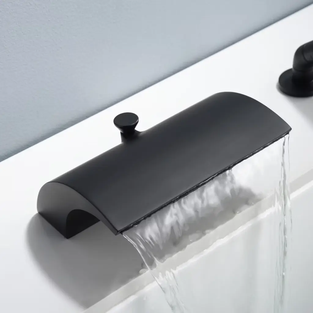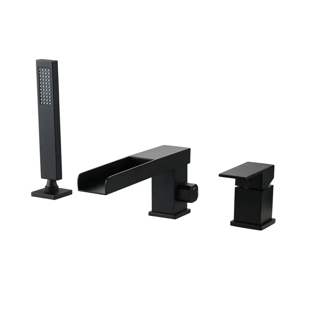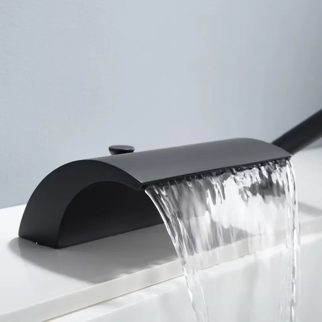 High-quality SUMERAIN waterfall roman tub faucet bring a modern and make the bathroom more elegant, high-class and wide spread spout to make waterfall looks high-tech. High flow can fill up your bathtub in minutes.Simply pull the button up and down at the back of spout to change the water flow to hand shower or spout. This deck mount tub faucet includes a hand shower to enhance your bathing options. With easy-to-clean silicone nozzles allowing you to easily wipe away build-up from hard water and limescale for hassle-free maintenance. An ergonomic single lever handle provides control of water and temperature for an optimal bathing experience. 3 Holes installation, also perfectly for remoding and replacing your old tub faucet. 1.8GPM(6.8L/MIN)hand shower flow rate, product listed in the California CEC modernized appliance efficiency database system and ECPA DOE List, has WaterSense certification and compliant with EPA WaterSense specification for showerheads(version 1.1,July 26,2018). This tub faucet also has ICC-ES PMG certification and is compliant with standard: ASME A112.18.1/CSA B125.1-2018, plumbing supply fittings(the same standard as cUPC certification). Model: S2138W-MG-TAProduct Name: Waterfall Roman Tub FaucetMaterial: Brass and Stainless SteelFinish: Matte BlackFlow Rate: 9.59GPM @ 60PSI Welcome to SUMERAIN! We are dedicated to showcasing our proficiency and unwavering dedication in crafting superior faucets. Our team of talented designers and engineers exert relentless efforts to conceive groundbreaking and aesthetically pleasing faucets that flawlessly amalgamate style and practicality.From sleek and modern designs to classic and timeless styles, we offer a wide range of options to suit various preferences and interior design themes.. We believe that every customer deserves a faucet that not only performs flawlessly but also adds a touch of elegance to their space. About this item specificities 1. Black tub faucet with high flow tub spout(9.59GPM at 60PSI), it can fill up your bathtub in minutes. 2. Do you want to rinsing off, but your current tub just has 3 holes and no hand shower? This 3 hole roman tub faucet solve your problem! The brass handheld shower with 59 inches hose for rinsing off after bath, also perfectly for bathing children or pets. The brass hand shower with inclined angle helps to prevent the wet damage to your wooden floor which caused by the dropping water from hand shower.3.Tub faucet set with diverter at the back of waterfall spout, simply pull the button up and down at the back of spout to change the water flow to hand shower or spout. 4.Roman tub faucet matte black finish will resist rust and corrosion through everyday use.5.Bath tub faucet with solid brass faucet body and valve, lead-free brass construction. Ceramic disc catridge ensures durable leak free performance for a life time.