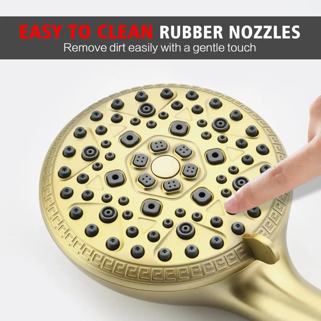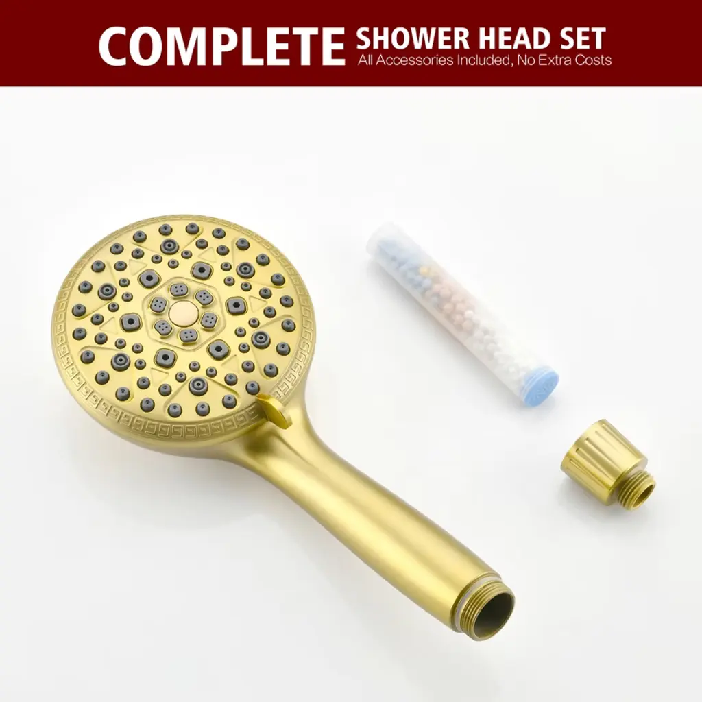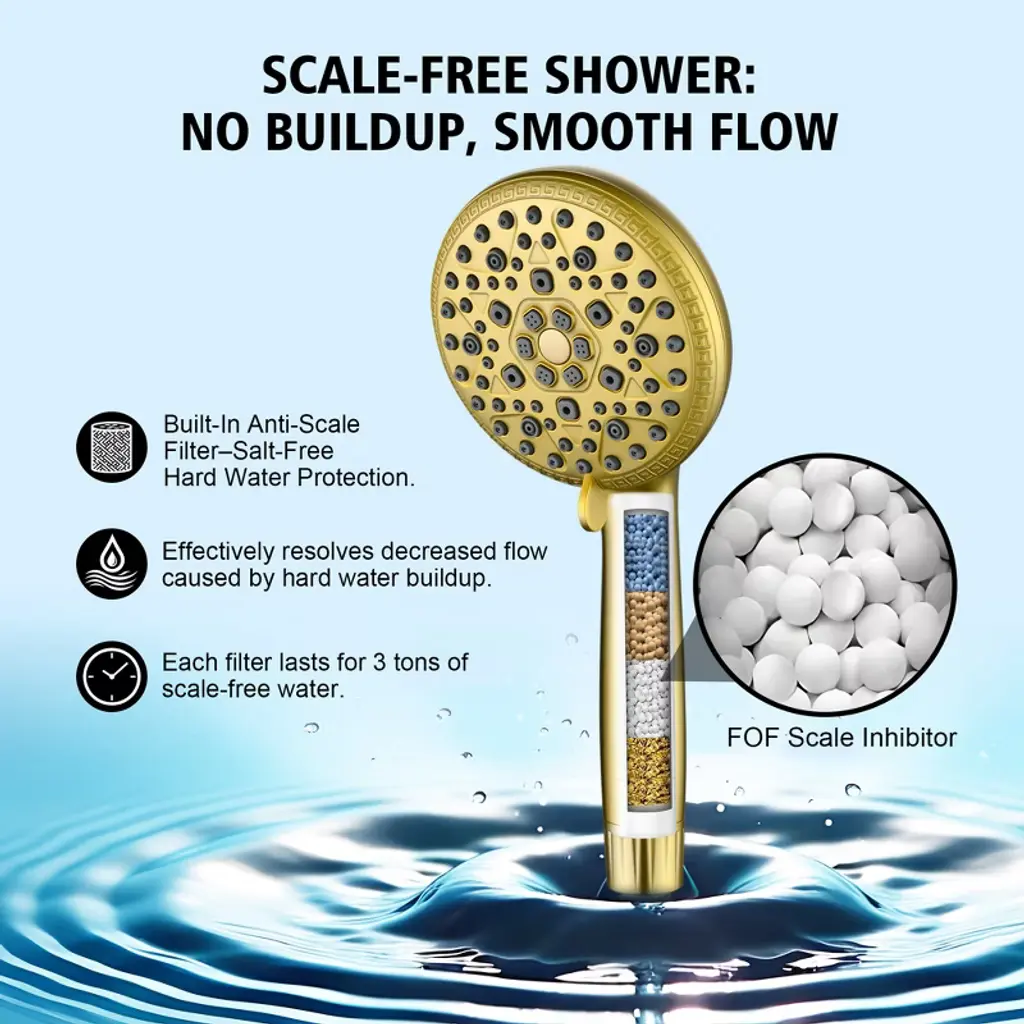 Upgrade your daily routine with this multi-functional filtered handheld shower head engineered for wellness-focused homes. The advanced 4-stage filtration system actively removes harsh chemicals - chlorine elimination protects sensitive skin while anti-scale filtration preserves plumbing systems. Choose from 9 spray settings including mist/massage modes, plus industrial-strength Rush Clean mode perfect for pet bathing or deep-cleaning tasks. Our filter hand shower can effortless filter replacement in under a minute - each long-lasting cartridge purifies 3,000 gallons (6-9 month usage). Constructed with food-grade ABS plastic and flexible silicone nozzles, this filter handheld shower sprayer resists scale buildup and maintains steady water pressure. Model: S4368U-BGProduct Name: Handheld Shower witH FilterMaterial: ABSFinish: Brushed Gold Welcome to SUMERAIN! We take pride in our expertise and commitment to producing top-of-the-line faucets, our team of skilled designers and engineers work tirelessly to create innovative and visually appealing faucets that seamlessly blend form and function. From sleek and modern designs to classic and timeless styles, we offer a wide range of options to suit various preferences and interior design themes. We believe that every customer deserves a faucet that not only performs flawlessly but also adds a touch of elegance to their space. About this item specificities 1.FOF Tech Stops Hard Water Clogs Salt-free scale prevention blocks 99% mineral buildup in hard water areas(Specially in AZ/TX/CA), maintaining strong water flow for 3 tons (vs. 1 ton in standard shower heads with filters). 2. Chlorine Removal + Skin-Soothing VC Calcium sulfite & KDF-55 filter neutralize harsh chlorine, while Vitamin C beads release antioxidants to combat dry, itchy skin after hard water showers.3.3-Month Filter with Easy Swap No tools needed – replace filter every 90 days. 1 filter = 750+ showers, saving 50% vs. monthly replacement products.4.Rush Clean Spray + 8 Settings Modes Rush Clean Spray scrubs toilet/bathtubs/tiles-clear soap scum 50% faster, plus mist/massage/spray/ trickle modes. 5.pH-Balanced Water for Healthier Skin & Hair Advanced filter system softens hard water while retaining natural minerals, leaving skin hydrated and hair noticeably softer after every shower.