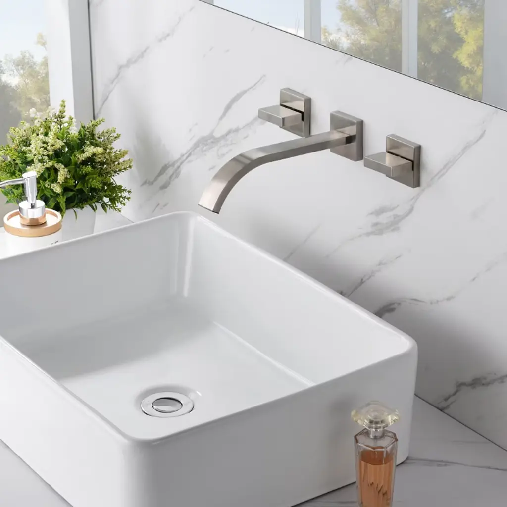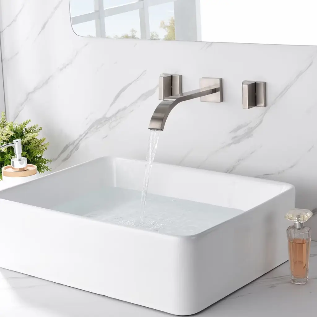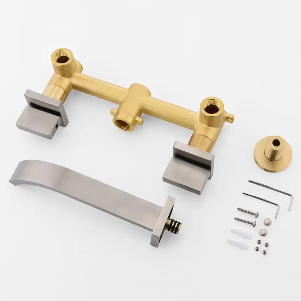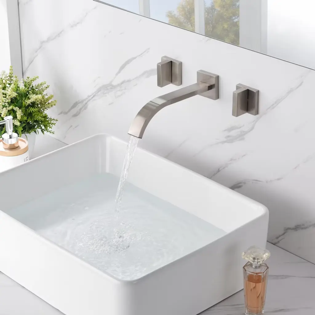 Crafted in solid brass, the sumerain Wall Mount Bathroom Faucet stands the test of time and makes a dramatic effect paired with your bathroom sink. Its sleek, modern design elevates any bathroom and leaves the countertop cleared for a more contemporary look. Water flows through small rectangular holes in faucet spout, creating a waterfall effect when water is running. This bathroom faucet listed in the California CEC modernized appliance efficiency database system, and also in the ECPA Department of Energy (DOE) qualified list. The rough in valve is ICC-ES PMG certified by ICC-ES in 2023, standard:ASME A112.18.1/CSA B125.1-2018, plumbing supply fittings(the same standard as cUPC), Lead Free certificated and compliant with standard:NSF/ANSI/CAN 372-2022 drinking water system components - lead content. It is certified under standard:NSF/ANSI/CAN 61-2022 drinking water system components - health effects. Model:S1392NI-TAProduct Name:Wall Mount Lavatory FaucetFinish:Brushed NickelMaterial:Brass Welcome to SUMERAIN! We are dedicated to showcasing our proficiency and unwavering dedication in crafting superior faucets. Our team of talented designers and engineers exert relentless efforts to conceive groundbreaking and aesthetically pleasing faucets that flawlessly amalgamate style and practicality.From sleek and modern designs to classic and timeless styles, we offer a wide range of options to suit various preferences and interior design themes. We believe that every customer deserves a faucet that not only performs flawlessly but also adds a touch of elegance to their space. About this item specificities 1. Wall mount lavatory faucet body constructed of solid brass.2. Brushed nickel finish will resist corrosion and tarnishing through everyday use.3. Double handles. Low-wear ceramic cartridge.4. Rough-in valve included.5. To save time and extra expense, please show your plumber the installation video on product page before installation and please keep the user manual properly for the future need.