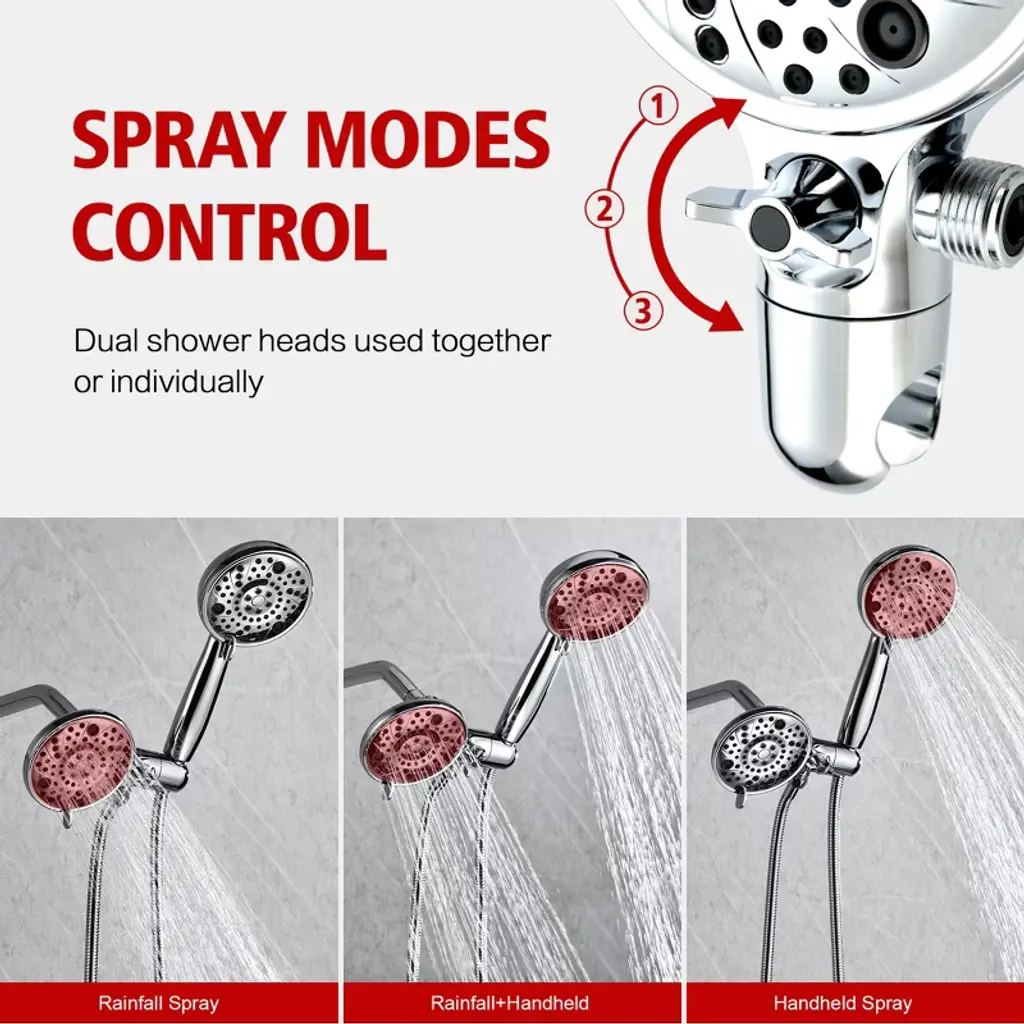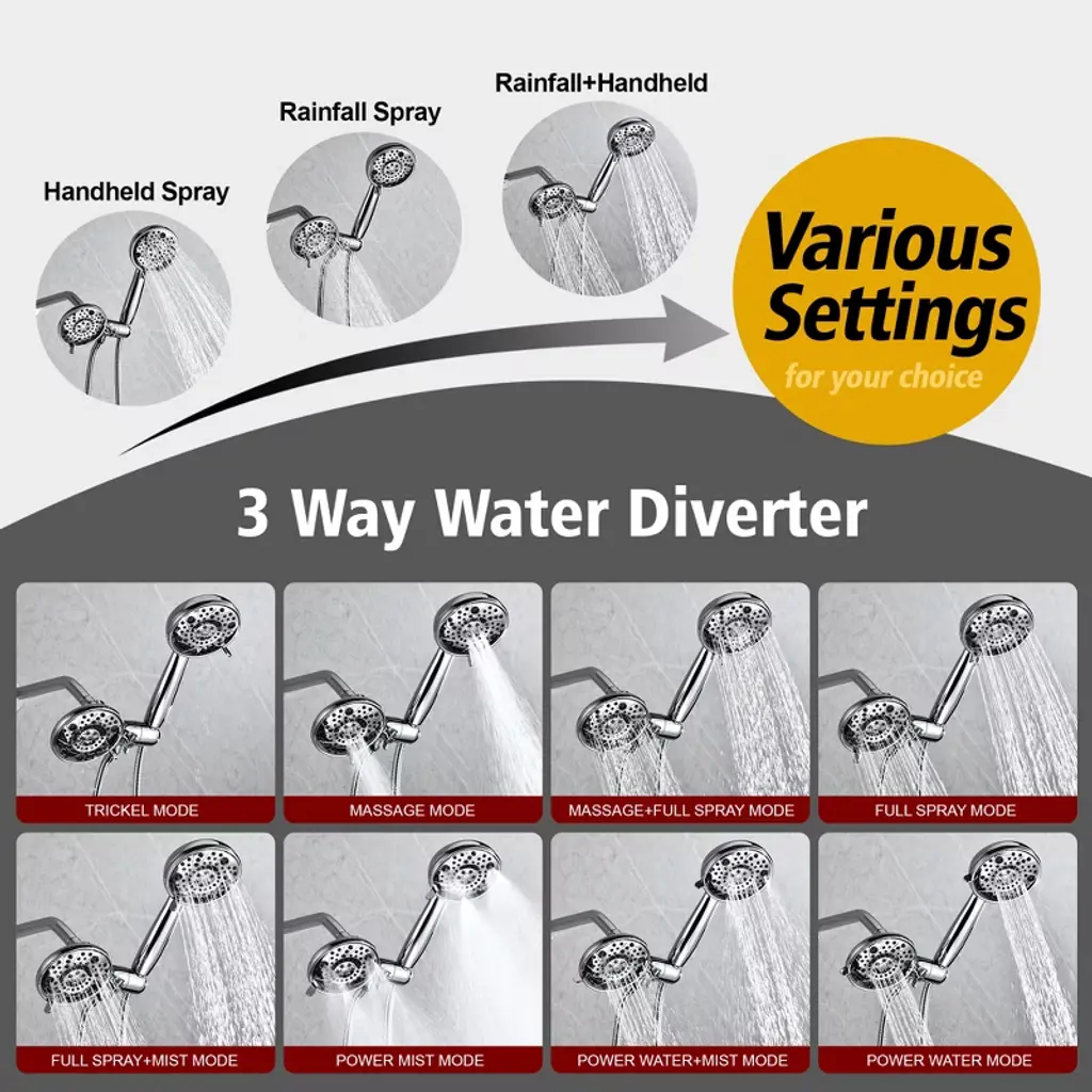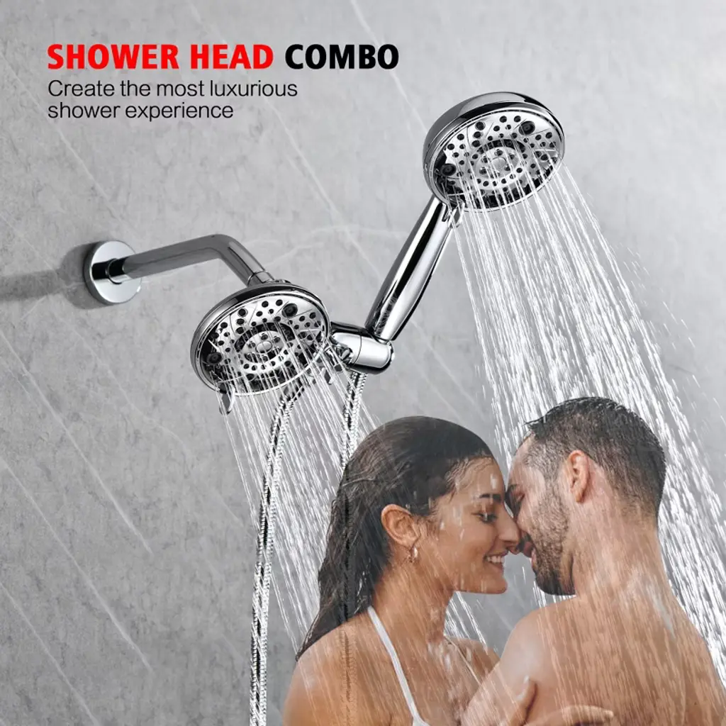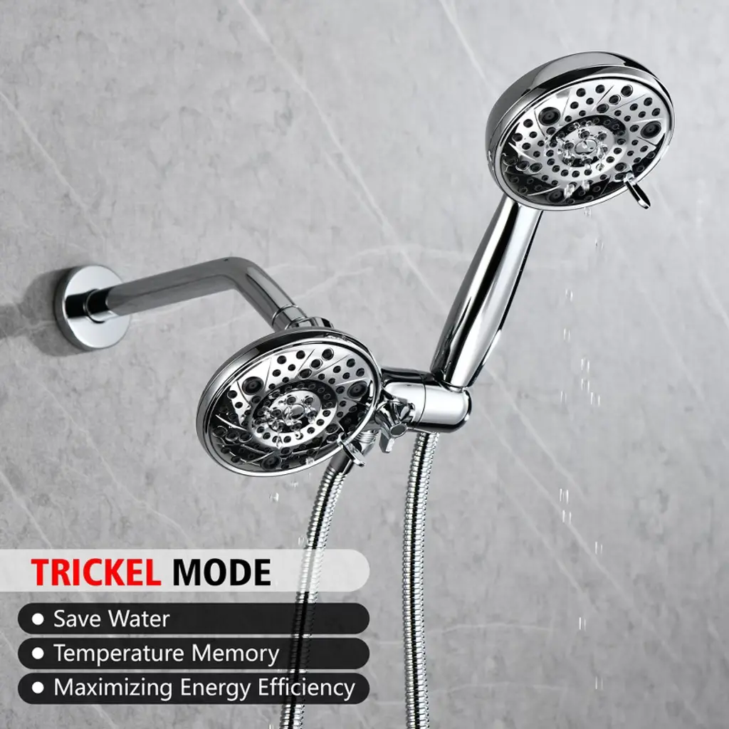 Elevate your daily routine with this innovative dual showerhead system, designed for couples and families seeking luxury and practicality. The 8 spray settings rainfall showerhead delivers spa-like experiences with pulsating massage, gentle mist, and power water modes, while the detachable handheld showerhead offers precision cleaning. A smart water diverter allows instant switching between single/double modes – no more waiting turns during morning rush hours. The Trickle mode keeps water circulating at minimal flow to maintain perfect temperature, reducing energy waste and cold shocks. The 360-degree rotating showerhead adapts to every body contour, paired with an adjustable bracket that tilts for kids, seniors, or seated users. Engineered for easy living, rubber nozzles repel limescale buildup – just swipe with your thumb to restore full water pressure. Easy install in 15 minutes. Upgrade to a water-efficient, family-friendly shower system that combines hotel luxury with smart home convenience. Model: S4367K-CH-TAProduct Name: Handheld Rain Shower HeadMaterial: ABSFinish: Chrome Welcome to SUMERAIN! We take pride in our expertise and commitment to producing top-of-the-line faucets, our team of skilled designers and engineers work tirelessly to create innovative and visually appealing faucets that seamlessly blend form and function. From sleek and modern designs to classic and timeless styles, we offer a wide range of options to suit various preferences and interior design themes. We believe that every customer deserves a faucet that not only performs flawlessly but also adds a touch of elegance to their space. About this item specificities 1.Dual Showerheads for Couples & Families Enjoy versatile bathing with overhead rainfall (8 spray settings) and detachable handheld showerhead for targeted rinsing. The water diverter seamlessly switch between single/double modes – perfect for busy mornings or shared bathroom routines.2.8 Spray Settings with Water-Saving Trickle Mode Customize your shower with 8 spray patterns (trickle, massage, mist, full spray, and more), while the innovative trickle mode maintains water temperature between uses. Save up to 30% water without cold restarts – ideal for eco-conscious households.3.360° Adjustable Showerhead with Flexible Mounting Rotate the rainfall showerhead 360° for full-body coverage or tilt the handheld bracket up/down. The anti-leak swivel joint ensures steady positioning, adapting to users of all heights. 4.Hassle-Free Maintenance Rubber silicone nozzles resist hard water buildup – simply wipe with fingers to clear mineral deposits. No tools required for disassembly, making cleaning faster than traditional showerheads.5.15-Minute DIY Installation for Any Bathroom Includes all accessories. Universal 1/2" NPT connection fits standard plumbing.