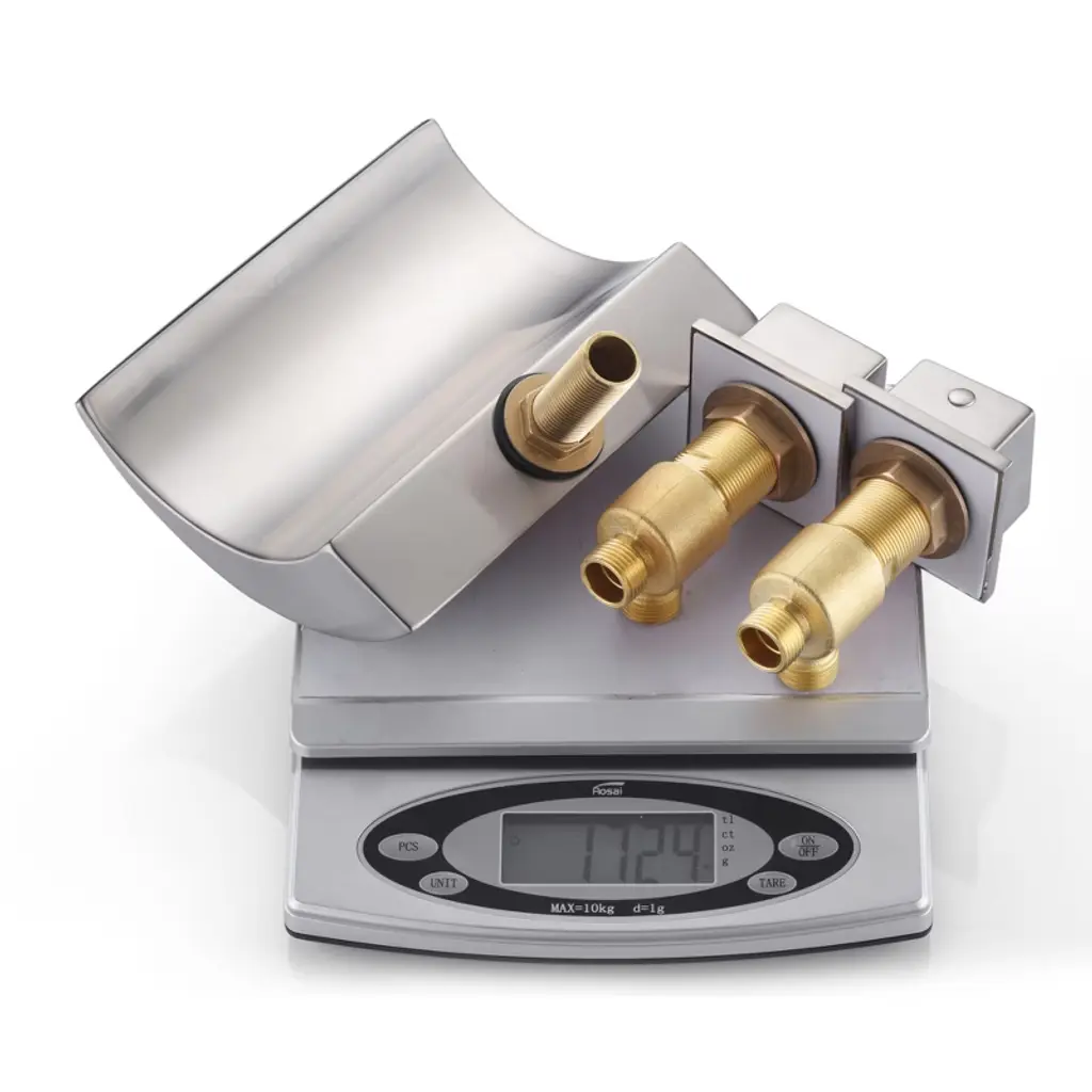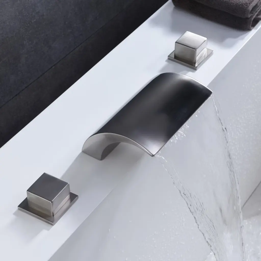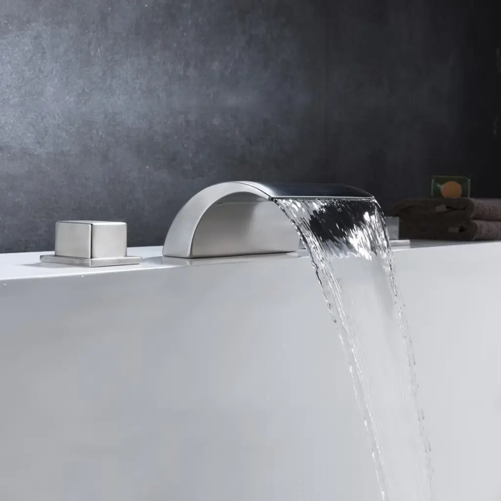 High-quality SUMERAIN waterfall roman tub faucet brings a modern look and makes the bathroom more elegant. For this bathtub faucet, The trough-style spout sends the water down into your bathtub quickly with a soothing, visually pleasing waterfall effect and offers an extended range of reach for added convenience and comfort. The visual appeal of faucets seeks to not only entertain but also relax your mind and body. Exquisite craftsmanship and surface treatment is corrosion and tarnish resistanct.This roman tub faucet has ICC-ES PMG certification and is compliant with standard: ASME A112.18.1/CSA B125.1-2018, plumbing supply fittings(the same standard as cUPC). Model: S2091NW-TA Product Name: 3 Hole Roman Tub FaucetMaterial: Brass and Stainless SteelFinish: Brushed NickelFlow Rate: 14.19GPM@60PSI Welcome to SUMERAIN! We are dedicated to showcasing our proficiency and unwavering dedication in crafting superior faucets. Our team of talented designers and engineers exert relentless efforts to conceive groundbreaking and aesthetically pleasing faucets that flawlessly amalgamate style and practicality.From sleek and modern designs to classic and timeless styles, we offer a wide range of options to suit various preferences and interior design themes.. We believe that every customer deserves a faucet that not only performs flawlessly but also adds a touch of elegance to their space. About this item specificities 1.Roman tub faucets brushed nickel with wide spout features dramatic waterfall effect. Kindly please note that, it is a wide tub spout, before ordering, you need to confirm it can fit your current tub dimensions(for example: holes dimensions, holes distance, hose connection, deck thickness ect), . If not, please don't order it. Any question, please contact sumerain.2.Solid Brass valve body constructed with metal handles for durability. Contains drip-free MS ceramic cartridge. Tested to be drip free after 600,000 uses, this waterfall bathtub faucet brushed nickel covered under Sumerain's limited lifetime warranty.3.Deck mount tub faucet mounts directly to the tub fixture. Recomended installation holes distance: 6" to 7".4.Two knob handles make it easy to adjust the water. Installation holes diameter: 1-1/4 inches(32mm).5.This tub filler faucet with high flow rate of 14.19GPM@60PSI which can fill up your tub in minutes.