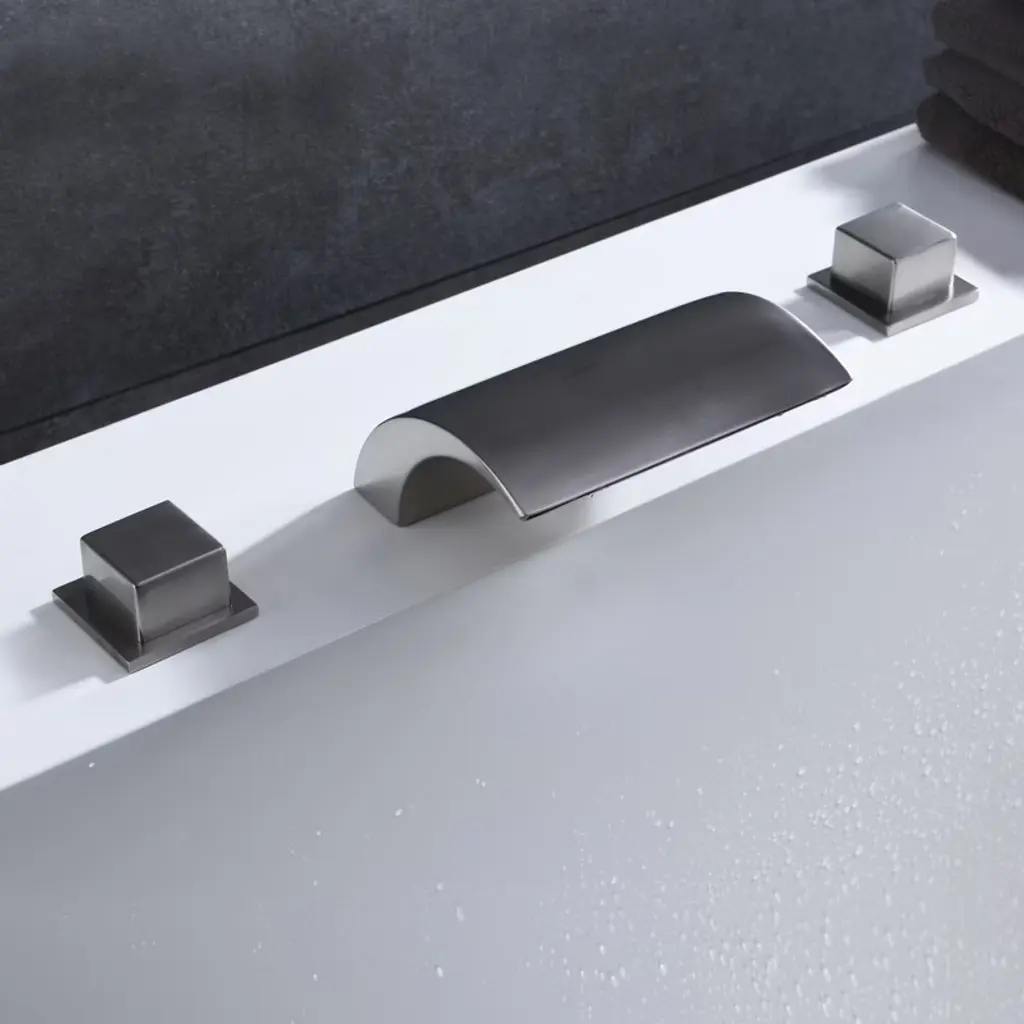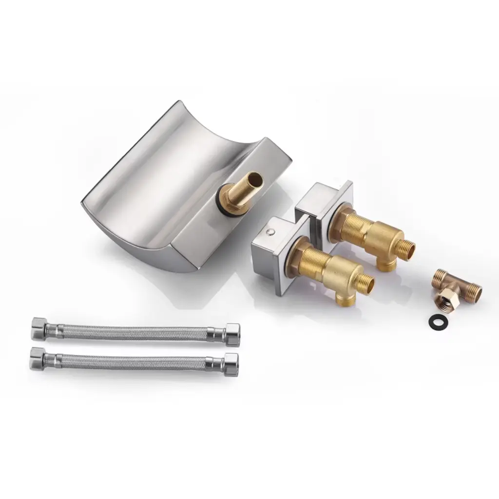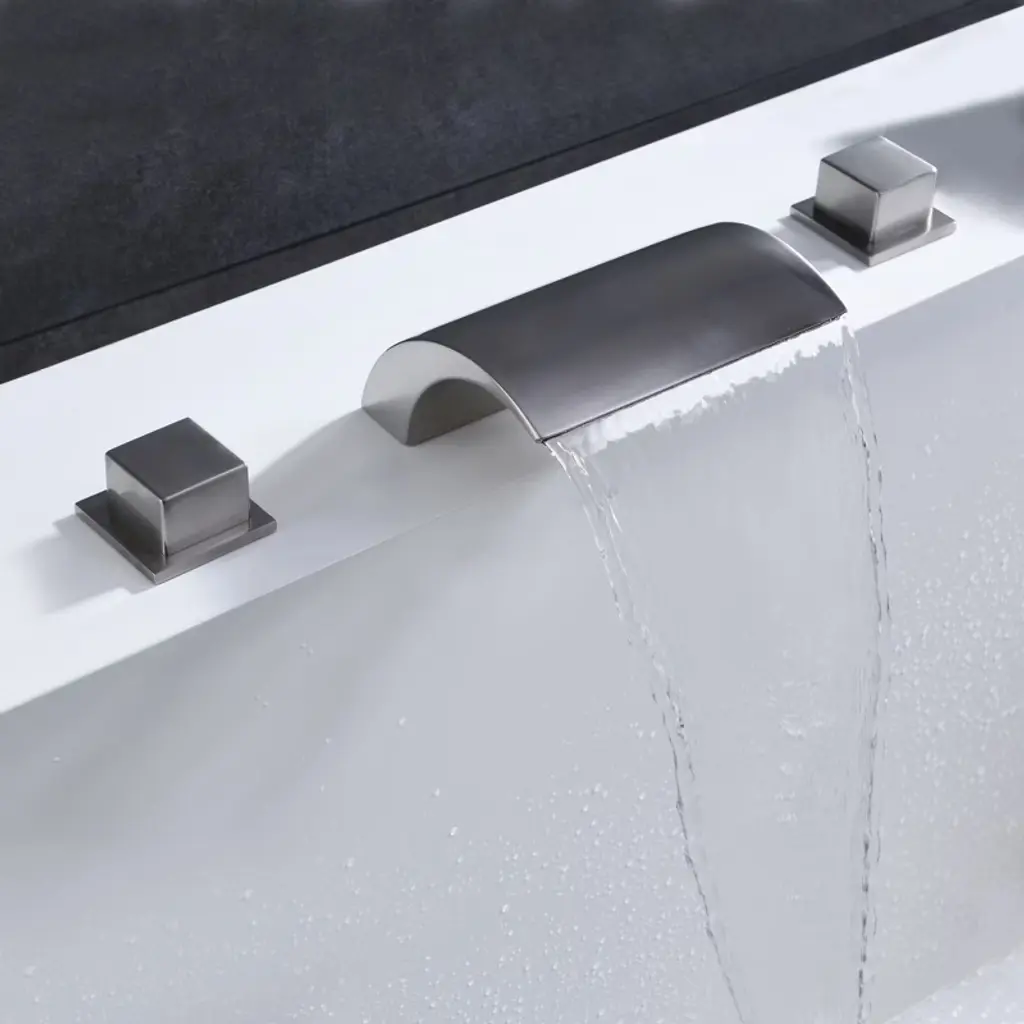 High-quality SUMERAIN waterfall roman tub faucet brings a modern look and makes the bathroom more elegant. For this bathtub faucet, The trough-style spout sends the water down into your bathtub quickly with a soothing, visually pleasing waterfall effect and offers an extended range of reach for added convenience and comfort. The visual appeal of faucets seeks to not only entertain but also relax your mind and body. Exquisite craftsmanship and surface treatment is corrosion and tarnish resistanct.This roman tub faucet has ICC-ES PMG certification and is compliant with standard: ASME A112.18.1/CSA B125.1-2018, plumbing supply fittings(the same standard as cUPC). Model: S2091NW-TA Product Name: 3 Hole Roman Tub FaucetMaterial: Brass and Stainless SteelFinish: Brushed NickelFlow Rate: 14.19GPM@60PSI Welcome to SUMERAIN! We are dedicated to showcasing our proficiency and unwavering dedication in crafting superior faucets. Our team of talented designers and engineers exert relentless efforts to conceive groundbreaking and aesthetically pleasing faucets that flawlessly amalgamate style and practicality.From sleek and modern designs to classic and timeless styles, we offer a wide range of options to suit various preferences and interior design themes.. We believe that every customer deserves a faucet that not only performs flawlessly but also adds a touch of elegance to their space. About this item specificities 1.Roman tub faucets brushed nickel with wide spout features dramatic waterfall effect. Kindly please note that, it is a wide tub spout, before ordering, you need to confirm it can fit your current tub dimensions(for example: holes dimensions, holes distance, hose connection, deck thickness ect), . If not, please don't order it. Any question, please contact sumerain.2.Solid Brass valve body constructed with metal handles for durability. Contains drip-free MS ceramic cartridge. Tested to be drip free after 600,000 uses, this waterfall bathtub faucet brushed nickel covered under Sumerain's limited lifetime warranty.3.Deck mount tub faucet mounts directly to the tub fixture. Recomended installation holes distance: 6" to 7".4.Two knob handles make it easy to adjust the water. Installation holes diameter: 1-1/4 inches(32mm).5.This tub filler faucet with high flow rate of 14.19GPM@60PSI which can fill up your tub in minutes.