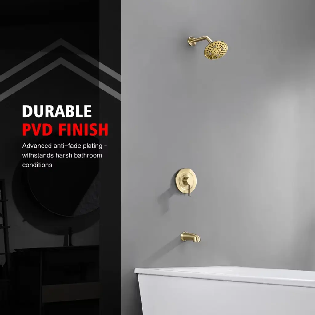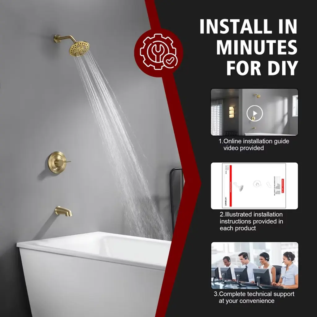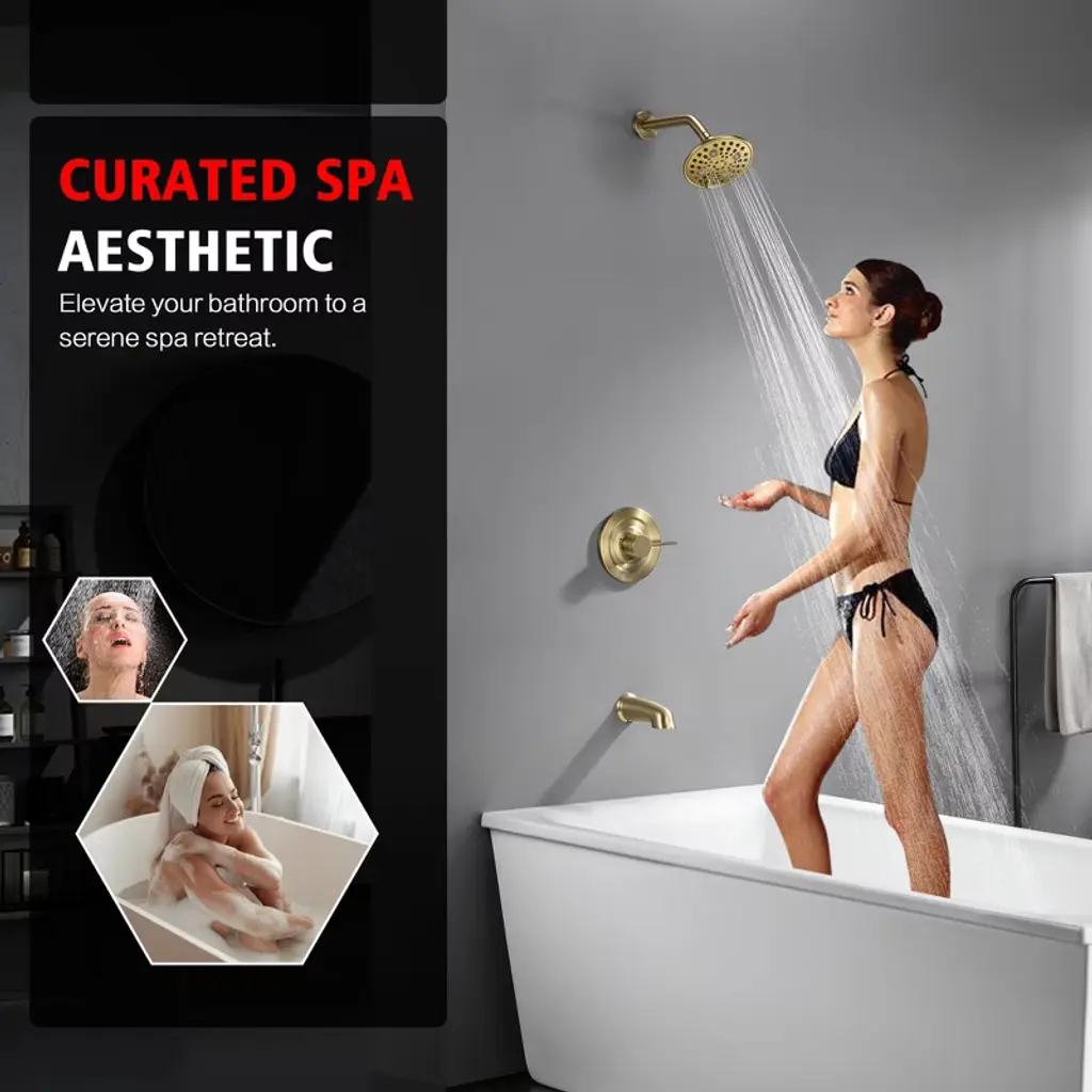 Elevate your daily routine with our luxury spa shower system designed for modern bathrooms. This all-in-one tub shower faucet combines hotel-grade performance with water-efficient technology (6 customizable spray patterns including rainfall/massage/mist modes). The rainfall showerhead delivers 360° coverage for ultimate relaxation. Water-Saving Tickle Mode for rinsing soap without chilling. Dual-control valve combines temperature regulation and spray selection in single lever. Engineered for easy bathroom upgrades, this DIY-friendly shower kit includes detailed installation manuals and online video guides. The anti-leak ceramic disc cartridge ensures drip-free operation, complemented by easy-clean nozzle technology that resists calcium buildup. Compatible with all standard shower arms and pipes, this commercial-grade fixture brings five-star spa experiences to your home without renovation costs. Model: S3241I-BG-TAProduct Name: Tub and Shower FaucetMaterial: Brass, Stainless SteelFinish: Brushed Gold SUMERAIN is a established name in the US plumbing industry which puts great emphasis on stylish and durable. Perfection does not always have to be expensive. SUMERAIN masterful products are high quality and inexpensive. Over three decades of manufacturing experience has provided us with the extensive market knowledge and the ability to offer new products at reasonable expense. The key to our success is intelligentization- we have rapidly expanded into exciting new products groups to be at the forefront of the market. We are dedicated to bringing you the latest designs utilising the most up-to-date technology. The new product design team benefit from a development system audited to ISO9001 standards, meaning each product is designed, sourced, evaluated and warehoused in a high standard. About this item specificities 1. Modern Minimalist Shower System with Spa Luxury Featuring a wall mounted showerhead with 6 customizable spray modes (including Water-Saving Tickle Mode for rinsing soap without chilling), its modern minimalist design integrates seamlessly into any bathroom layout. 2. Body Coverage & High Flow Our rotating shower head optimizes space with 360°adjustable angles for full-body coverage. 3X accelerated flow fills standard tubs - perfect for quick relaxation after long workdays. 3. Effortless Installation & Maintenance DIY-friendly design comes with complete installation kit and animated video guide. Silicone nozzles on shower head resist limescale buildup: simply wipe surfaces to maintain optimal water pressure. Dual-control valve combines temperature regulation and spray selection in single lever. 4.Commercial-Grade Durability for Home Use Durable brass construction ensures leak-proof performance while complying with US plumbing standards. Tested to withstand 600,000+ uses, this tub and shower faucet set eliminates leakage risks with ceramic cartridges.5.Premium Spa Experience at Accessible Price Professional-grade performance without luxury markup. All parts includes, ready to install.