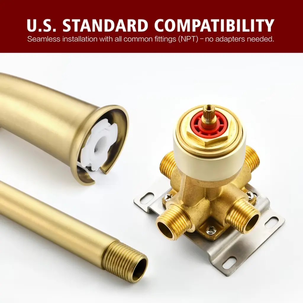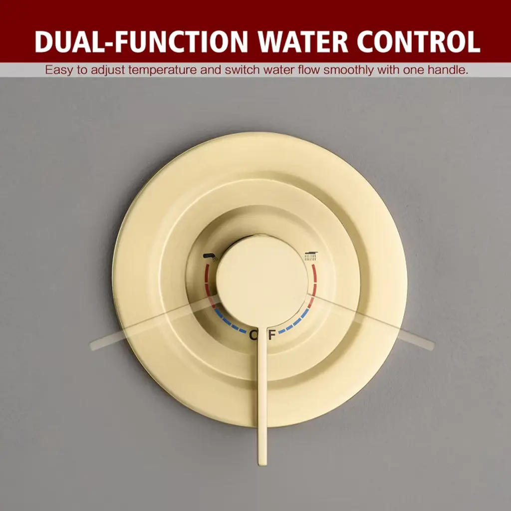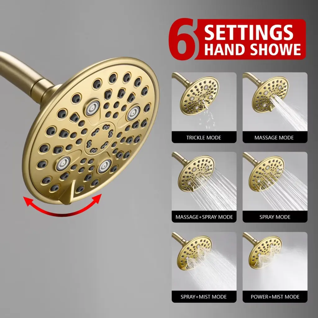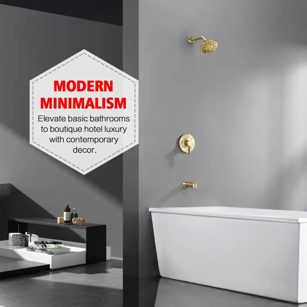 Elevate your daily routine with our luxury spa shower system designed for modern bathrooms. This all-in-one tub shower faucet combines hotel-grade performance with water-efficient technology (6 customizable spray patterns including rainfall/massage/mist modes). The rainfall showerhead delivers 360° coverage for ultimate relaxation. Water-Saving Tickle Mode for rinsing soap without chilling. Dual-control valve combines temperature regulation and spray selection in single lever. Engineered for easy bathroom upgrades, this DIY-friendly shower kit includes detailed installation manuals and online video guides. The anti-leak ceramic disc cartridge ensures drip-free operation, complemented by easy-clean nozzle technology that resists calcium buildup. Compatible with all standard shower arms and pipes, this commercial-grade fixture brings five-star spa experiences to your home without renovation costs. Model: S3241I-BG-TAProduct Name: Tub and Shower FaucetMaterial: Brass, Stainless SteelFinish: Brushed Gold SUMERAIN is a established name in the US plumbing industry which puts great emphasis on stylish and durable. Perfection does not always have to be expensive. SUMERAIN masterful products are high quality and inexpensive. Over three decades of manufacturing experience has provided us with the extensive market knowledge and the ability to offer new products at reasonable expense. The key to our success is intelligentization- we have rapidly expanded into exciting new products groups to be at the forefront of the market. We are dedicated to bringing you the latest designs utilising the most up-to-date technology. The new product design team benefit from a development system audited to ISO9001 standards, meaning each product is designed, sourced, evaluated and warehoused in a high standard. About this item specificities 1. Modern Minimalist Shower System with Spa Luxury Featuring a wall mounted showerhead with 6 customizable spray modes (including Water-Saving Tickle Mode for rinsing soap without chilling), its modern minimalist design integrates seamlessly into any bathroom layout. 2. Body Coverage & High Flow Our rotating shower head optimizes space with 360°adjustable angles for full-body coverage. 3X accelerated flow fills standard tubs - perfect for quick relaxation after long workdays. 3. Effortless Installation & Maintenance DIY-friendly design comes with complete installation kit and animated video guide. Silicone nozzles on shower head resist limescale buildup: simply wipe surfaces to maintain optimal water pressure. Dual-control valve combines temperature regulation and spray selection in single lever. 4.Commercial-Grade Durability for Home Use Durable brass construction ensures leak-proof performance while complying with US plumbing standards. Tested to withstand 600,000+ uses, this tub and shower faucet set eliminates leakage risks with ceramic cartridges.5.Premium Spa Experience at Accessible Price Professional-grade performance without luxury markup. All parts includes, ready to install.