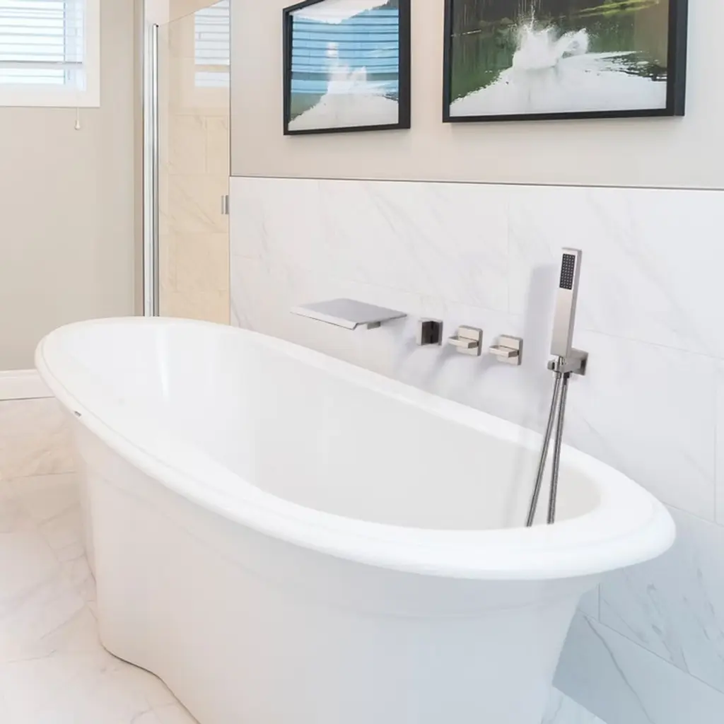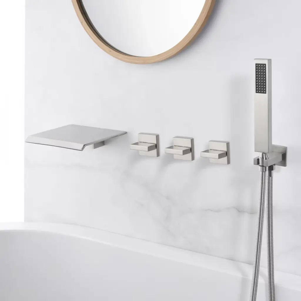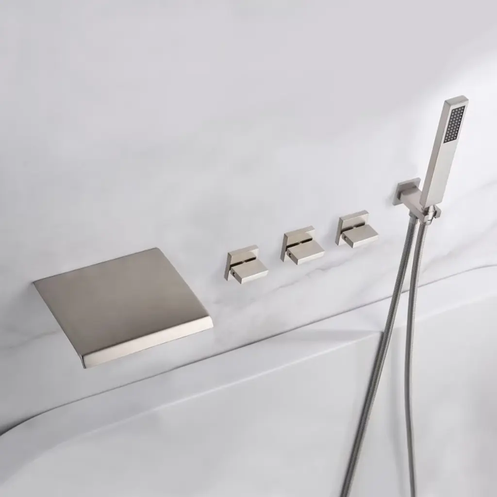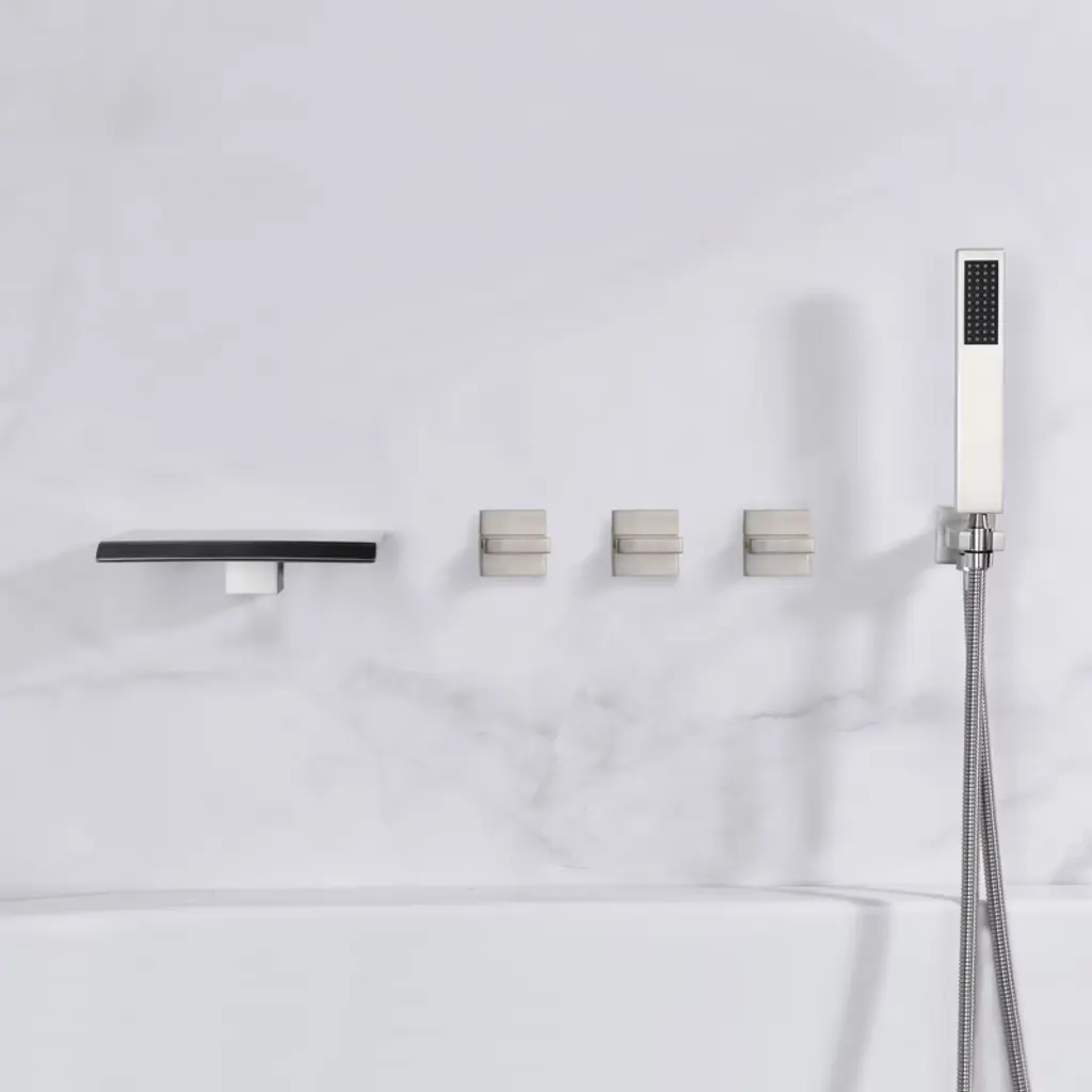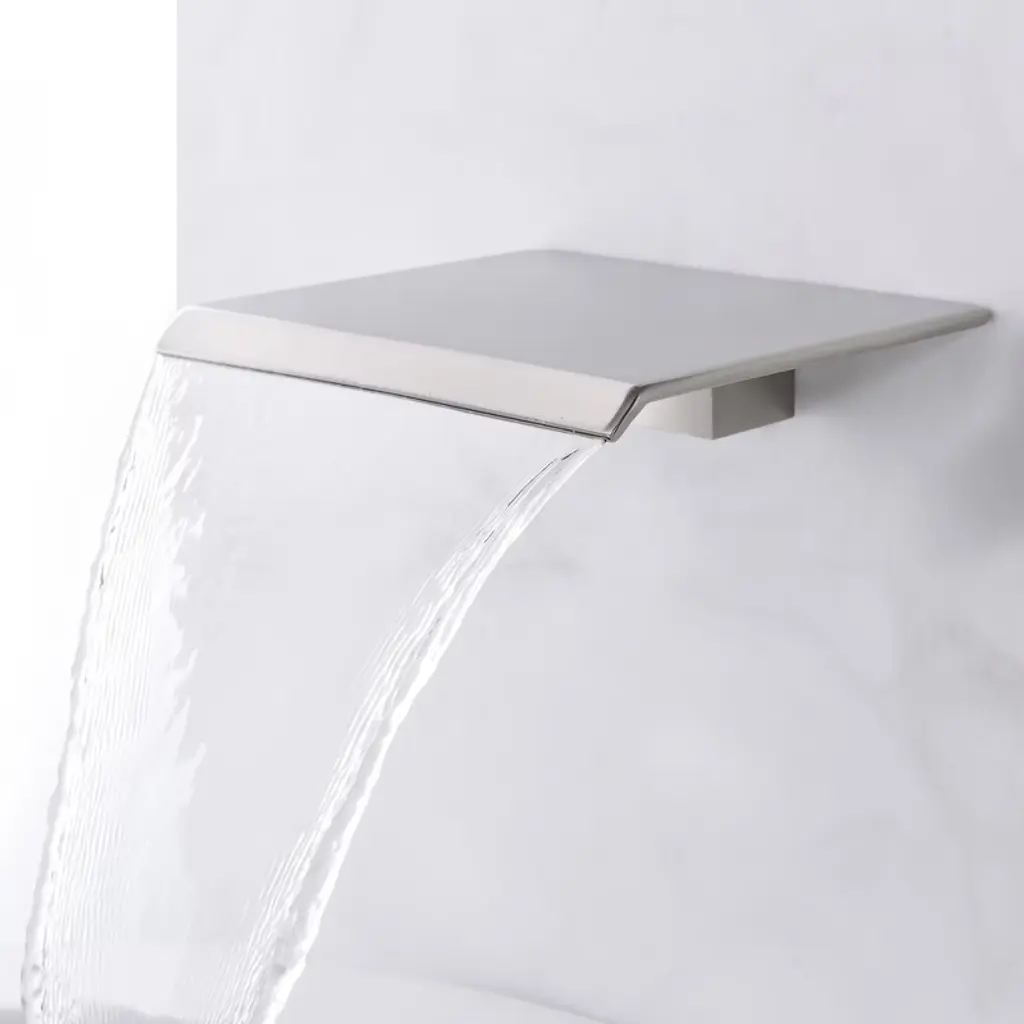 Get a perfect blend of style and functionality for your bathroom with the SUMERAIN Triple Handle Wall Mount Tub Faucet with Hand Shower. This tub faucet features a wide flat spout design that spouts water in a neat waterfall like motion, giving your bath time a touch of elegance. It is available in a stylish matte black finish and features a contemporary style that blends excellently with existing contemporary bathroom fixtures. It is made primarily of brass and stainless steel and is resistant to chipping, rust, tarnish, and staining. It has a wall-mounted type configuration and comes with three knob-style handles. This Triple Handle Wall Mount Waterfall Tub Faucet with Hand Shower from SUMERAIN requires minimal installation and is easy to clean. 1.8GPM(6.8L/MIN)hand shower flow rate, product listed in the California CEC modernized appliance efficiency database system, It has WaterSense certification and compliant with standard: EPA WaterSense specification for showerheads(version 1.1,July 26,2018). This tub faucet also has ICC-ES PMG certification and is compliant with standard: ASME A112.18.1/CSA B125.1-2018, plumbing supply fittings(the same standard as cUPC certification). Model: S2129NW-TAProduct Name: Wall Mount Tub FaucetMaterial: Brass, Stainless SteelFinish: Brushed NickelFlow Rate: 5.42GPM@60PSI Welcome to SUMERAIN! We are dedicated to showcasing our proficiency and unwavering dedication in crafting superior faucets. Our team of talented designers and engineers exert relentless efforts to conceive groundbreaking and aesthetically pleasing faucets that flawlessly amalgamate style and practicality.From sleek and modern designs to classic and timeless styles, we offer a wide range of options to suit various preferences and interior design themes.. We believe that every customer deserves a faucet that not only performs flawlessly but also adds a touch of elegance to their space. About this item specificities 1.Solid brass rough-in valve ensures long service life. 1.8GPM(6.8L/MIN)hand shower flow rate.2.Standard American NPT 1/2" threads for firmly connection, avoids any leakage and prevents flooding in your house.3.Wide waterfall spout and high flow rate(5.42GPM@60PSI) cartridge design, this wall mount tub filler can fill up your tub in a minutes.4.5 Years quality warranty for cartridge, we will response customers' service requests within 24 hours by phone or email.5.Detailed user manual for easy and quick installation, this wall mount tub faucet especially suitable for DIY users. Installation depth is extremely important, make sure to read the manual before proceeding. If customers install rough-in valve in improper depth, in order to reduce customer losses, customize parts can be provided.