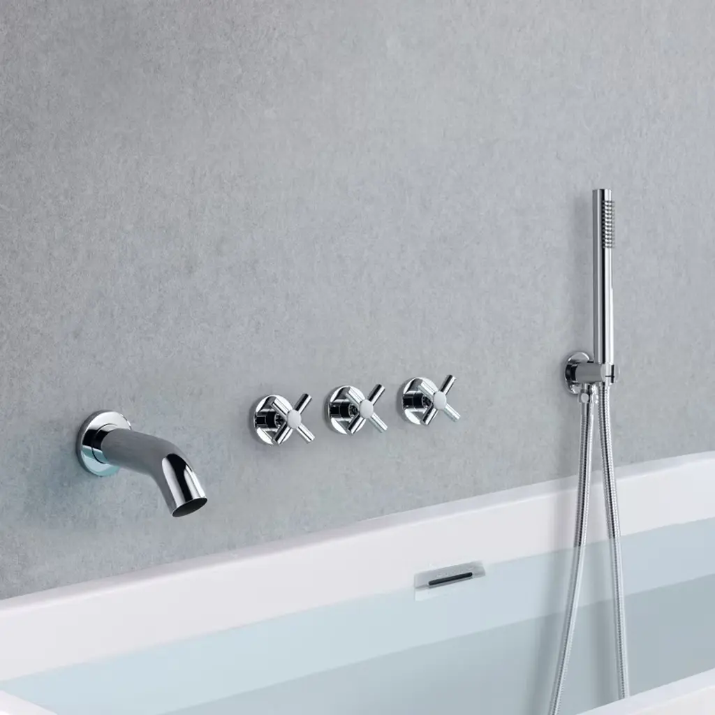 Sumerain Wall Mount Tub Filler Waterfall Tub Faucet With Handheld Shower And 3 Cross Handles, Chrome
