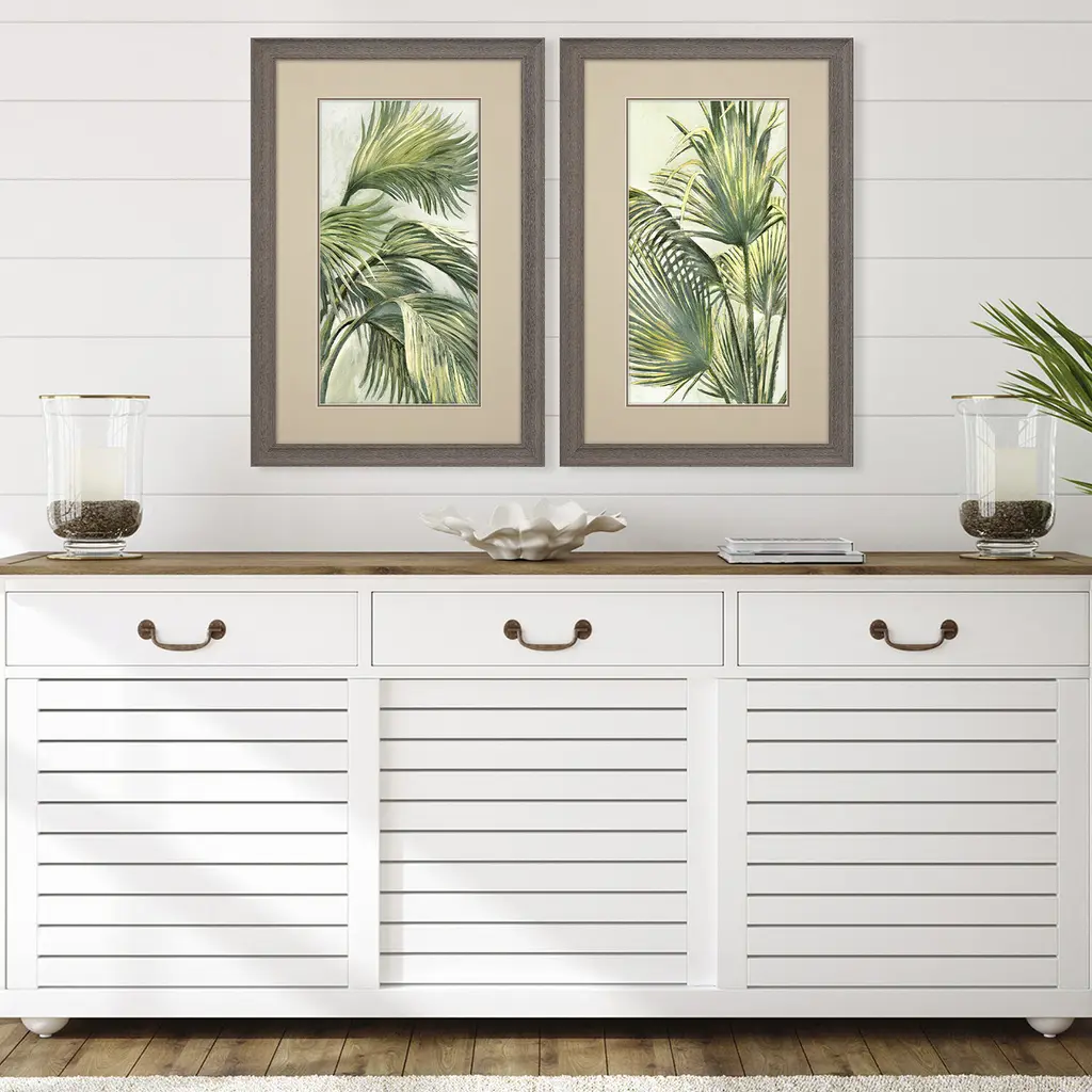 Green palm fronds catch the summer breeze on a tropical beach. Matted in corn starch and framed in a rustic wood-grain finish moulding.