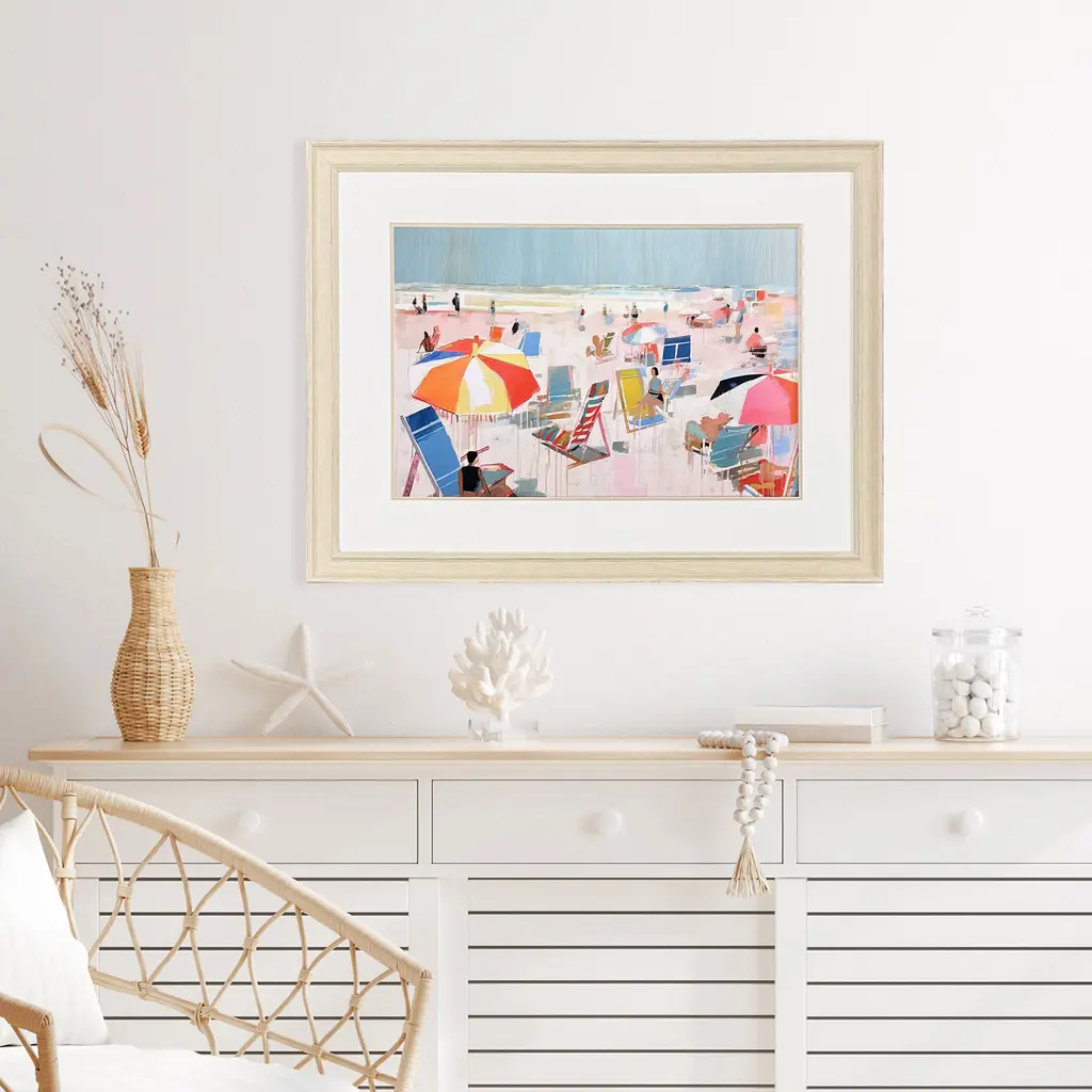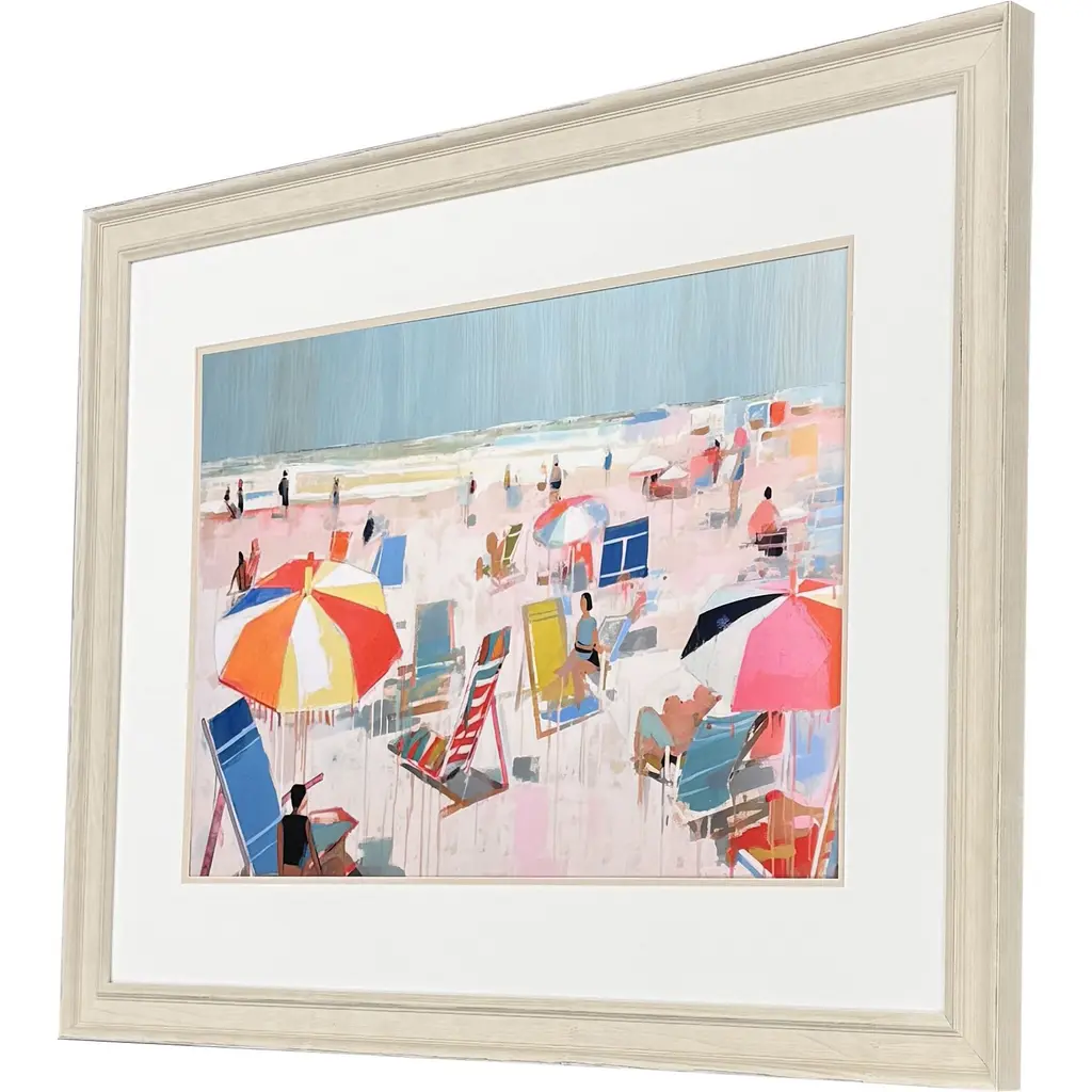 Colorful umbrellas enliven beach days. Double matted in white and sand and framed in a distressed ivory wood with traditional scoops and planes.