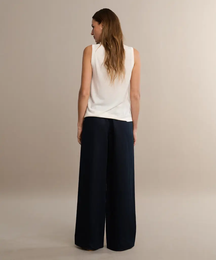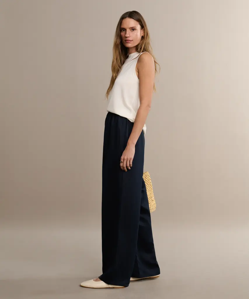 Summer Demi Pant Navy A favorite style in a spring-ready fabrication and weight, the Summer Demi Pant features a slubby, linen texture with a satin-like finish, bringing you the best combination of seasonal fabrics. Pair this with the Madeline Shirt for a classic set or don it solo as an everyday basic.