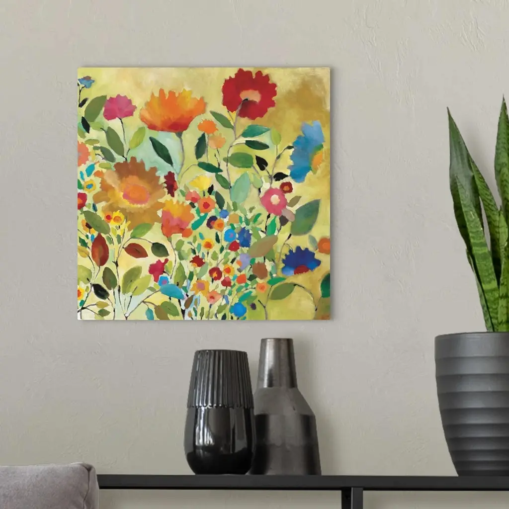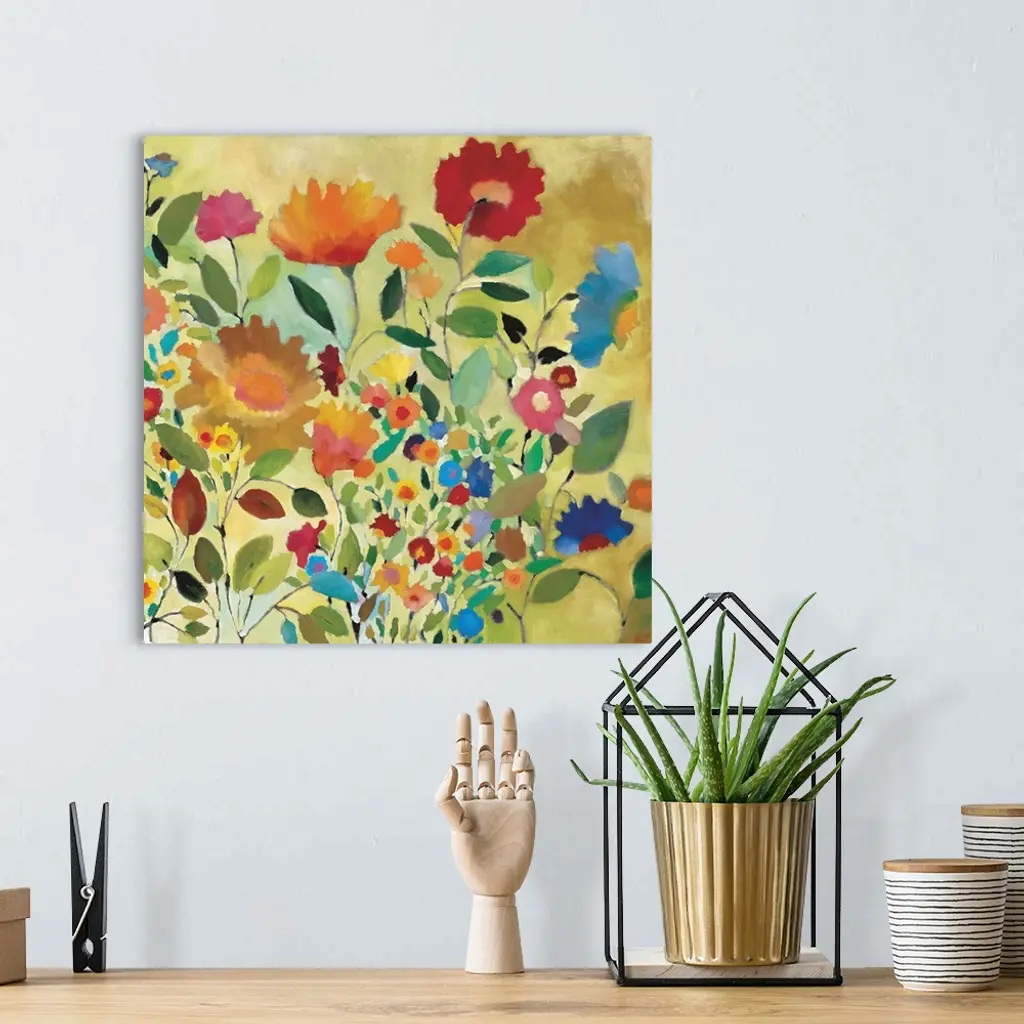 A series of flowers and leaves in warm colors and a soft style against a pale yellow background.