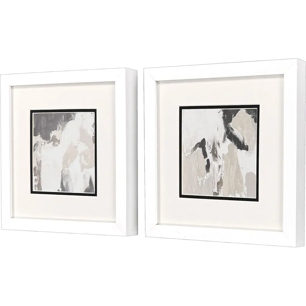 Abstract prints in neutral tones are double matted in light buff and black. Framed in a modern flat profile molding with a matte white finish.