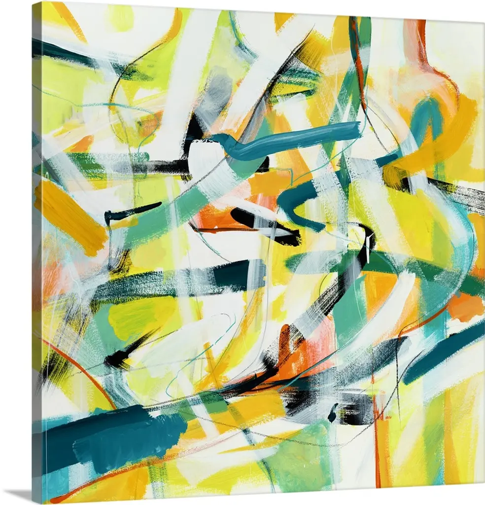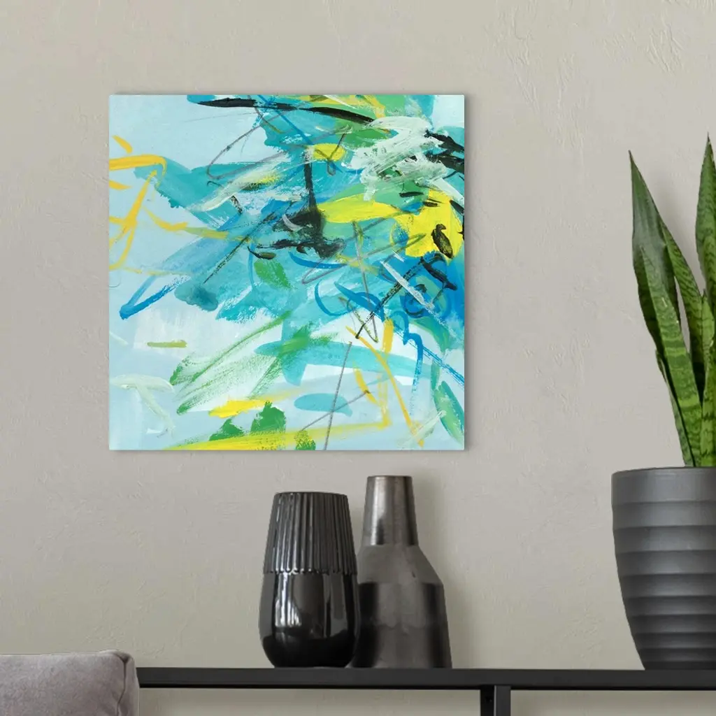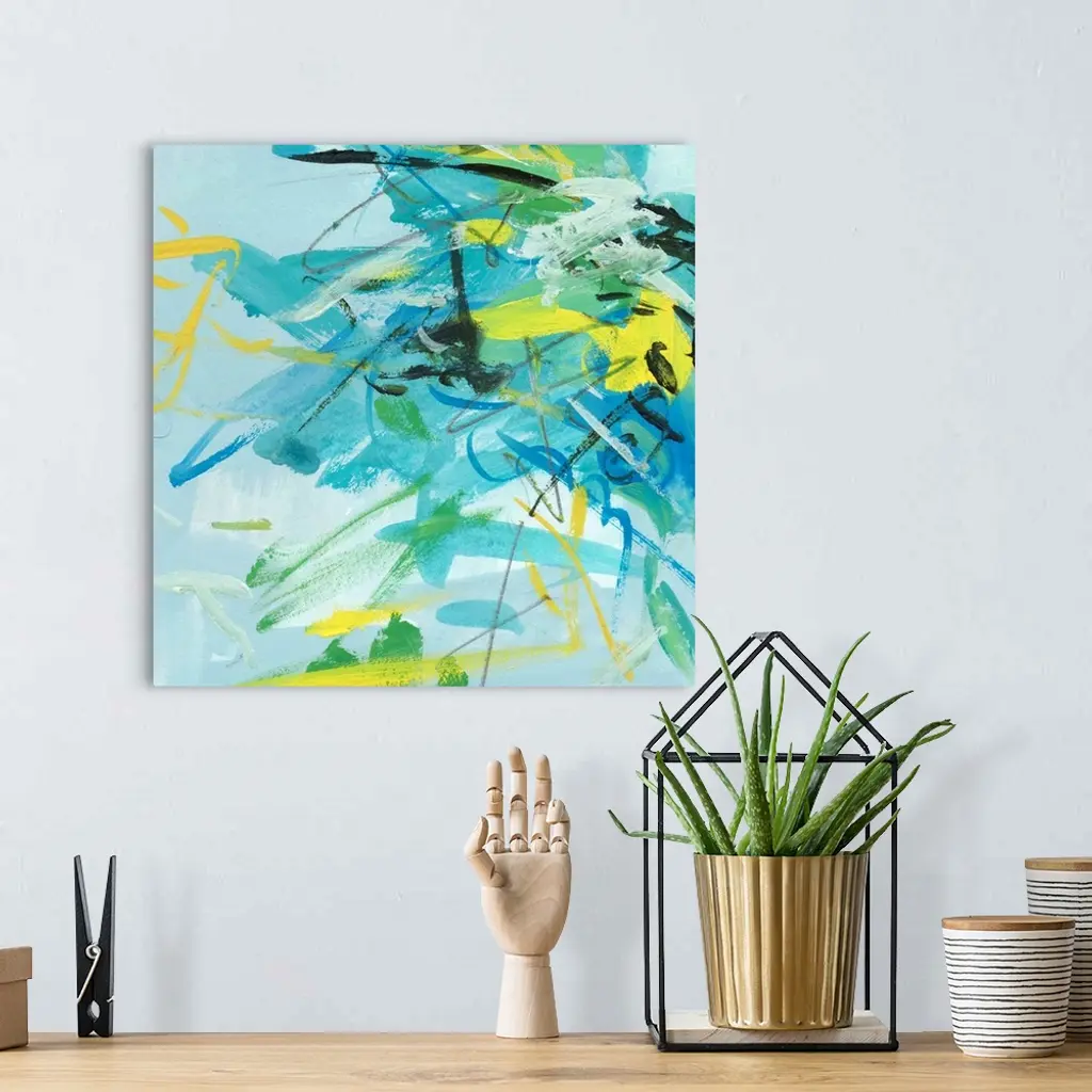 Bright blue and green brustrokes come together to construct this painted summer symphony.