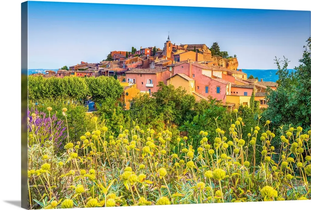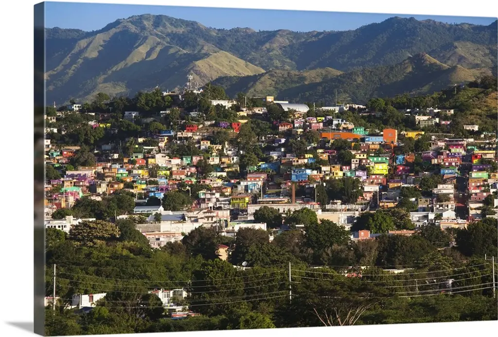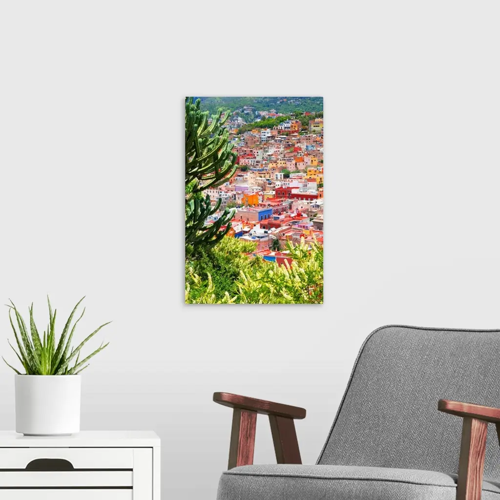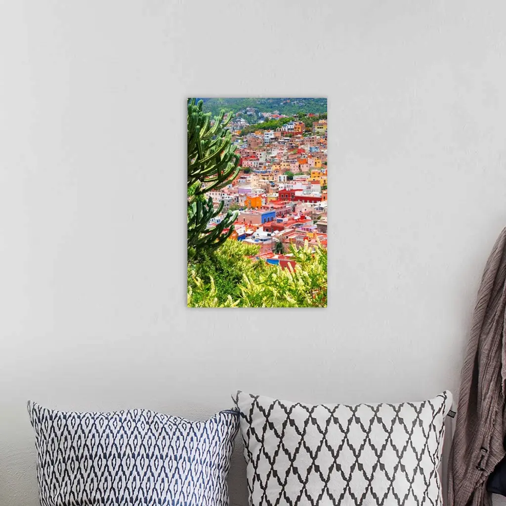 Cityscape photograph of Guanajuato, Mexico, framed with green plants and cacti. From the Viva Mexico Collection.