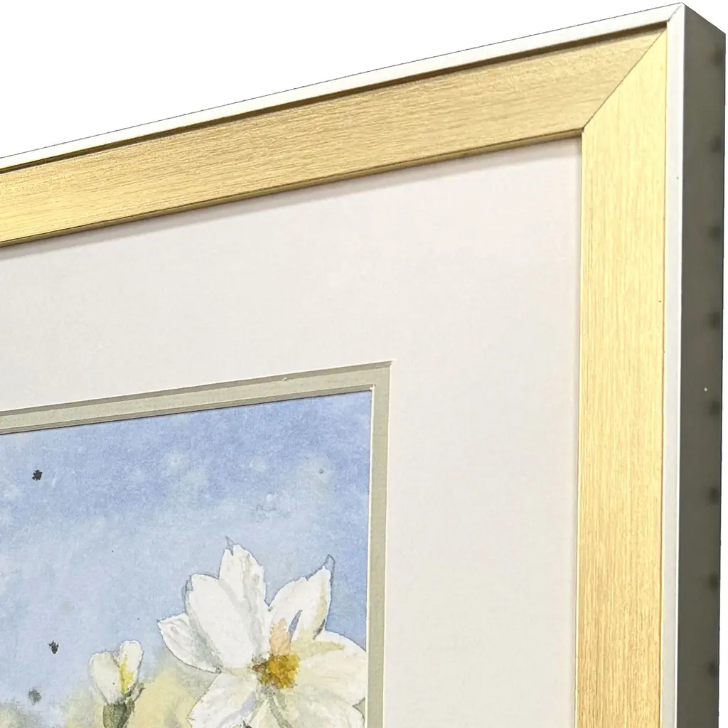Fragrant summer wildflower gardens are alive with color. Matted in buff and framed in a modern gold finish molding with champagne side and lip.
