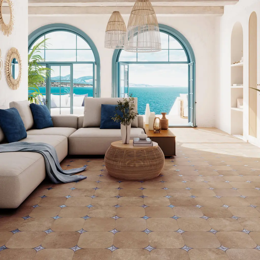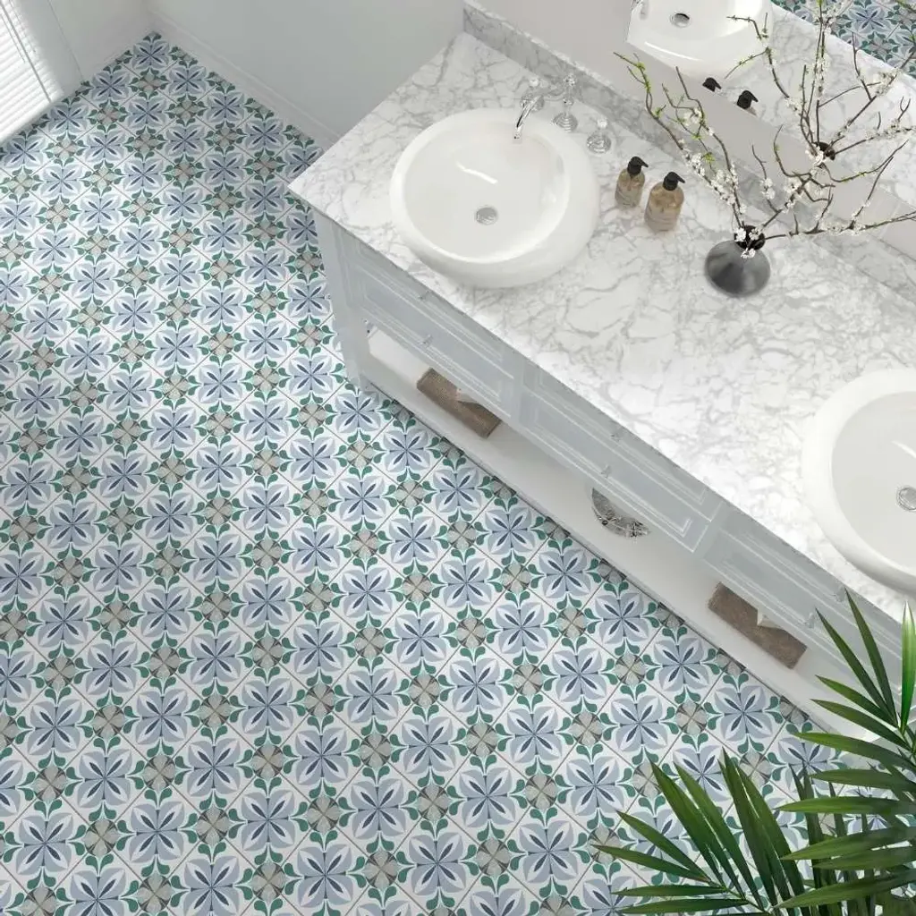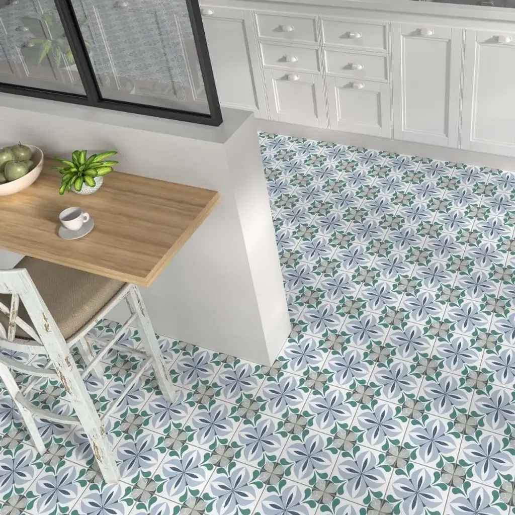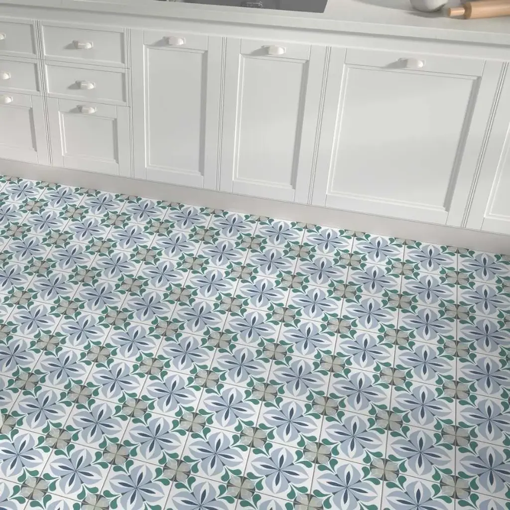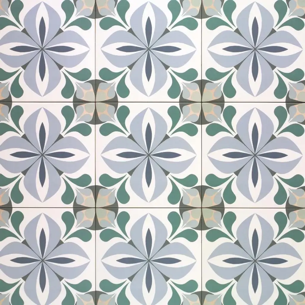 The Summertime collection brings the energy of sunlit days and cool, refreshing waters to any space, blending durability with artistic charm. Made in Spain from sturdy porcelain with a matte finish, these 8x8 tiles are designed to withstand water exposure, making them just as at home in pools and patios as they are in kitchens and bathrooms. The collection offers three distinct styles: Caen, a soft blend of muted blue and sage in a delicate floral motif; Lyons, a lively interplay of bright dots and lines that form a dynamic, woven pattern; and Ruan, where deep blue and dark green florals create a rich, moody elegance. Whether indoors or out, Summertime infuses spaces with movement, color, and a touch of warmth. FEATURES: A case of this product includes 25 pieces and covers 10.76 square feet Porcelain, singular, geometric, encaustic, floral, patterned, matte, pressed, straight edge floor and wall tile Impervious and waterproof; Withstands sun and rain Matte finish with a shade 1 rating/ variation (V1 uniform appearance Made in Spain Crafted from durable, long-lasting porcelain Suitable for water-exposed areas, like pools Features a sleek matte finish Available in three unique styles: Lyons, Caen, and Ruan Modern encaustic patterned tiles Ideal for both interior and exterior spaces Versatile 8" x 8" size for easy installation This product has a PEI rating of 3 (endurance and hardness indicator) and therefore is suited for residential countertops, walls, and medium-traffic floors Ideal for backsplashes, bathrooms, showers, kitchens, outdoors, pools, floors, walls Approved for residential and commercial installations Easy to install 8 inches x 8 inches decorative geometric, floral pattern porcelain floor and wall tile DIMENSIONS: Individual tile size: 8 inches L x 8 inches W Surface area per carton: 10.76 square feet Sample tile size: Full size 8 inches L x 8 inches W