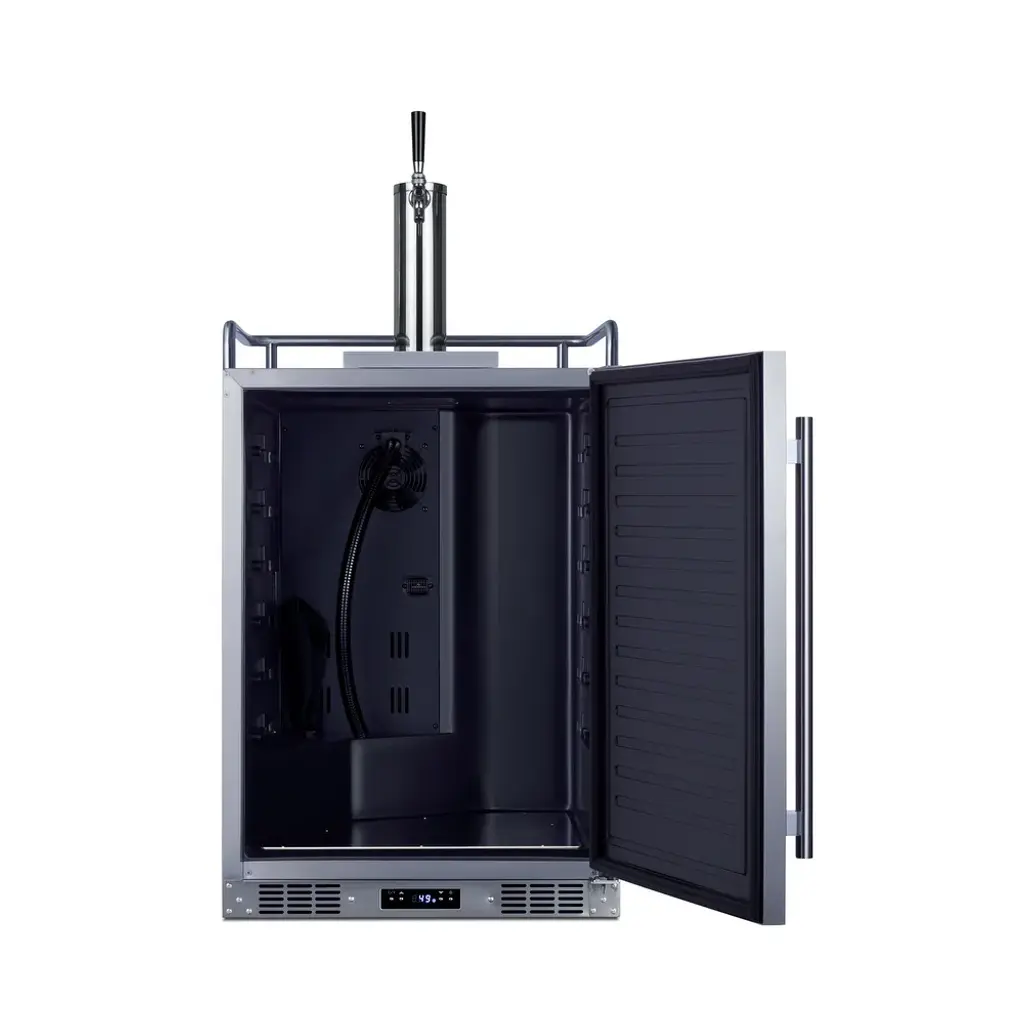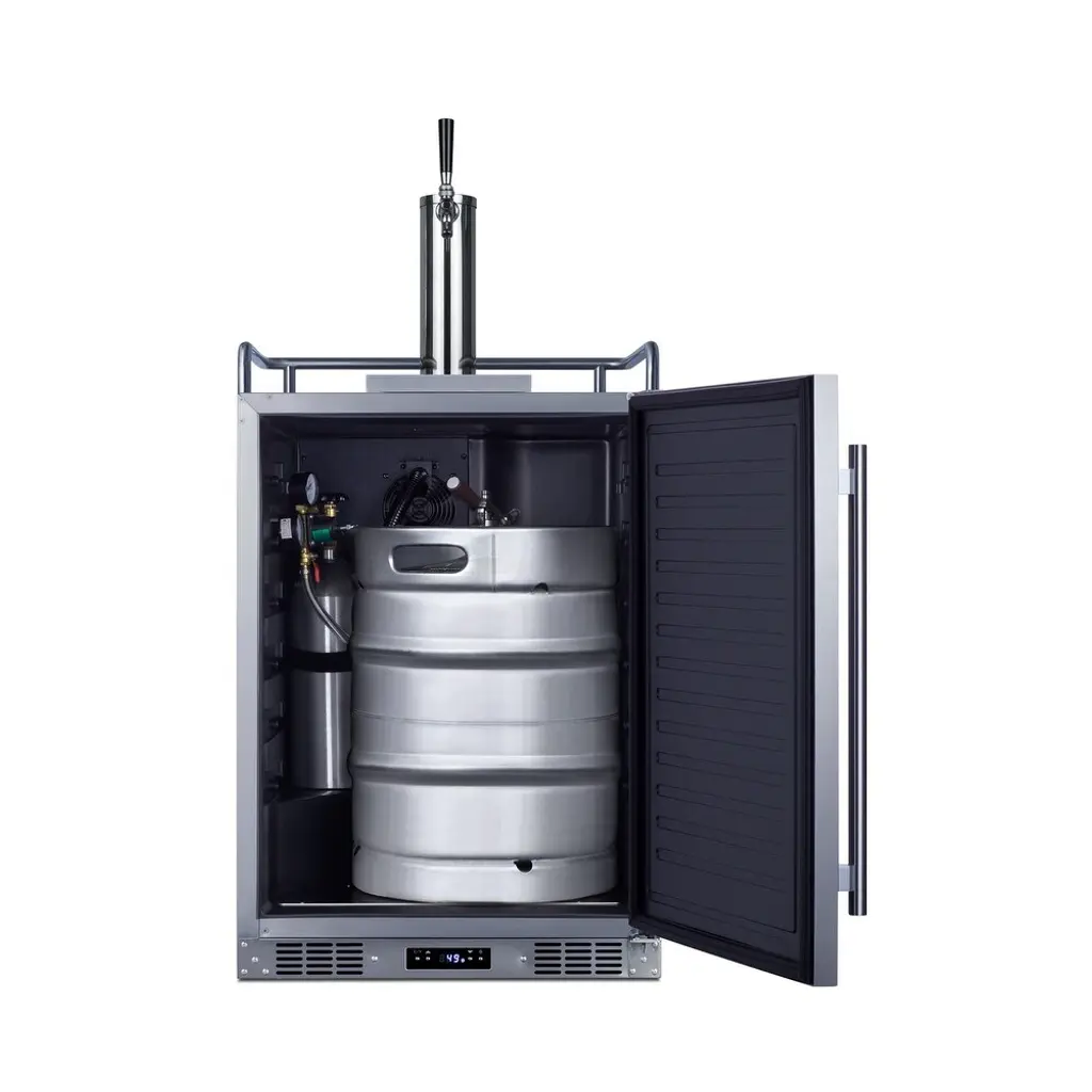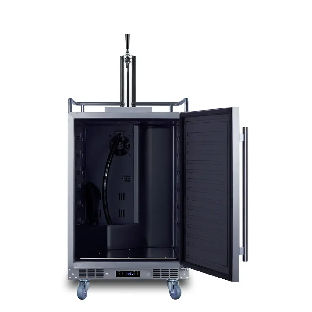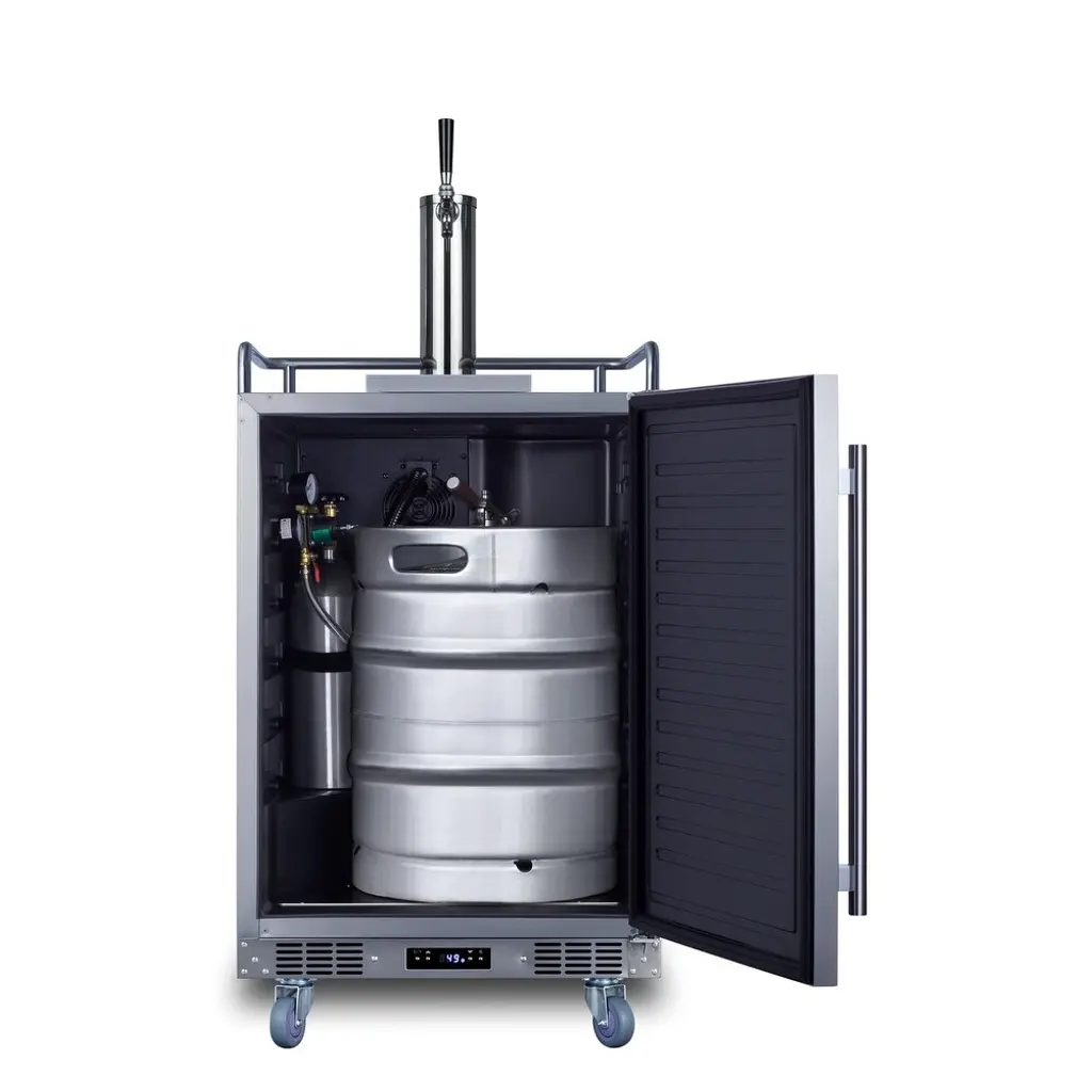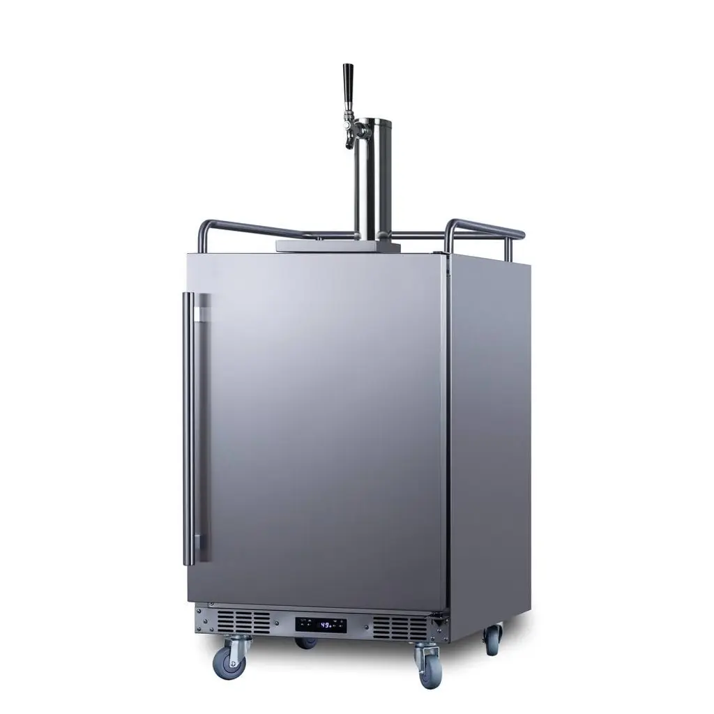 Summit manufactures a complete line of versatile kegerators capable of built-in installation in indoor or outdoor home settings.The SBC683OS is a full-sized beer dispensers approved for both residential or commercial use. Sized at just 24" wide, it features a front-breathing system for built-in installation and a fully-finished cabinet that also allows freestanding use, with an included caster set for optional mobility. The exterior door and cabinet feature 304 grade stainless steel construction for safe, weatherproof use in the outdoors. The user-reversible door includes a pro style vertically mounted handle to complete the look. Additional features include a removable two-piece stainless steel drip tray to collect spills and a chrome guard rail to help keep glasses and mugs in place. This unit has a sealed rear for added protection from the elements.Inside, the 5.6 cu. ft. interior can accommodate a full half or quarter keg, or up to three Cornelius or sixth barrel kegs. Summit includes a complete commercial grade tap kit for dispensing your favorite beer, including a Sankey tap system and single tap draft tower, along with a CO2 tank and regulator. A tap cool system keeps your beer cold as it goes through your tower, and a Velcro strap holds the tank in place. The floor is constructed from stainless steel for added protection when loading and removing kegs. Two chrome shelves, with six placement options, allow the kegerator to also function as a beverage refrigerator. A digital thermostat makes it easy to manage the wide range temperature, while the external digital display has a readout in Celsius or Fahrenheit. Automatic defrost operation ensures minimal user maintenance. The Memory IC function recovers the unit's last settings in the case of a power outage or disruption. With its solid construction, user-friendly features, and attractive design, the SBC683OS is the perfect beer dispenser for indoor or outdoor kitchens. Additional choices are available with alternate tapping options, including choices to dispense wine and coffee. Browse the full Summit line to explore all of your options.Features:Specifications: