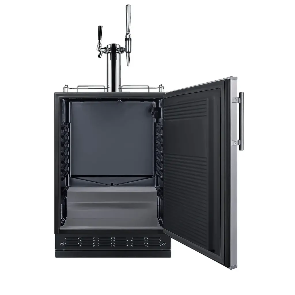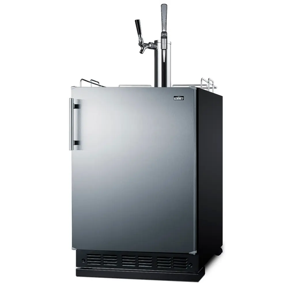 Made in Europe, Summit Commercial's kegerator series offers refreshing convenience to any home or foodservice setting looking to serve a variety of beverages on tap.Sized with a 24" footprint, this model is a versatile cold brew/nitro coffee dispenser that is ETL-S listed to NSF-7 standards for use in commercial environments. The design also meets residential standards for home use. It can be recessed under counters or used freestanding. Adjustable legs allow you to set the height between 33 1/2" and 34 1/2" for the perfect fit. Included is a black steel leg shield for optional use if you find there is too much space between the front and floor when the unit is set at its taller height, as well as a set of casters (two locking) for optional mobility if preferred. The user-reversible door offers an elegant look for any kitchen, with a special coating that makes it easy to wipe off the surface for a fingerprint-resistant front. The handle is side mounted for an easy grip and attractive look. This kegerator ships with a commercial grade tap kit with a dual tower that lets you serve both standard "flat" iced coffee and nitro cold brew from two cornelius style or 1/6 (sixtel) kegs. Also included is a nitrogen tank (ships empty), regulator, and all of the equipment you need to serve coffee on tap. Inside features a black interior liner and stainless steel floor for added protection when loading kegs. The interior light comes with an on/off rocker switch located behind the dial thermostat. Classic mechanical controls ensure an intuitive, trouble-free performance without any internal boards or chips. Automatic defrost reduces user maintenance and an innovative cold wall design creates an efficient, reliable cooling system. Included is a set of adjustable glass shelves and one scalloped bottle rack for easy storage if using the interior as a standard beverage refrigerator. Features:Specifications: