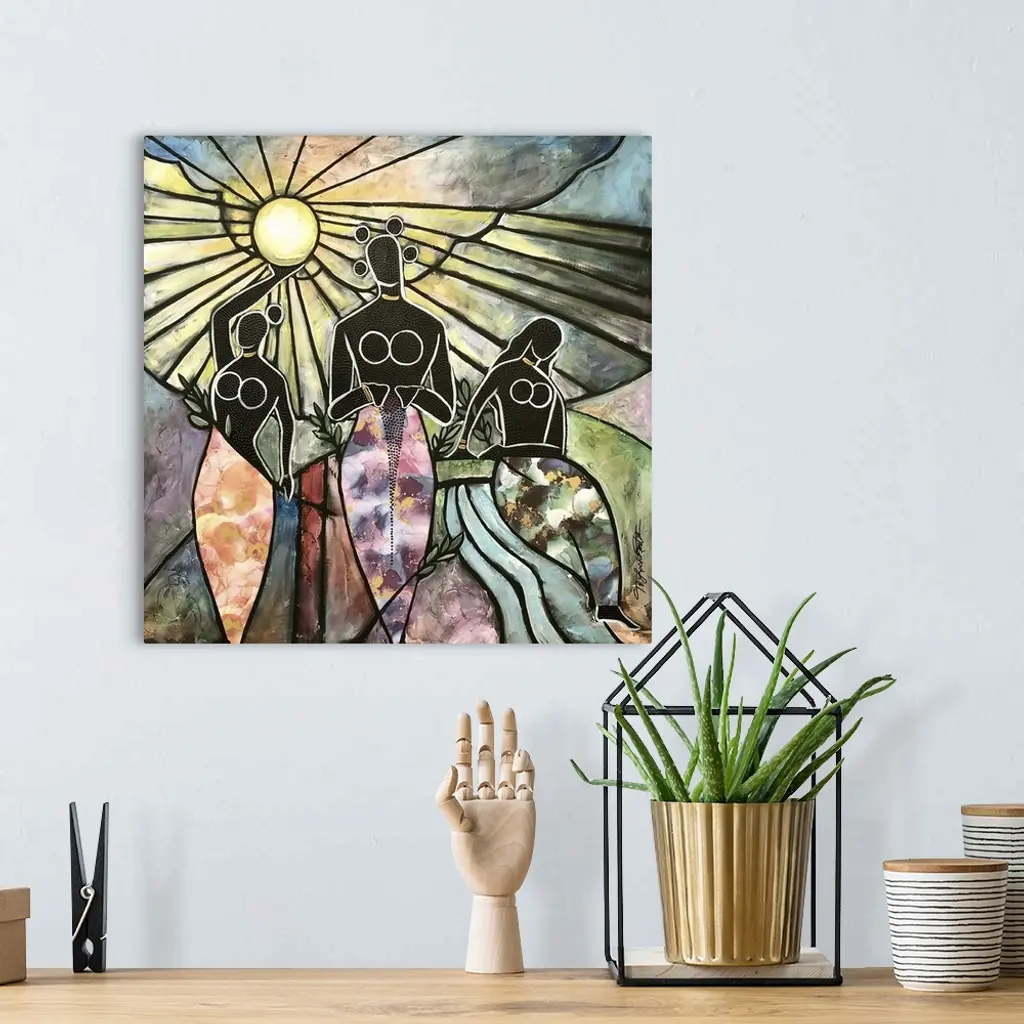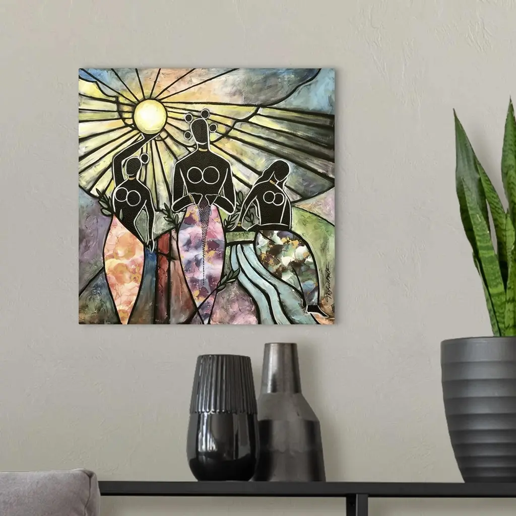 Sun earth water, women of power and strength, 2021. (Originally mixed media on canvas.) Three women representing the sun, land and water.