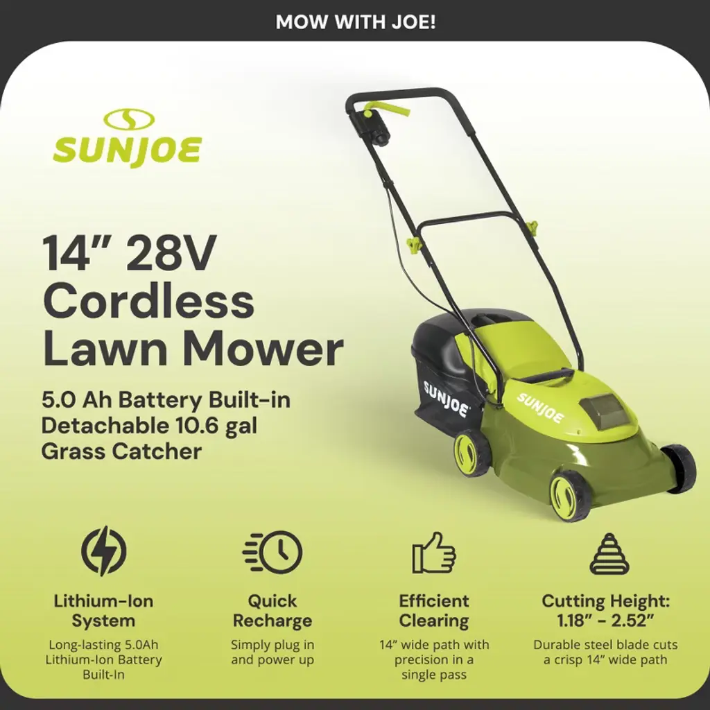 Cut the cord and power through your lawn care routine with the Sun Joe MJ401C-XR 28-Volt 5.0 Ah 14-Inch Cordless Lawn Mower, the perfect solution for small to medium-sized yards. Designed as the cordless version of Sun Joe’s best-selling MJ401E, this eco-friendly mower delivers gas-free, hassle-free performance with no emissions, pull cords, or tangled extension cables. It’s everything you love about electric mowing, now with the freedom of battery power. Equipped with a durable steel blade, the MJ401C-XR creates a crisp, clean 14-inch-wide cutting path in a single pass. The 3-position manual height adjustment lets you easily tailor your grass height for the perfect trim, whether you're maintaining a thick, lush lawn or doing a quick seasonal touch-up. Powered by a rechargeable 28V 5.0 Ah lithium-ion battery, this cordless mower covers up to 2,600 sq. ft. on a single charge, making it ideal for suburban lawns and small outdoor spaces. When you're ready to mow, simply insert the safety key, press the safety switch, squeeze the trigger, and go. It’s quiet, efficient, and easy to operate. Clippings are collected in the included 10.6-gallon grass bag, which detaches easily for quick disposal. And when the mowing is done, just plug it in to recharge—no fuel, fumes, or messy maintenance required. Go cordless and “Go With Joe” for the ultimate in convenience, control, and eco-conscious lawn care. The MJ401C-XR cordless lawn mower makes mowing smarter, not harder.