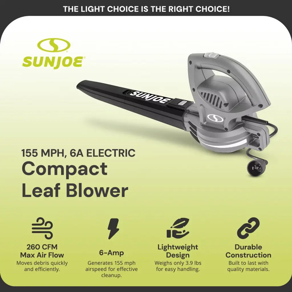 Sun Joe Electric Powered Leaf Blower, 6 Amp Motor & 155 Mph Air Speed, Sbj597e-gry