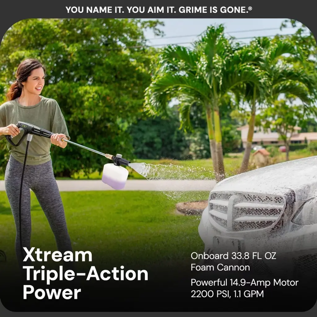 The Sun Joe SPX3000-XT1 Xtream Clean Pressure Washer delivers it all to tackle a variety of cleaning tasks for homes, buildings, RVs, cars, trucks, boats, decks, driveways, patios, lawn equipment, and more. This power washer packs a powerful punch with its 2200 PSI and 14.9-amp motor with the ability to remove tar and grease from concrete, heavy mildew stains, oil stains, rust from steel, caked mud on equipment, and other stubborn gunk and grime. Equipped with an Xtream foaming detergent cannon system, this corded pressure washer boasts Xtreme triple-action power for a range of spray patterns, with coverage up to 15 feet away. Easily foam, clean, and rinse the 33.8-ounce cannon. Featuring a 35-foot power cord and 34-inch spray wand to access hard-to-reach areas, you can wash high and low places, such as 2-story buildings and the undersides of automotive vehicles and lawn equipment. This washer is effective and conveniently lightweight at only 27 pounds and offers 1.1 GPM of flow power. Plus, its rear wheels provide easy portability around your yard. Tailor the pressure output of the spray to your cleaning needs with the 4 Quick-Connect spray nozzles. A 20-foot high-pressure hose, garden hose adapter, and a TSS (Total Stop System) trigger are included. Wash away grit and grime with power and precision using the Sun Joe SPX3000-XT1 Xtream Clean Pressure Washer.