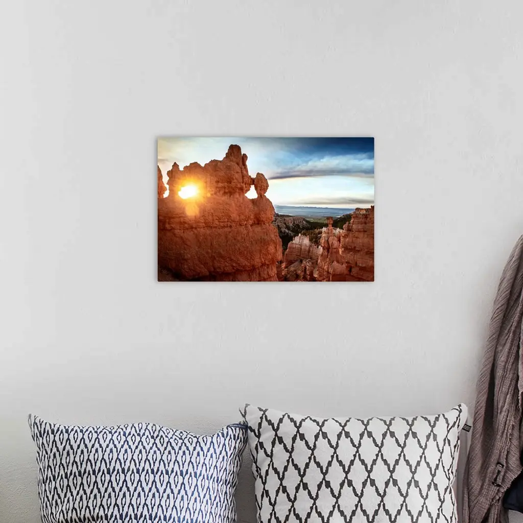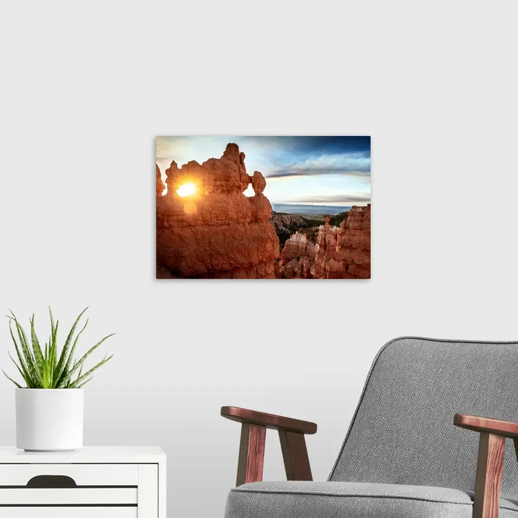 The sun shining through a naturally eroded hole in a hoodoo formation in Bryce Canyon National Park, Utah.