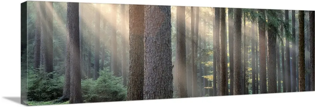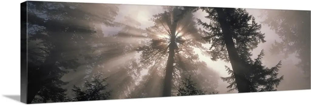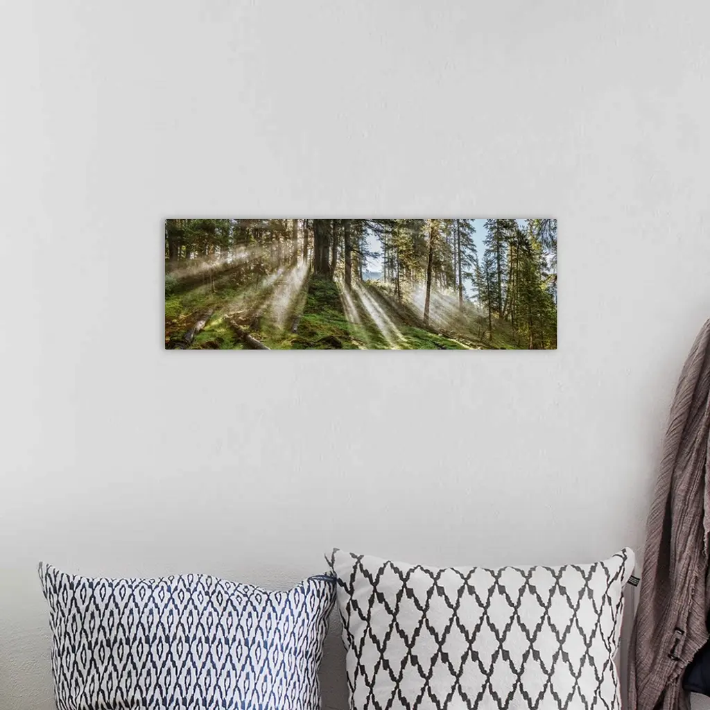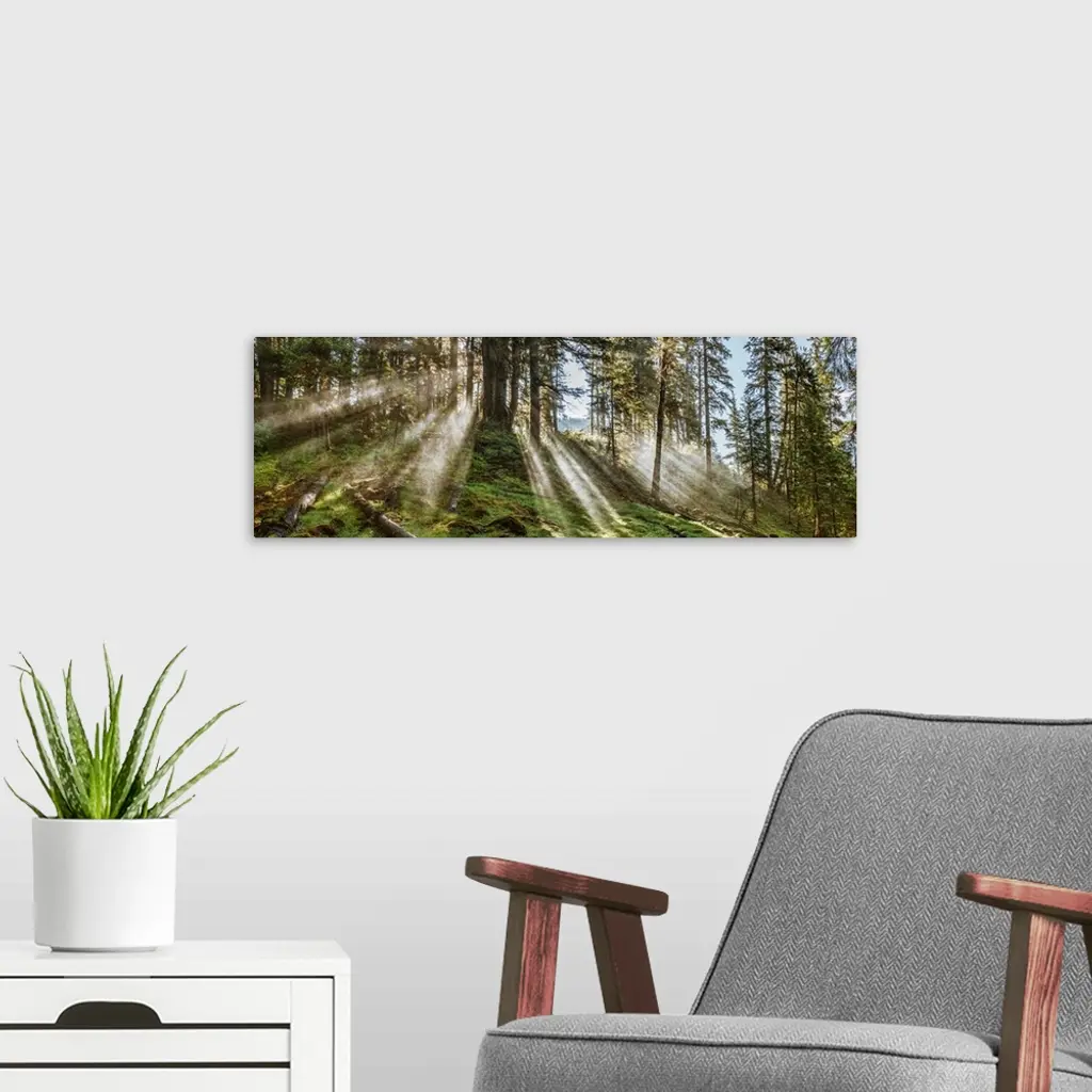 Sun rays passing through trees in forest, Southeast Alaska, Alaska, USA.