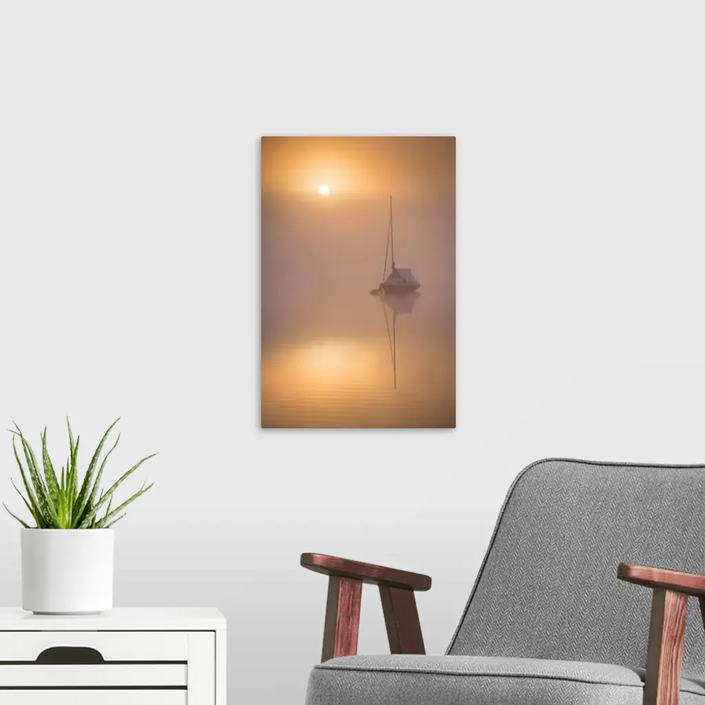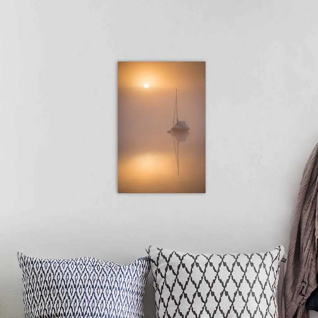 Sun Rising Over A Sailing Boat Moored On A Misty Wimbleball Lake, Exmoor National Park