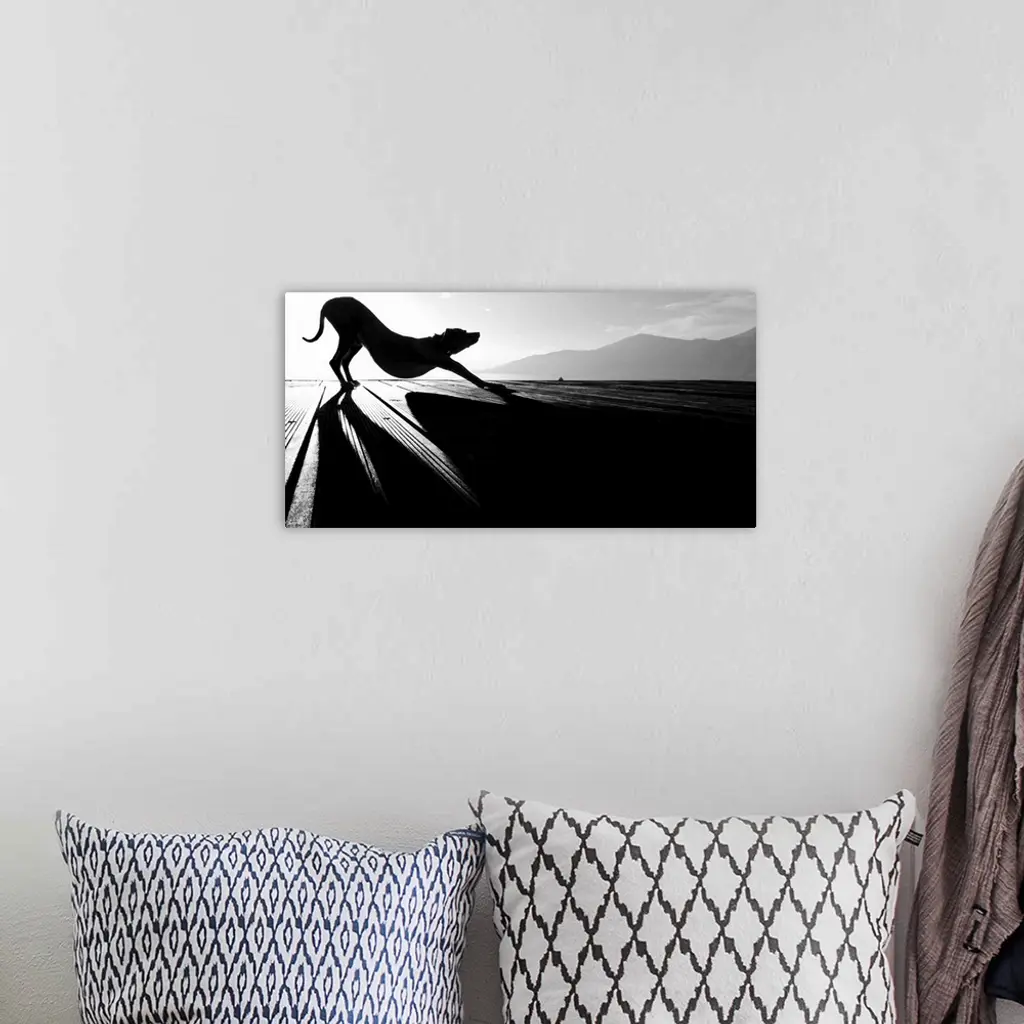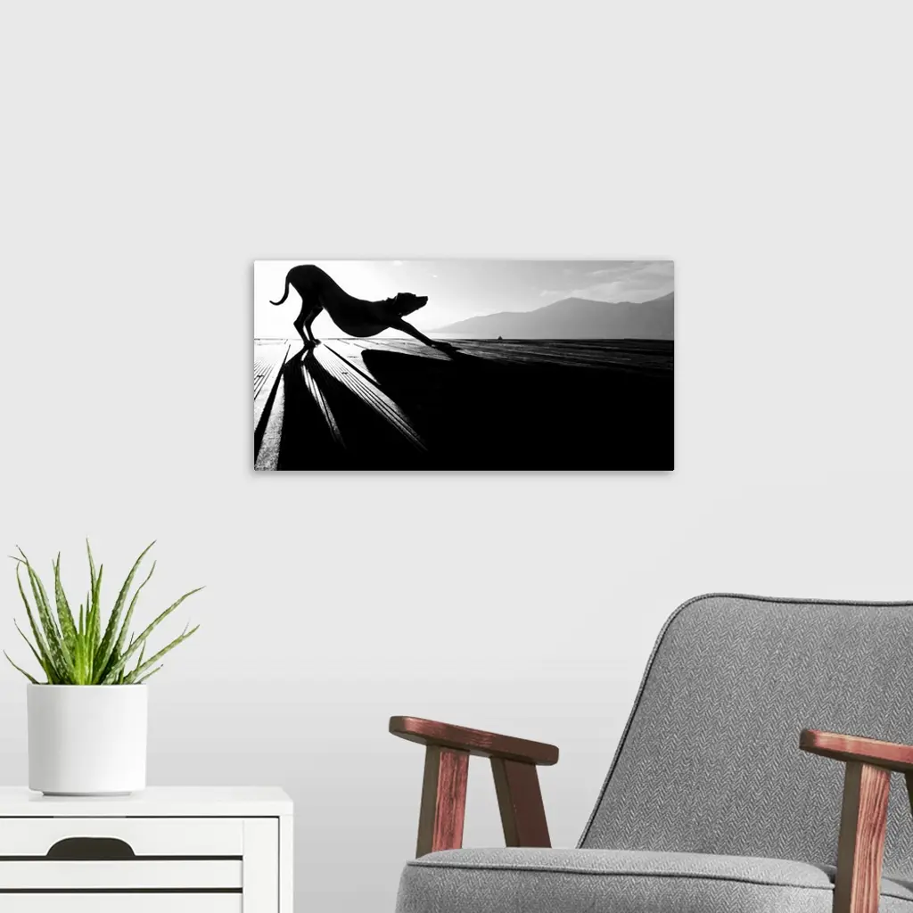 A dog stretching in the early morning, silhouetted by the rising sun.