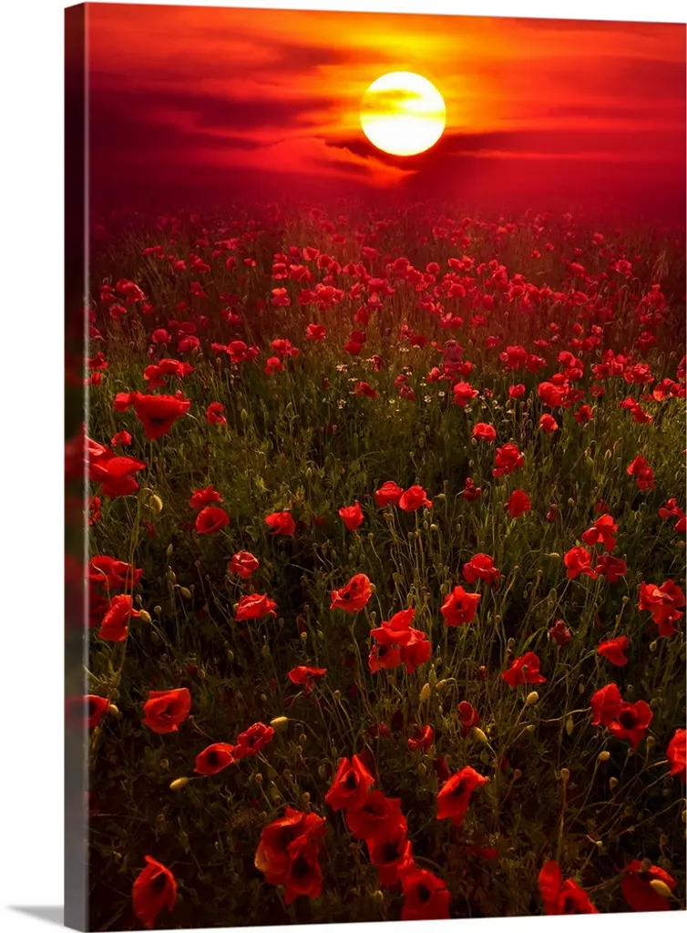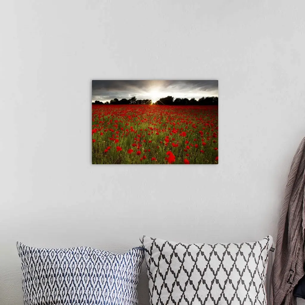 Sun sets over poppy field, sun showing burst of rays against stormy sky. wall art for home and office decor. Discover canvas art prints, photos, mural, big canvas art and framed wall art in GreatBigCanvas.com's varied collections.