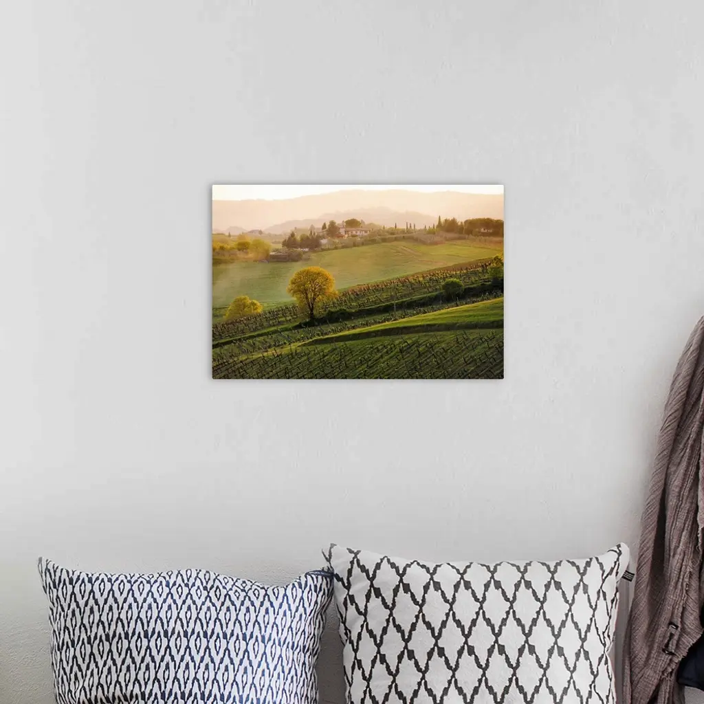 Landscape, oversized aerial photograph of a vineyard under a light mist, as the sun sets in Tuscany.