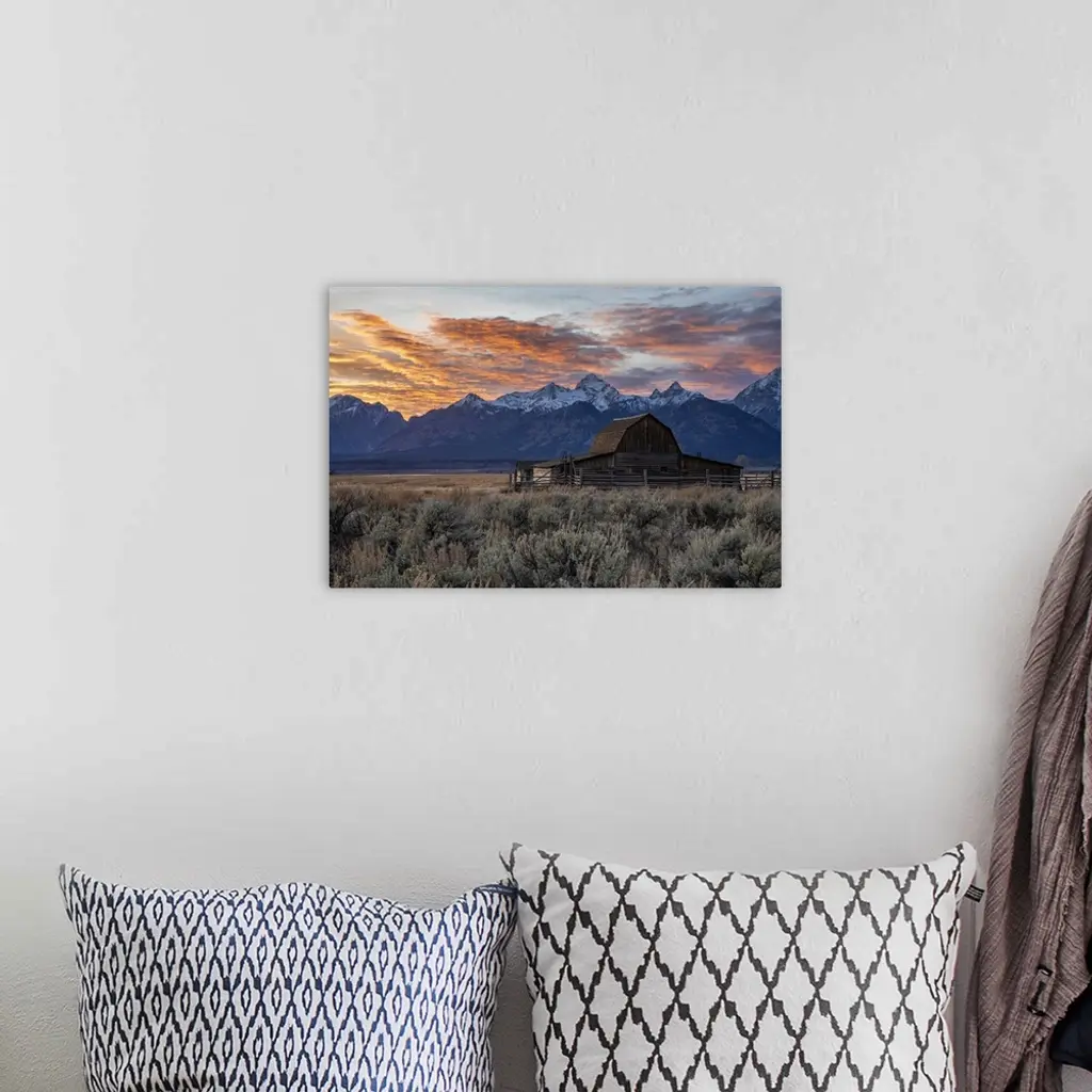 Sun setting over the Teton Range at Moulton Barn, Grand Teton National Park, Wyoming, United States of America, North America