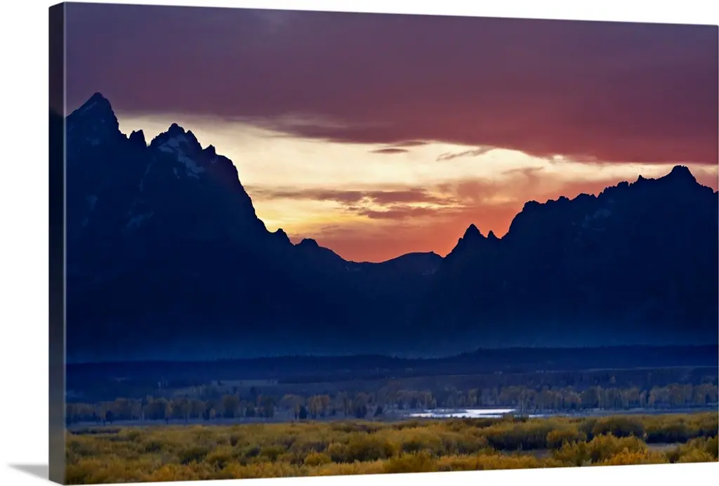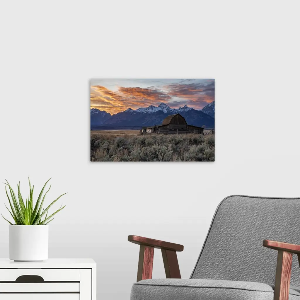 Sun Setting Over The Teton Range At Moulton Barn, Grand Teton National Park, Wyoming