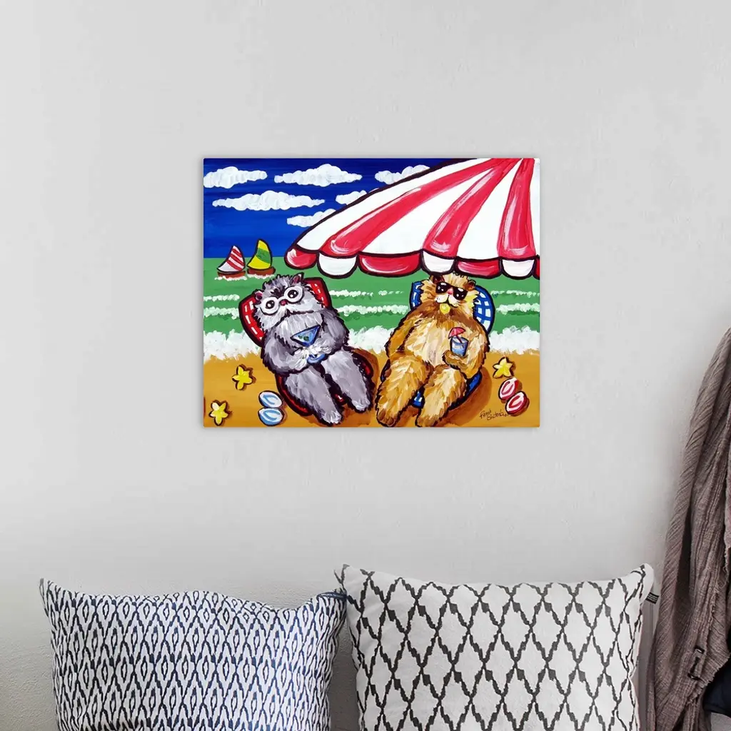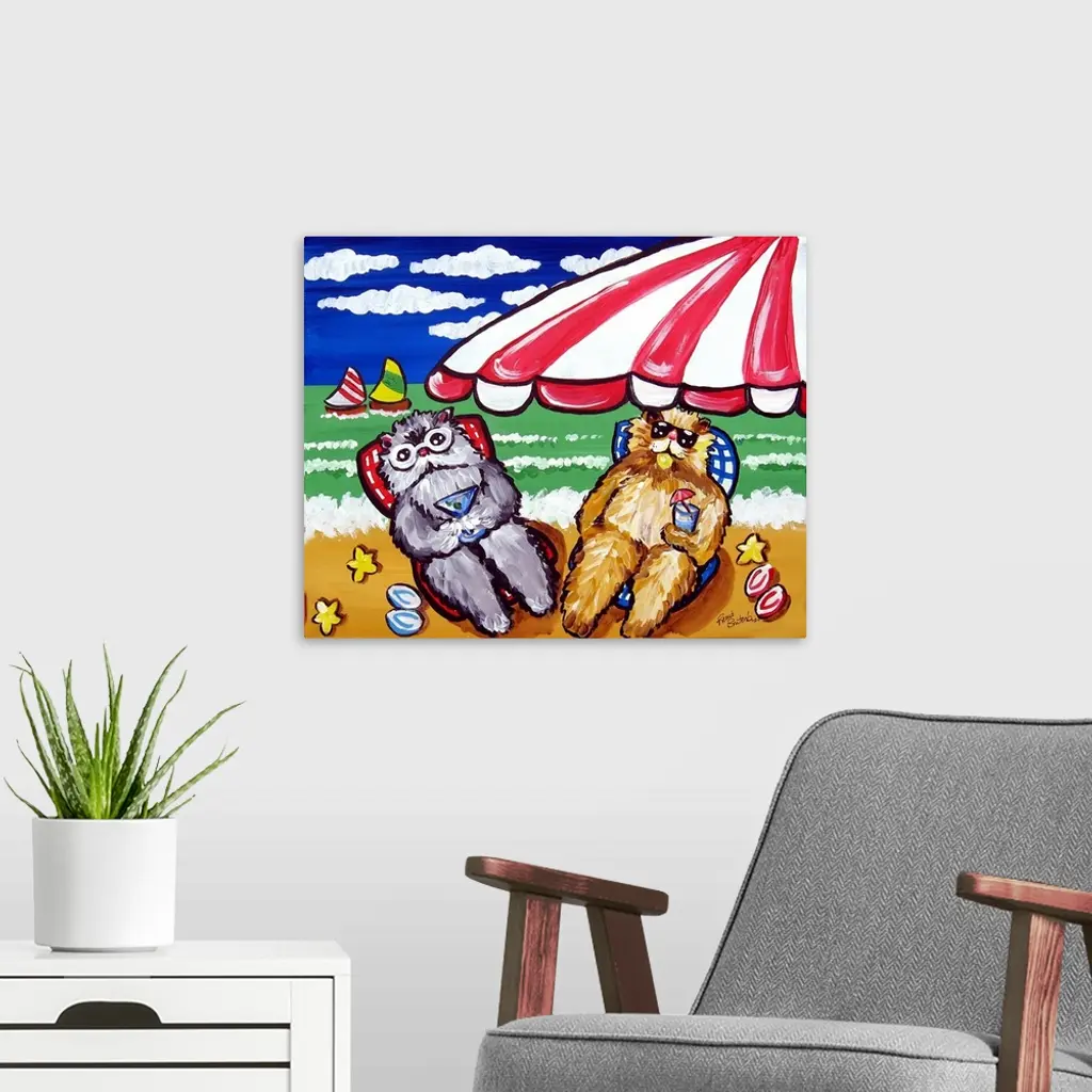 Two cats are catching some rays and sipping some tropical drinks. Fun beach scene.