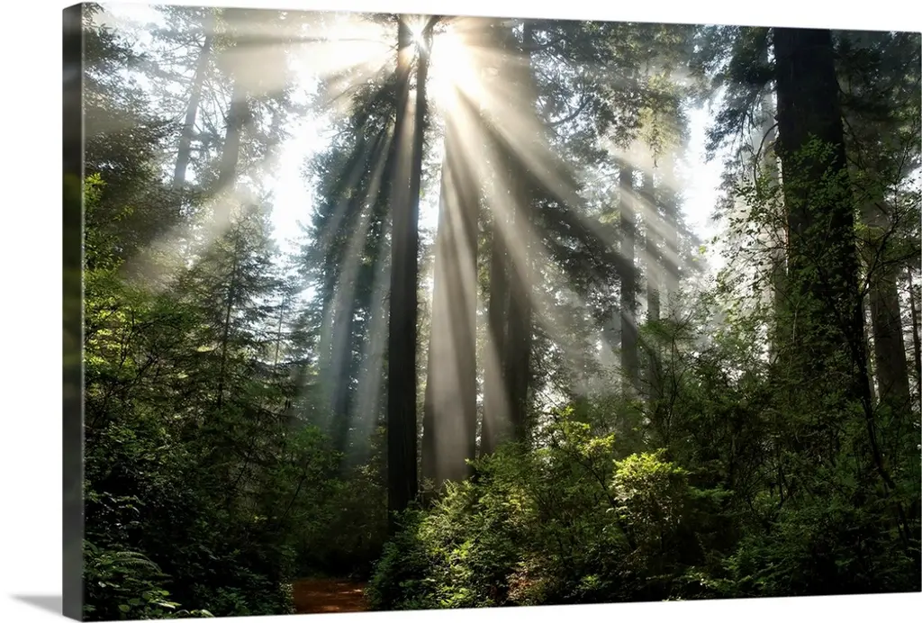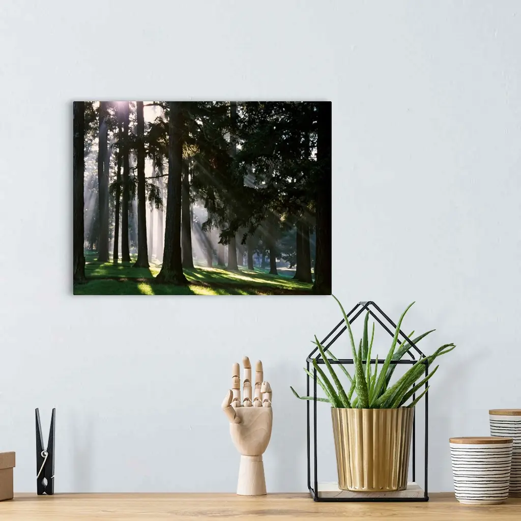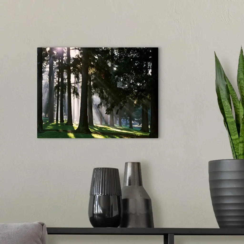 Light shining through tree trunks in a park in North West America in this landscape photograph.