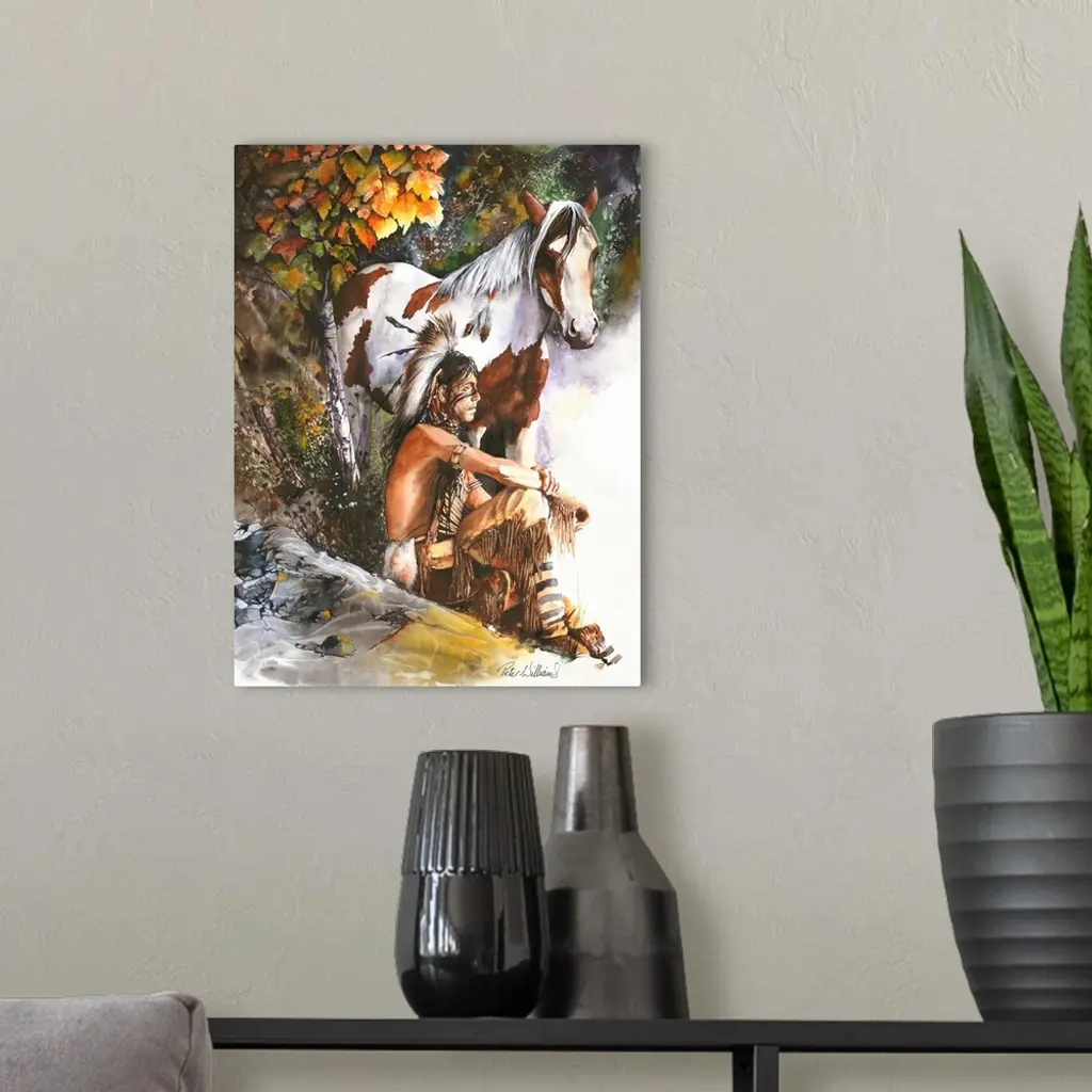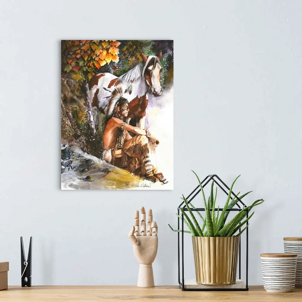 A native American Indian looks out at the rising sun, the warm mornings sun rays wash over him and his pony.