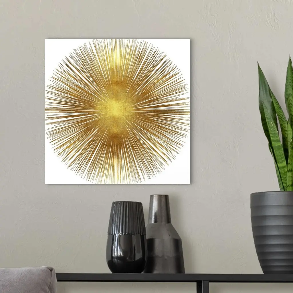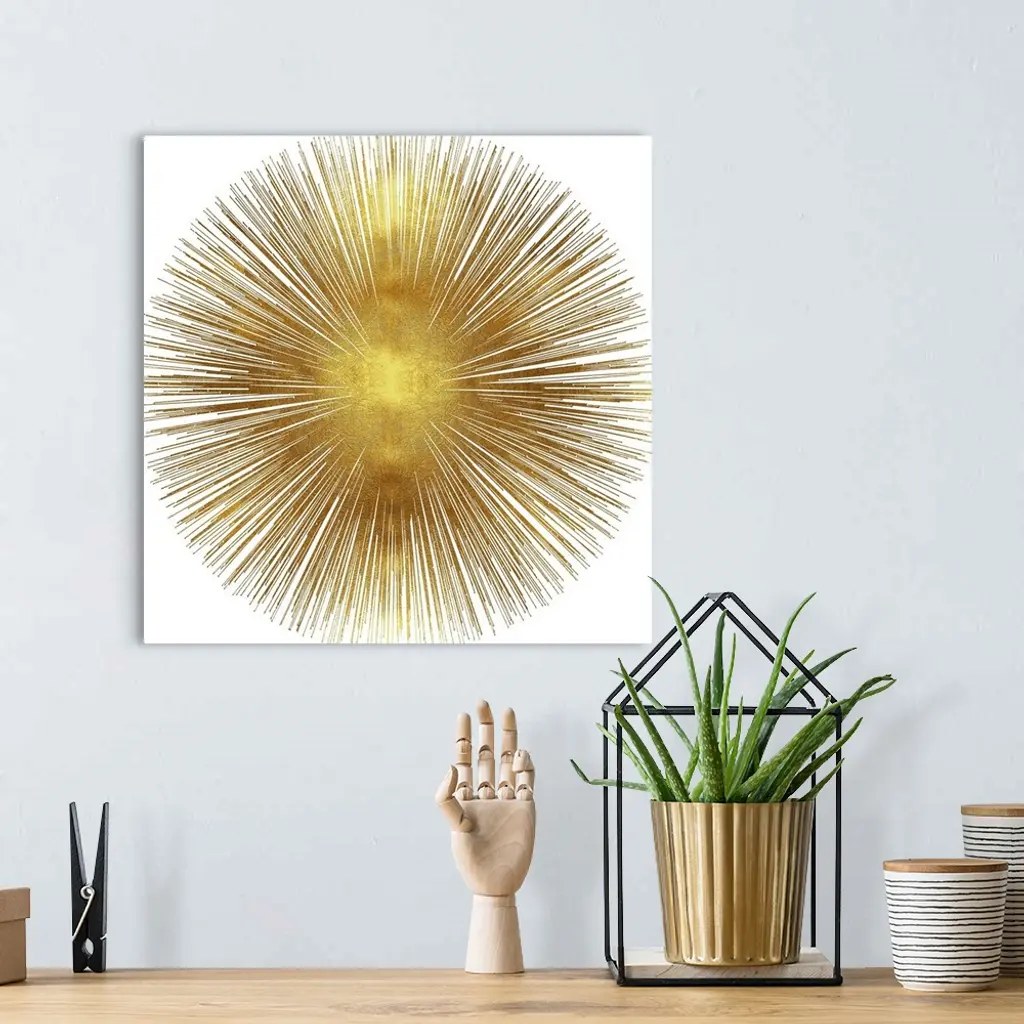 Square decor with a circular shape made out of thin gold lines angled out and disappearing into the dark gold center on a white background.
