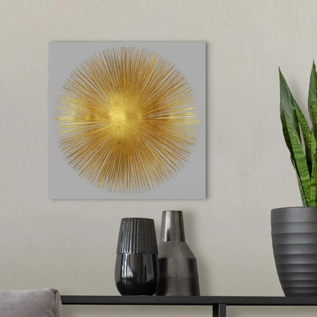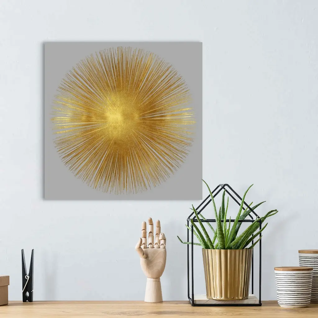 Square decor with a circular shape made out of thin gold lines angled out and disappearing into the dark gold center on a silver background.