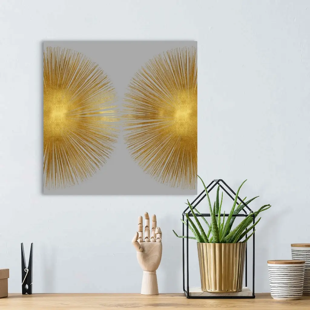 Square decor with two circular shapes made out of thin gold lines angled out and disappearing into the dark gold center on a silver background.