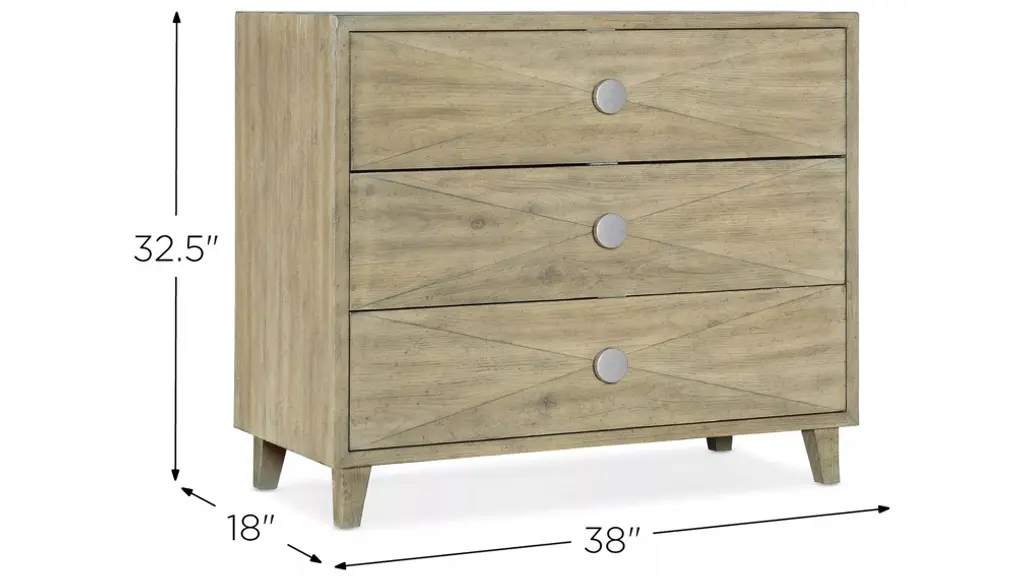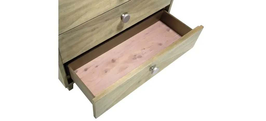 Inspired by the laid-back California coast and exuding a resort ambience, the Sundance Bachelor's Chest features 3 self-closing drawers with an inverted diamond design. Crafted of Pecan Veneers, Cedar and felt panel, the chest is finished in the light natural Driftwood finish with distressing including sandblasting and bleaching. Loaded with function, the chest has a FC707 3-plug outlet with USB port, a light underneath with a 3-intensity touch switch, a phone clip and a cedar-lined bottom drawer.