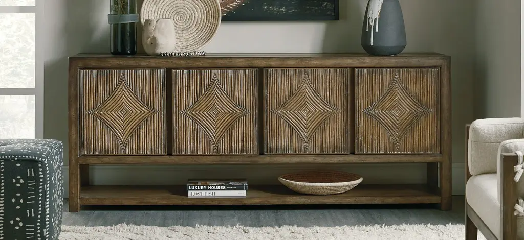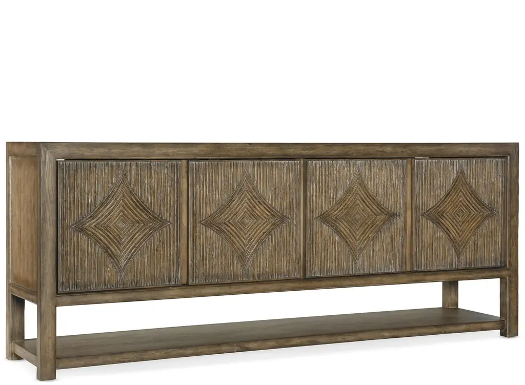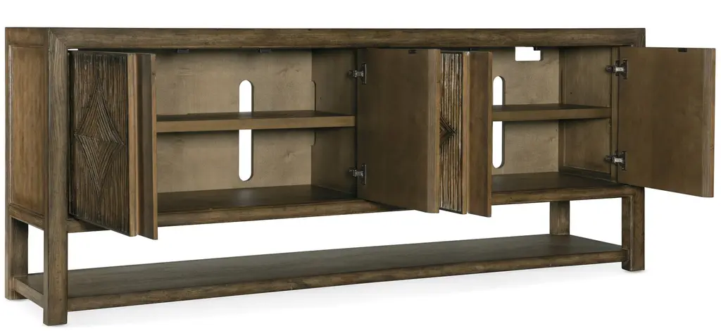 Inspired by the iconic Pacific Coast Highway, the Sundance Entertainment Console exudes character with four diamond-motif reeded front doors with soft-close hinges and touch latches. Crafted of pecan veneers with a solid wood edge top, the console has one adjustable vented wood shelf behind each pair of doors, a ventilated back panel and one 3-plug electrical outlet. The rich brown finish is Cliffside, featuring burnishing on the edges.