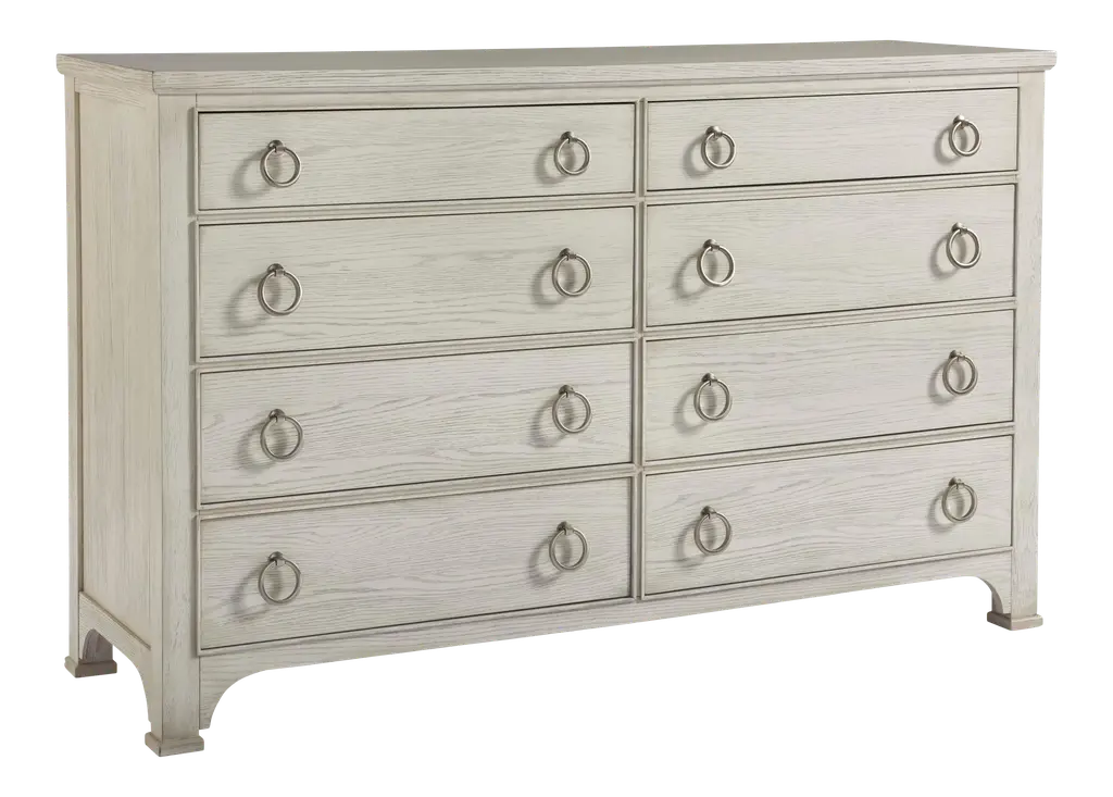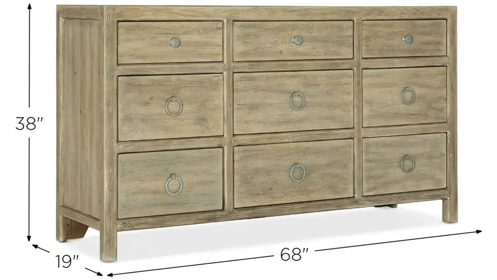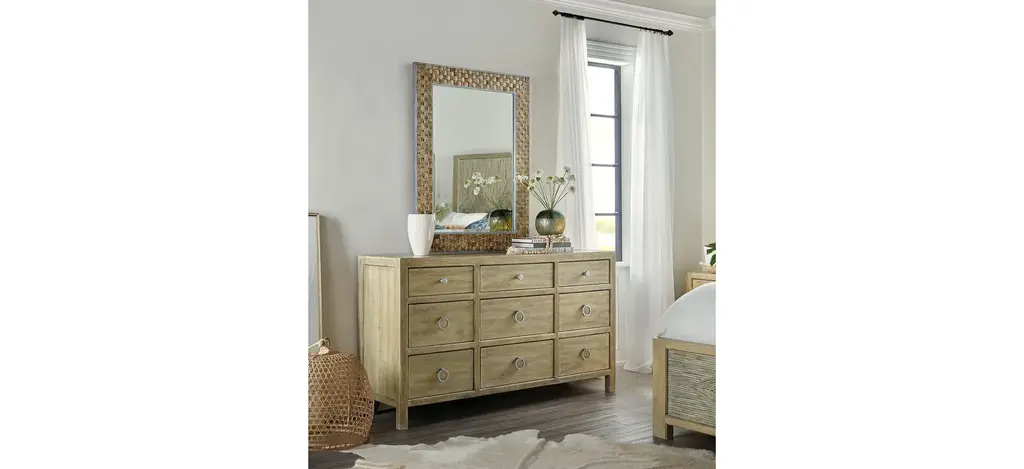 Inspired by the rugged, earthy and picturesque Malibu landscape, the Sundance Nine-Drawer Dresser offers a simple yet stylish silhouette crafted of Pecan Veneers and finished in the light natural Driftwood finish. Featuring nine self-closing drawers, the top left and top center drawers have removeable felt liners and the top right drawer has a removable felt jewelry tray. The 3 bottom drawers are cedar-lined.
