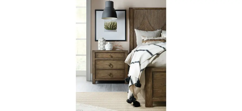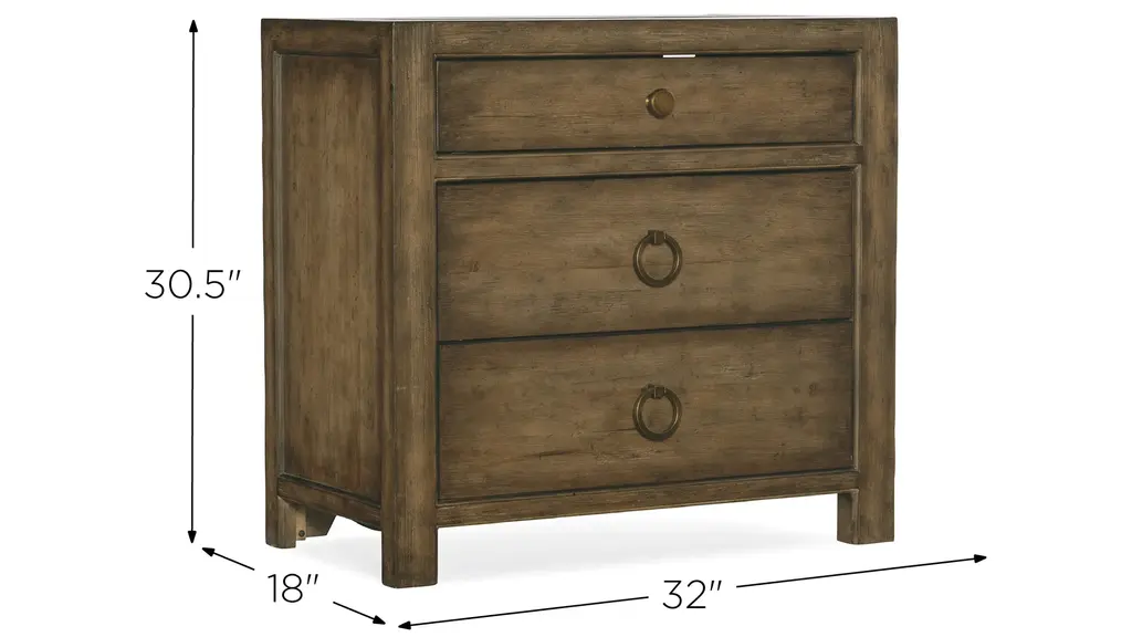 Inspired by the rugged, earthy and picturesque Malibu landscape, the Sundance Three-Drawer Nightstand offers a simple yet stylish silhouette crafted of Pecan Veneers and finished in the rich brown Cliffside finish with light burnishing on the edges. Featuring three self-closing drawers, the top drawer has a removable felt liner, and there's an FC707 three-plug outlet with USB port, phone clip and a light underneath the nightstand with three-intensity touch switch activation. Accented by antique bronze ring and knob pulls.