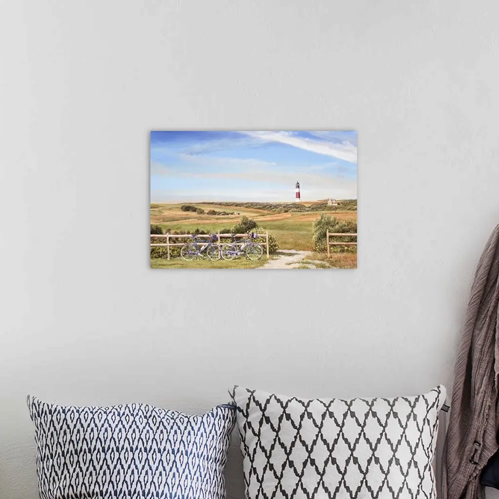 Two bicycles against a fence by a path with a field of grass, lighthouse and house.