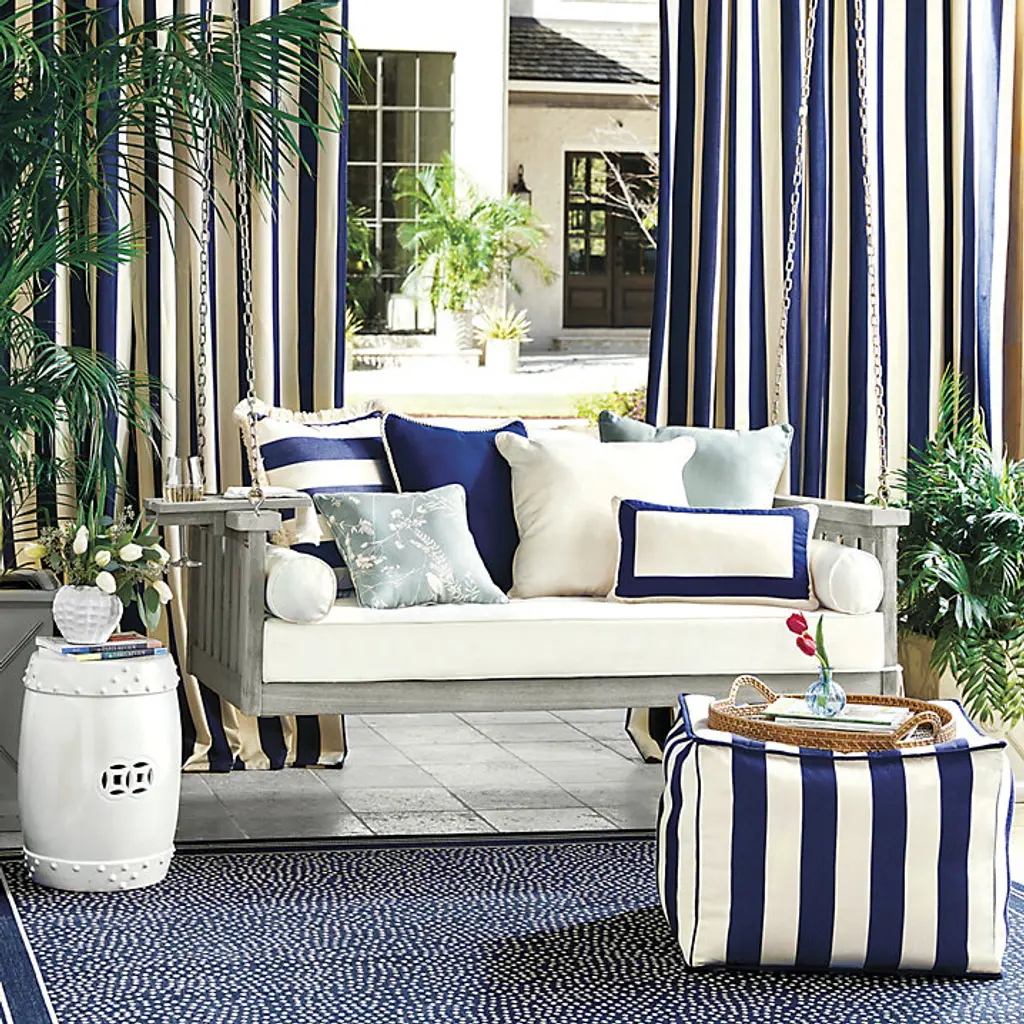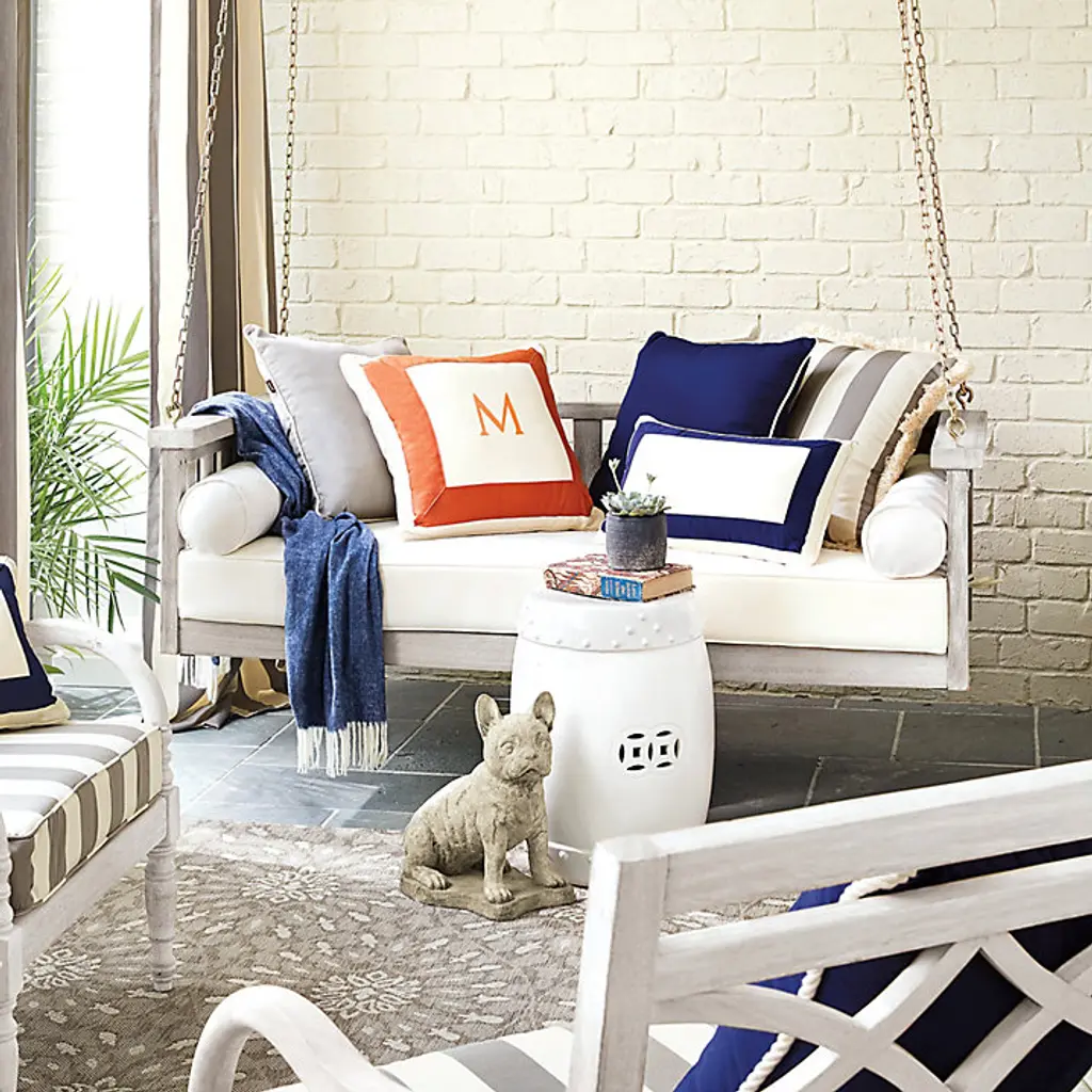 Dozing in a porch swing on a warm Sunday afternoon is our idea of heaven. This classic slat-rail swing is hand crafted of 100% FSC eucalyptus to be naturally moisture and insect resistant, and finished in a warm whitewash or graywash. Included cushions are covered in easy-care sand twill.Porch Swing features: Upgraded cushions sold separately