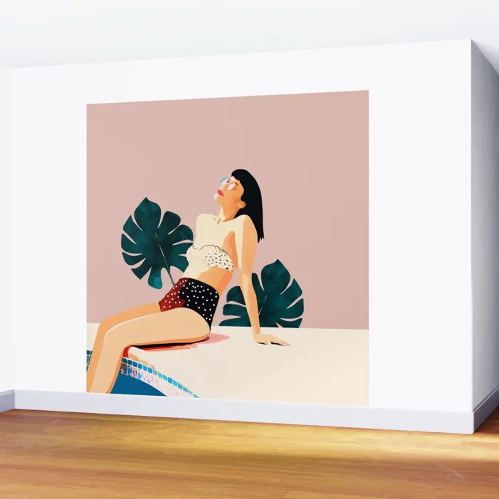 Sunday, Summer Swim Poolside Fashion, Bohemian Woman Sunbath Tan Bikini Monstera Tropical Travel Wall Mural